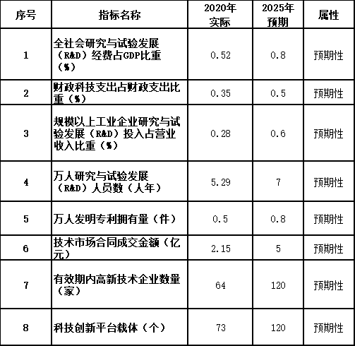 到2025年,自主(zhu)創(chuang)新(xin)體系(xi)更加完善,體制機制改革不斷深(shen)化(hua),科(ke)技型企業(ye)快速(su)發展,科(ke)技人才隊(dui)伍(wu)持續(xu)壯大(da),高(gao)新(xin)技術產業(ye)規模(mo)穩(wen)步增長(chang),科(ke)技創(chuang)新(xin)能(neng)力大(da)幅提升,創(chuang)新(xin)驅(qu)動(dong)發展成效顯著,國家創(chuang)新(xin)型城(cheng)市(shi)創(chuang)建成功。