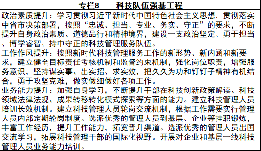 實施八大(da)工(gong)程:①創(chuang)新主體培育(yu)工(gong)程;②重點產(chan)業(ye)創(chuang)新工(gong)程;③創(chuang)新平臺提升工(gong)程;④科技成(cheng)果轉(zhuan)化工(gong)程;⑤鄉村振興支撐(cheng)工(gong)程;⑥科技人才引育(yu)工(gong)程;⑦科技金融(rong)融(rong)合(he)工(gong)程;⑧科技隊伍強基(ji)工(gong)程。