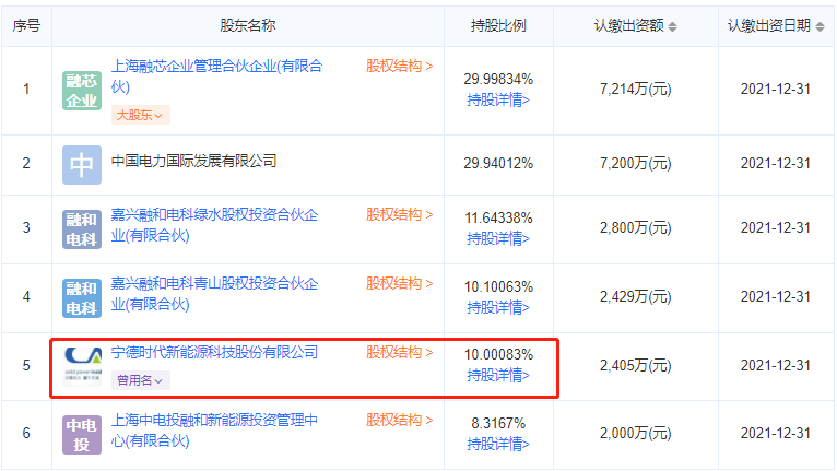 持股10%!寧德時代投資綜合智慧能源服務商啟源芯動力2月8日,上海啟源芯動力科技有限公司(下稱“啟源芯動力”)于1月28日發生工商變更,新增股東寧德時代,并且注冊資本增至約2.4億元。公開資料顯示,啟源芯動力是國家電力投資集團有限公司旗下專注“綠電交通”領域的綜合智慧能源服務商。 新增股東后,寧德時代,持股10%;中國電力國際發展有限公司持股比例從36%下降到29.94%,嘉興融和電科綠水股權投資合伙企業(有限合伙) 持股比例從14%下降到11.64%,上海中電投融和新能源投資管理中心(有限合伙)持股比例從10%下降到8.32%。 啟源芯動力成立于2020年,注冊資本約為2.4億元,法定代表人為賀徙,經營范圍包含節能管理服務;合同能源管理;機械設備租賃;汽車新車銷售;二手車經銷等。上海融芯企業管理合伙企業(有限合伙)為公司大股東,持股約30%。公開資料顯示,啟源芯動力是國家電力投資集團有限公司旗下專注“綠電交通”領域的綜合智慧能源服務商。 此前1月,寧德時代發布的業績預告稱,去年該公司凈利潤為140億-165億元間,同比增長150%-195%。這是寧德時代2018年上市以來的最高利潤水平。
