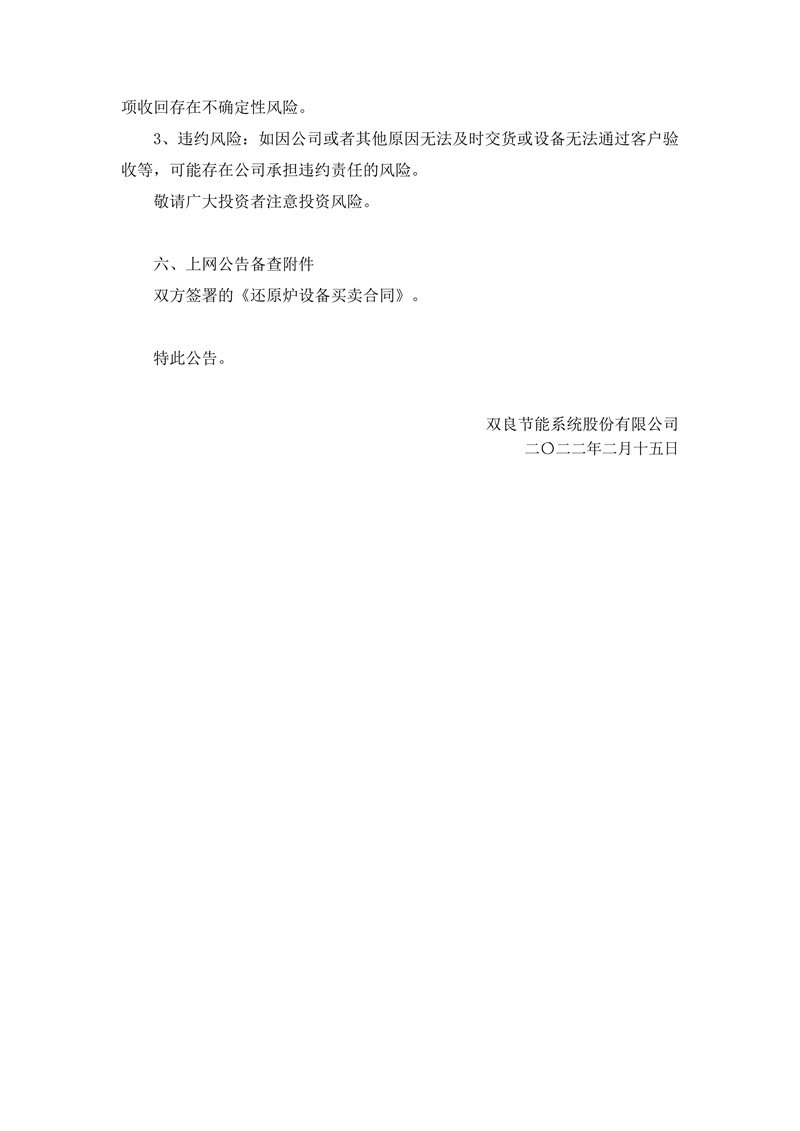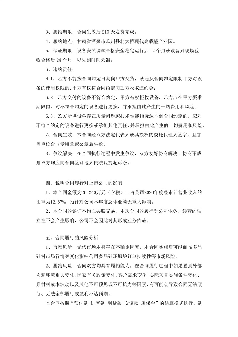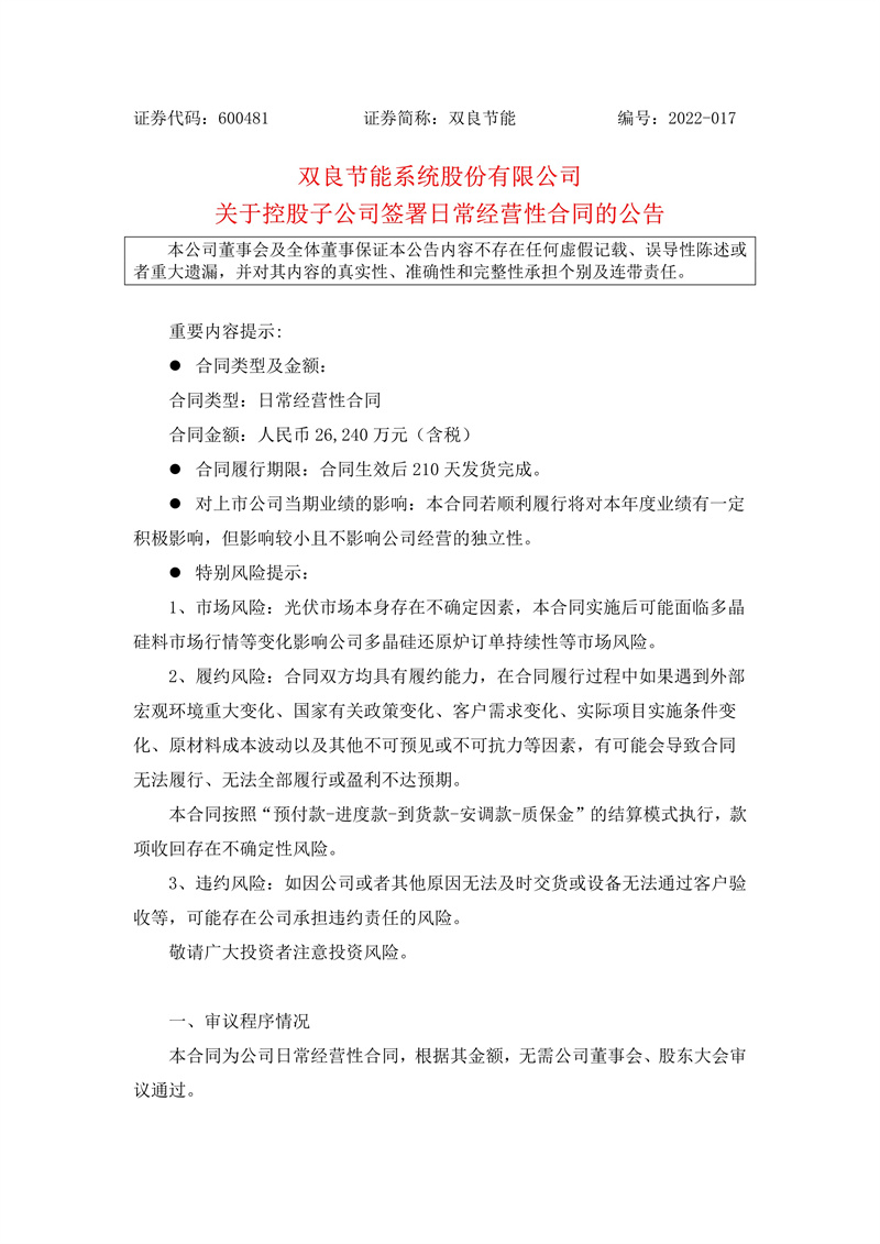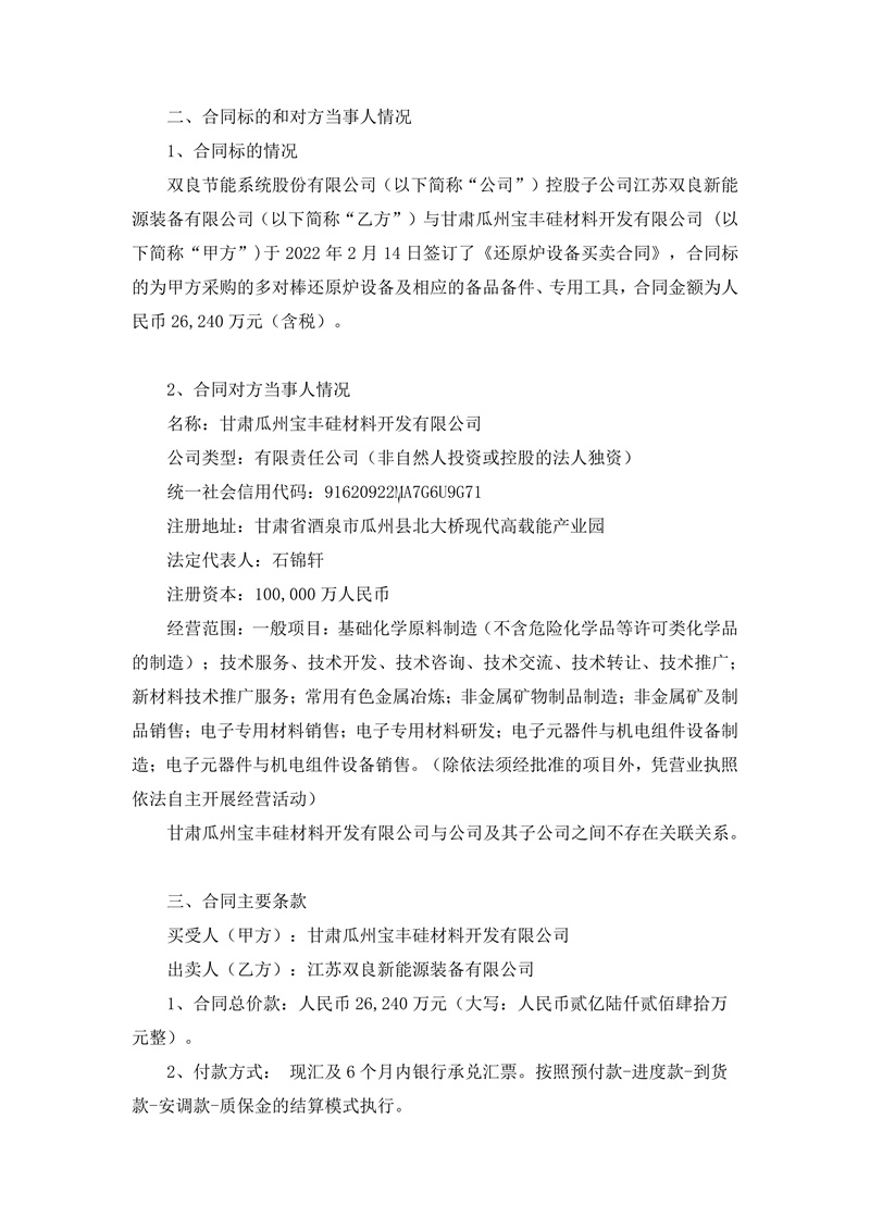 2月14日,雙良節能發布公告,公司控股子公司江蘇雙良新能源裝備有限公司(簡稱“乙方”)與甘肅瓜州寶豐硅材料開發有限公司(簡稱“甲方”)簽訂了《還原爐設備買賣合同》,合同標的為甲方采購的多對棒還原爐設備及相應的備品備件、專用工具,合同金額為人民幣2.62億元(含稅)。合同生效后210天發貨完成。
