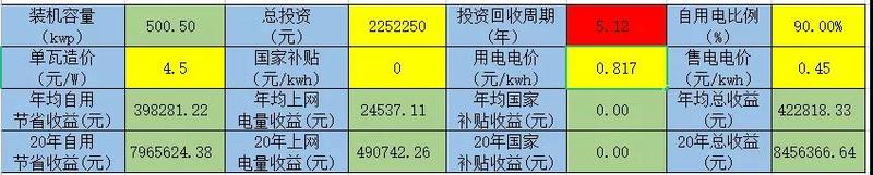 深圳市的(de)脫硫煤電(dian)(dian)價(jia)為每千瓦(wa)時0.453元,光伏電(dian)(dian)站賣(mai)給電(dian)(dian)網每度(du)電(dian)(dian)的(de)收益(yi)為0.453元。 2、深圳地區光伏電站建設(she) 根據(ju)深(shen)圳市常見的(de)工廠類(lei)型(xing),我(wo)們以500kW的(de)業主自(zi)投的(de)工商業光伏(fu)電站為(wei)例(li),光伏(fu)占(zhan)地(di)面積(ji)約為(wei)4000平方。電站設(she)計(ji)選用(yong)目前分(fen)布(bu)式市場比較(jiao)常用(yong)的(de)450W組(zu)件,組(zu)件轉(zhuan)化效(xiao)率為(wei)20.7%,組(zu)件電氣參數如下(xia)圖: