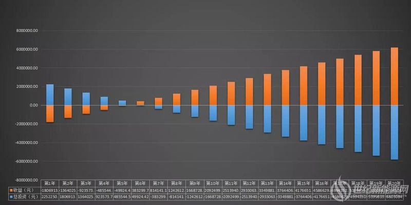 ▲25年每年發電(dian)量預測(ce) 該(gai)500kW電(dian)站,首年發(fa)電(dian)量(liang)約為(wei)59.3萬度,25年總發(fa)電(dian)量(liang)約1346萬度,平(ping)均每年發(fa)電(dian)量(liang)約為(wei)53.8萬度。 3、深(shen)圳地(di)區光伏(fu)電站收益(yi) 分(fen)布(bu)式光伏電(dian)站收(shou)益組成(cheng)為用電(dian)收(shou)益和賣電(dian)收(shou)益。用戶(hu)在(zai)用光伏的電(dian)時,就可以少交(jiao)(jiao)或不交(jiao)(jiao)電(dian)費(fei)。如果還有余(yu)電(dian)上網(wang),則以深圳(zhen)市上網(wang)電(dian)價(jia)0.453元/度(du)賣給(gei)電(dian)網(wang)產生賣電(dian)收(shou)益。 我們(men)以常見的自(zi)(zi)發自(zi)(zi)用(yong),余(yu)電(dian)(dian)上網模式(shi),按照500kW電(dian)(dian)站(zhan),發電(dian)(dian)量自(zi)(zi)用(yong)90%,余(yu)電(dian)(dian)10%賣電(dian)(dian)。據深圳市(shi)目(mu)前電(dian)(dian)價(jia)表格,我們(men)以深圳地(di)區大量工商業及其(qi)他用(yong)電(dian)(dian)電(dian)(dian)價(jia)(101-3000KVA)10千(qian)伏,每月每千(qian)伏安用(yong)電(dian)(dian)250kwh以上的峰(feng)平(ping)谷電(dian)(dian)價(jia)進行(xing)加(jia)權計(ji)算: 峰時段:9:00-11.30,14:00-16:30,19:00-21:00;平時段:7:00-9:00,11:30-14:00,16:30-19:00,21:00-23:00;谷時段:23:00-次(ci)日(ri)7:00。按照光伏只白天發電的特性,峰時段發電時間為(wei)4.5小時,平時段發電時間為(wei)7小時,谷時段視為(wei)不發電時段。 按(an)目前常用的峰平(ping)平(ping)均(jun)出力比例加權電(dian)價計算(suan)=(峰值電(dian)價1.032元(yuan)/kwh*4.5h+平(ping)值電(dian)價0.68元(yuan)/kwh*7h)/11.5h=0.817元(yuan)/kwh。整個電(dian)站的收(shou)益測算(suan)如下: