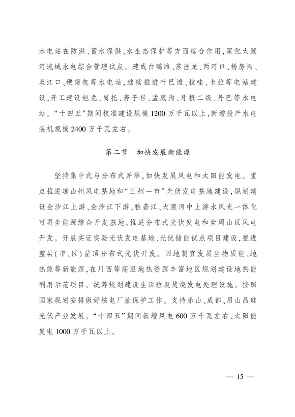 3月(yue)3日,四川省人民政府正式(shi)印(yin)發《四川省“十四五”能源發展規劃(hua)》,規劃(hua)要求2025年風(feng)電、光伏(fu)發電裝機容量分別達到(dao)1000萬千(qian)瓦、1200萬千(qian)瓦。其中,“十四五”期間新增風(feng)電600萬千(qian)瓦左右、太陽能發電1000萬千(qian)瓦以上。 堅持集中式(shi)與分(fen)布(bu)式(shi)并(bing)舉,加(jia)快發(fa)(fa)(fa)展風(feng)(feng)電(dian)(dian)(dian)(dian)和(he)太陽能發(fa)(fa)(fa)電(dian)(dian)(dian)(dian)。重(zhong)點推進涼山(shan)(shan)州風(feng)(feng)電(dian)(dian)(dian)(dian)基地(di)(di)(di)和(he)“三州一市(shi)”光(guang)(guang)伏(fu)(fu)發(fa)(fa)(fa)電(dian)(dian)(dian)(dian)基地(di)(di)(di)建設(she)(she),規劃(hua)建設(she)(she)金(jin)沙(sha)江上(shang)游(you)、金(jin)沙(sha)江下游(you)、雅(ya)礱江、大渡(du)河中上(shang)游(you)水風(feng)(feng)光(guang)(guang)一體(ti)化可再生(sheng)能源(yuan)綜合開發(fa)(fa)(fa)基地(di)(di)(di),推進分(fen)布(bu)式(shi)光(guang)(guang)伏(fu)(fu)發(fa)(fa)(fa)電(dian)(dian)(dian)(dian)和(he)盆周山(shan)(shan)區(qu)風(feng)(feng)電(dian)(dian)(dian)(dian)開發(fa)(fa)(fa)。開展實證(zheng)實驗光(guang)(guang)伏(fu)(fu)發(fa)(fa)(fa)電(dian)(dian)(dian)(dian)基地(di)(di)(di)、光(guang)(guang)伏(fu)(fu)儲能試點項(xiang)(xiang)目建設(she)(she),推進整(zheng)縣(市(shi)、區(qu))屋頂分(fen)布(bu)式(shi)光(guang)(guang)伏(fu)(fu)開發(fa)(fa)(fa)。因地(di)(di)(di)制宜(yi)發(fa)(fa)(fa)展生(sheng)物質能、地(di)(di)(di)熱(re)能等(deng)新(xin)能源(yuan),在川西等(deng)高溫地(di)(di)(di)熱(re)資(zi)源(yuan)豐(feng)富地(di)(di)(di)區(qu)規劃(hua)建設(she)(she)地(di)(di)(di)熱(re)能利用示范項(xiang)(xiang)目。統籌規劃(hua)建設(she)(she)生(sheng)活垃圾焚(fen)燒發(fa)(fa)(fa)電(dian)(dian)(dian)(dian)處理設(she)(she)施。按照國家規劃(hua)安排(pai)做好核(he)電(dian)(dian)(dian)(dian)廠(chang)址(zhi)保護工作。支持樂(le)山(shan)(shan)、成都、眉山(shan)(shan)晶硅光(guang)(guang)伏(fu)(fu)產業發(fa)(fa)(fa)展。“十(shi)四五”期間新(xin)增風(feng)(feng)電(dian)(dian)(dian)(dian)600萬(wan)千(qian)瓦(wa)左右、太陽能發(fa)(fa)(fa)電(dian)(dian)(dian)(dian)1000萬(wan)千(qian)瓦(wa)以(yi)上(shang)。 光(guang)伏(fu)重點推進項目包括:攀(pan)枝花市(shi)洼落、新九、仁和、米易4個片區,阿壩州(zhou)北(bei)部(bu)(bu)、中部(bu)(bu)、西北(bei)部(bu)(bu)、西南(nan)部(bu)(bu)4個基(ji)地,甘孜州(zhou)北(bei)部(bu)(bu)、中部(bu)(bu)、南(nan)部(bu)(bu)3個基(ji)地,涼(liang)山州(zhou)西部(bu)(bu)、南(nan)部(bu)(bu)、西北(bei)部(bu)(bu)、東(dong)部(bu)(bu)4個基(ji)地等(deng)“三州(zhou)一市(shi)”大型光(guang)伏(fu)發電(dian)基(ji)地建設。 風電(dian)(dian)重點(dian)推進項目包括:建成西昌牦牛山、鹽(yan)源大(da)壩、會(hui)東淌塘、寧南果(guo)木、普格則洛日(ri)、德昌臘巴山、布拖海(hai)博、昭覺補(bu)約、雷波阿(a)合哈洛、美(mei)姑沙(sha)馬乃拖、廣元(yuan)劍(jian)閣、昭化白果(guo)等風電(dian)(dian)項目。并研發超大(da)功(gong)率陸(lu)上(shang)風電(dian)(dian)機組(zu)、大(da)功(gong)率海(hai)上(shang)風電(dian)(dian)機組(zu)、漂浮式海(hai)上(shang)風電(dian)(dian)機組(zu)、超高海(hai)拔(ba)(5000米以上(shang))風電(dian)(dian)機組(zu)。 分布(bu)式(shi)(shi)能源(yuan)(yuan)(yuan)方面:穩步推(tui)進戶用光伏發電(dian)建設,推(tui)動(dong)分布(bu)式(shi)(shi)能源(yuan)(yuan)(yuan)發展和鄉村振興有(you)效銜(xian)接。創新分布(bu)式(shi)(shi)能源(yuan)(yuan)(yuan)發展機制,完善分布(bu)式(shi)(shi)能源(yuan)(yuan)(yuan)市場化交易政(zheng)策,推(tui)進分布(bu)式(shi)(shi)能源(yuan)(yuan)(yuan)公(gong)平(ping)接入,鼓(gu)勵多種市場主(zhu)體探索分布(bu)式(shi)(shi)能源(yuan)(yuan)(yuan)商業運作模式(shi)(shi)。 全文如下: 四川省人民政府 關于印發《四川省“十四五”能源發展規劃》的通知 川府發〔2022〕8號 各(ge)(ge)市(州(zhou))人民政府,省(sheng)政府各(ge)(ge)部門、各(ge)(ge)直屬機構,有(you)關(guan)單位: 現將《四川省“十四五”能源發展規劃》印(yin)發給你們(men),請認真組織實(shi)施。 四川省人民(min)政(zheng)府 2022年3月(yue)3日