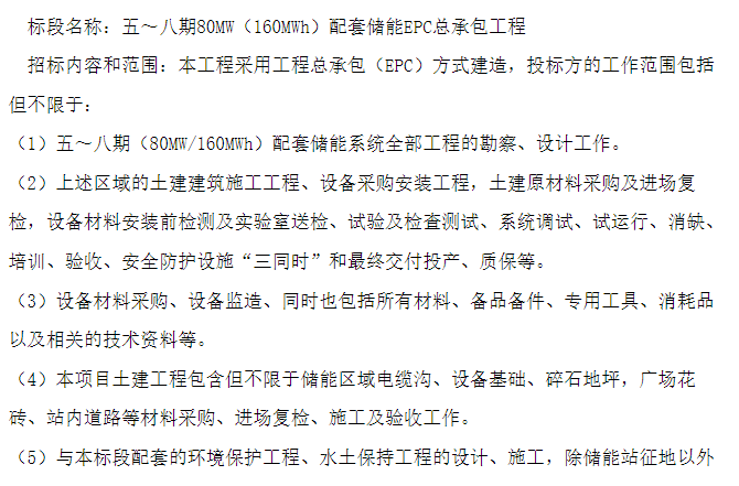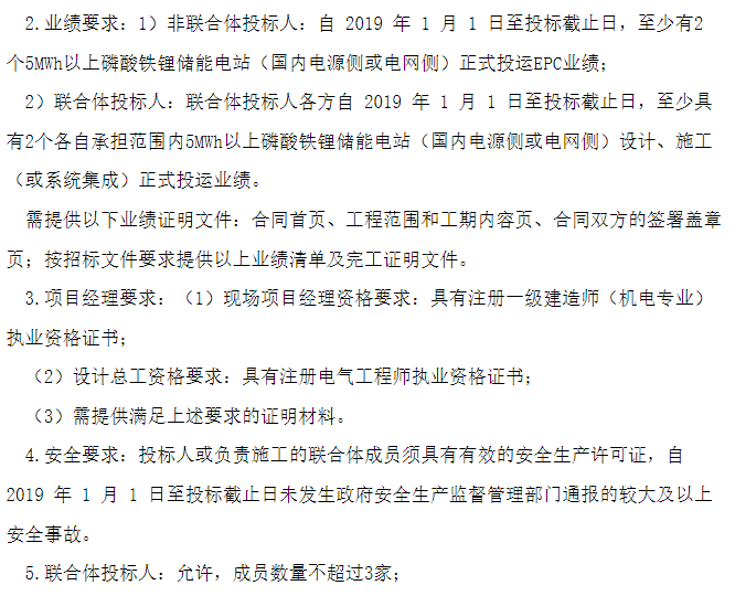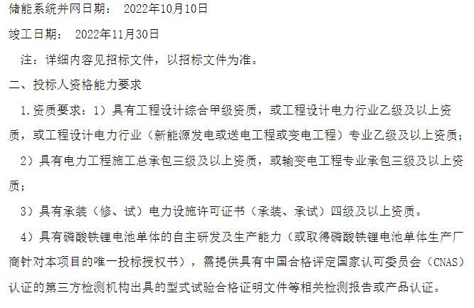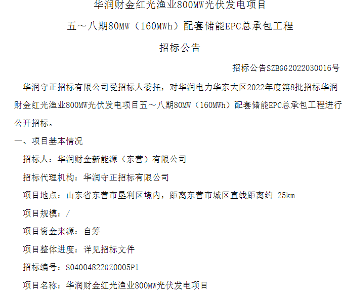 80MW/160MWh!華潤財金光伏發電項目配套儲能EPC招標3月4日(ri),華潤財金(jin)新能(neng)源(東營)有限公司發(fa)布華潤財金(jin)紅光漁(yu)業800MW光伏發(fa)電項目五(wu)~八期(qi)80MW(160MWh)配套(tao)儲(chu)能(neng)EPC總承包工程招標(biao)公告(gao)。招標(biao)中提(ti)出要求非聯合體投(tou)(tou)標(biao)人自2019年1月1日(ri)至投(tou)(tou)標(biao)截止日(ri),至少有2個5MWh以上磷酸鐵鋰儲(chu)能(neng)電站(國內電源側或電網側)正式(shi)投(tou)(tou)運EPC業績。 聯合體投標(biao)人各方自2019年(nian)1月1日至投標(biao)截(jie)止日,至少(shao)具有2個各自承(cheng)擔范圍內(nei)5MWh以上(shang)磷酸鐵鋰儲能電站(國內(nei)電源側或電網(wang)側)設計、施(shi)工(gong)(或系統集成)正式投運業績。 原文如(ru)下(xia):