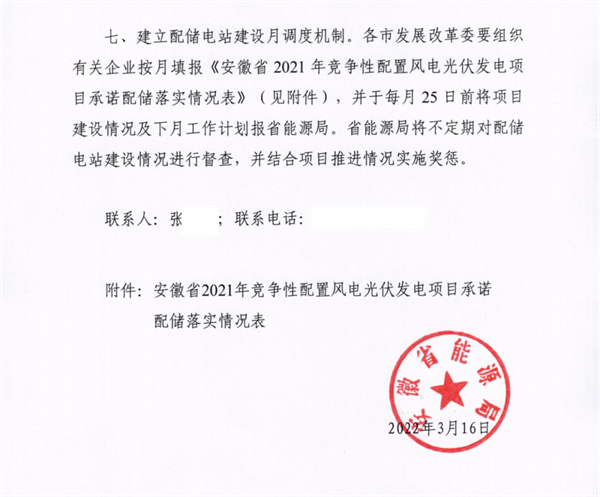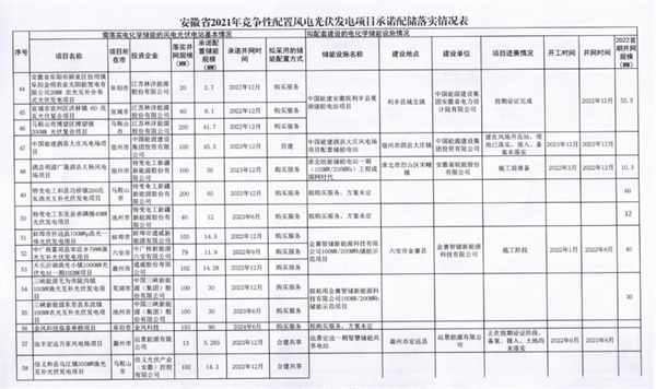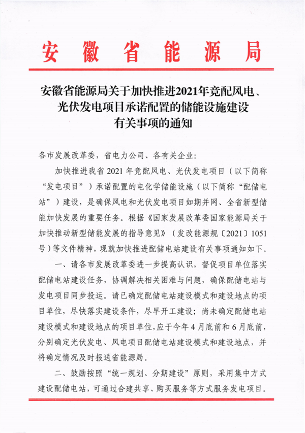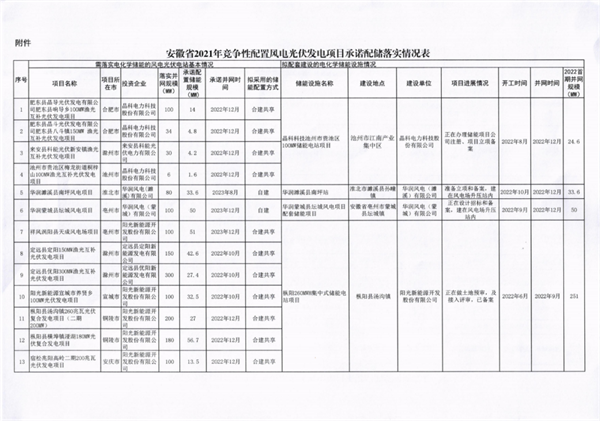 3月16日,安徽省能源局發布了《關于加快推進2021年競配風電、光伏發電項目承諾配置的儲能設施建設有關事項的通知》。 要求加快(kuai)推進(jin)全省2021年(nian)競配(pei)風電(dian)、光伏發(fa)電(dian)項目(mu)(mu)(以下簡(jian)(jian)稱“發(fa)電(dian)項目(mu)(mu)”)承(cheng)諾配(pei)置(zhi)的電(dian)化學儲(chu)能設(she)施(shi)(以下簡(jian)(jian)稱“配(pei)儲(chu)電(dian)站”)建(jian)設(she),是確保風電(dian)和光伏發(fa)電(dian)項目(mu)(mu)如期并(bing)網、全省新型儲(chu)能加快(kuai)發(fa)展的重要任務,并(bing)就(jiu)加快(kuai)推進(jin)配(pei)儲(chu)電(dian)站建(jian)設(she)有關事項通知。 據悉,此次(ci)安(an)徽省2021年(nian)競爭性配置風(feng)(feng)(feng)電(dian)、光伏(fu)(fu)落實并網(wang)的發電(dian)項目共(gong)有5.496GW,其中光伏(fu)(fu)4.23GW,風(feng)(feng)(feng)電(dian)1.266GW。所有項目要求配儲(chu),規模(mo)約1.56GW。根(gen)據光伏(fu)(fu)們統計的風(feng)(feng)(feng)光并網(wang)規模(mo)來看,陽光新能(neng)(neng)源(yuan)以1.13GW風(feng)(feng)(feng)光,250.7MW儲(chu)能(neng)(neng)位列第一(yi),隨后是國(guo)家電(dian)投705MW風(feng)(feng)(feng)光,儲(chu)能(neng)(neng)173.4MW;中廣核(he)500MW風(feng)(feng)(feng)光、儲(chu)能(neng)(neng)97.05MW;以及國(guo)家能(neng)(neng)源(yuan)集團、三峽等緊隨其后。具(ju)體如下(xia): 根據(ju)文件顯示,安徽省(sheng)能(neng)源(yuan)局(ju)要求各(ge)市發展改革委督促(cu)項(xiang)(xiang)(xiang)(xiang)目(mu)單位落實配(pei)儲(chu)電(dian)站(zhan)(zhan)建(jian)設(she)(she)(she)任務,協調解決相關困難與(yu)(yu)問題,確保配(pei)儲(chu)電(dian)站(zhan)(zhan)與(yu)(yu)發電(dian)項(xiang)(xiang)(xiang)(xiang)目(mu)同步(bu)投運。請已確定(ding)配(pei)儲(chu)電(dian)站(zhan)(zhan)建(jian)設(she)(she)(she)模式(shi)(shi)和(he)建(jian)設(she)(she)(she)地點(dian)的項(xiang)(xiang)(xiang)(xiang)目(mu)單位,盡(jin)快落實建(jian)設(she)(she)(she)條(tiao)件,盡(jin)早(zao)開工建(jian)設(she)(she)(she);尚未確定(ding)配(pei)儲(chu)電(dian)站(zhan)(zhan)建(jian)設(she)(she)(she)模式(shi)(shi)和(he)建(jian)設(she)(she)(she)地點(dian)的項(xiang)(xiang)(xiang)(xiang)目(mu)單位,應于今年(nian)4月(yue)底前和(he)6月(yue)底前,分(fen)別確定(ding)光伏發電(dian)、風電(dian)項(xiang)(xiang)(xiang)(xiang)目(mu)配(pei)儲(chu)電(dian)站(zhan)(zhan)建(jian)設(she)(she)(she)模式(shi)(shi)和(he)建(jian)設(she)(she)(she)地點(dian),并將確定(ding)情況及時報送省(sheng)能(neng)源(yuan)局(ju)。 鼓勵按(an)照“統一(yi)規劃(hua)、分期(qi)建(jian)(jian)設(she)”原則,釆用集中方式建(jian)(jian)設(she)配儲(chu)電站,可通(tong)過合建(jian)(jian)共享(xiang)、購買服(fu)(fu)務(wu)等方式服(fu)(fu)務(wu)發(fa)電項目。 相(xiang)關市縣(xian)發展改革委要積極組(zu)織對接(jie),促進相(xiang)關企業盡早達成(cheng)合作意向(xiang)、簽訂租(zu)賃(lin)協議(yi),并(bing)將租(zu)賃(lin)協議(yi)及時報送(song)省(sheng)能源局和省(sheng)電力(li)公司備案。 配儲電站項目(mu)(mu)按照屬地原則實(shi)行(xing)備案(an)管(guan)理(li)。備案(an)內(nei)容應包括(kuo):項目(mu)(mu)單位基本情(qing)況,項目(mu)(mu)名稱、建(jian)設(she)(she)地點、建(jian)設(she)(she)規模、總投資額、建(jian)設(she)(she)內(nei)容(含(han)技(ji)術路線、應用(yong)場(chang)景、主要功能(neng)(neng)、技(ji)術標準、環保安(an)全等),項目(mu)(mu)符合(he)產業政策聲明等。項目(mu)(mu)備案(an)情(qing)況應分別報送安(an)徽省能(neng)(neng)源局(ju)和(he)華東能(neng)(neng)源監管(guan)局(ju)。 配儲電(dian)站(zhan)建(jian)設應(ying)(ying)符合(he)相(xiang)(xiang)(xiang)關管理規定(ding)和標(biao)準規范要(yao)(yao)求,承擔項目設計、咨詢、施工和監理的單位(wei)應(ying)(ying)具(ju)有國家規定(ding)的相(xiang)(xiang)(xiang)應(ying)(ying)資(zi)質,主要(yao)(yao)設備應(ying)(ying)通過(guo)具(ju)有相(xiang)(xiang)(xiang)應(ying)(ying)資(zi)質機構的檢測認證,涉網(wang)設備應(ying)(ying)符合(he)電(dian)網(wang)安全運行相(xiang)(xiang)(xiang)關技術(shu)要(yao)(yao)求。不得采用(yong)動(dong)力電(dian)池梯級利用(yong)方(fang)式建(jian)設配儲電(dian)站(zhan)。 配(pei)儲(chu)電(dian)站項(xiang)目(mu)業主(zhu)(zhu)單位是配(pei)儲(chu)電(dian)站安(an)全生(sheng)(sheng)產責任主(zhu)(zhu)體,應按照有關法(fa)律法(fa)規(gui)和技(ji)術規(gui)范要求,嚴格履行項(xiang)目(mu)安(an)全、消防環保等管(guan)理程序,相關市縣發(fa)展改革委要會同(tong)相關部(bu)門督促指導企業落實安(an)全生(sheng)(sheng)產主(zhu)(zhu)體責任。 電網(wang)企(qi)業應(ying)按(an)照“積極服務、簡捷高(gao)效(xiao)(xiao)”的原則,建立和完善(shan)配置電化學儲能項目接(jie)網(wang)程序,公(gong)平無歧視向已經備案的項目提供接(jie)網(wang)服務。在項目運(yun)行(xing)上,應(ying)按(an)照法(fa)律法(fa)規和技術(shu)規范要求,指(zhi)導(dao)配儲電站企(qi)業做好調(diao)(diao)度對接(jie),完善(shan)調(diao)(diao)度運(yun)行(xing)機制,提高(gao)運(yun)行(xing)效(xiao)(xiao)率(lv)。