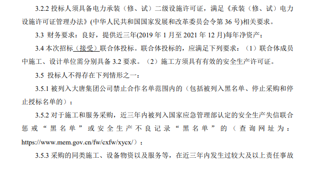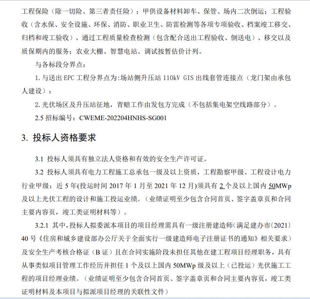大唐萬寧和山70MW農業光伏儲能電站項目招標4月(yue)(yue)10日(ri)大(da)唐萬寧(ning)和(he)山70MW 農業光(guang)(guang)伏(fu)(fu)儲能電(dian)站項目發布招標(biao)公(gong)告(gao)。公(gong)告(gao)披露招標(biao)范圍(wei)包括但不限于光(guang)(guang)伏(fu)(fu)場區、場內(nei)集(ji)電(dian)線路(含地塊之間 35kV 連(lian)接線路)、儲能系統(tong)、充(chong)電(dian)樁等。公(gong)告(gao)要求投(tou)標(biao)人須(xu)具(ju)(ju)有(you)電(dian)力工(gong)(gong)程施(shi)工(gong)(gong)總承包一(yi)級及(ji)以(yi)上資(zi)質,工(gong)(gong)程勘察甲(jia)(jia)級、工(gong)(gong)程設計電(dian)力 行業甲(jia)(jia)級;近 5 年(投(tou)運時間 2017 年 1 月(yue)(yue)至 2021 年 12 月(yue)(yue))須(xu)具(ju)(ju)有(you) 2 個及(ji)以(yi)上國內(nei) 50MWp 及(ji)以(yi)上光(guang)(guang)伏(fu)(fu)工(gong)(gong)程的(de)設計和(he)施(shi)工(gong)(gong)投(tou)運業績。公(gong)告(gao)具(ju)(ju)體要求如下(xia):