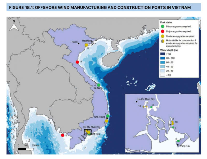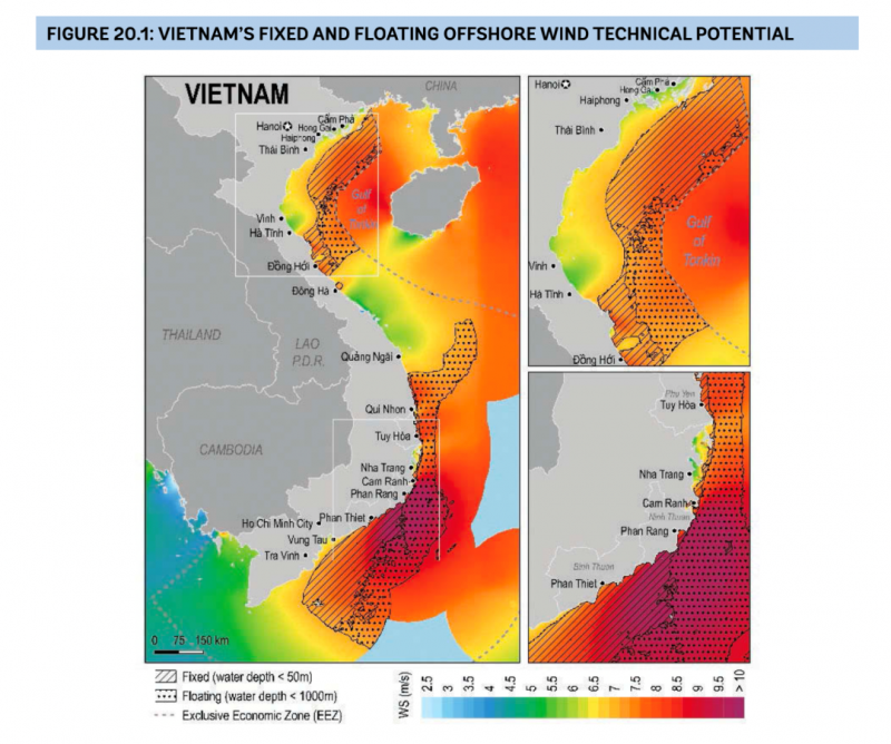 應越南政府要求,世界銀行完成了《越南海上風電發展路線圖》報告。據其預測,越南海上風電潛力高達475GW。相比之下,作為風力發電的佼佼者,德國目前的風電裝機為62GW,其中海上風電僅8GW。報告指出,到2035年,越南將有約450臺大型海上風力發電機組,其安裝在約10個固定基礎海上風電場和一兩個浮動基礎風電場。此外,由于與新市場相關的風險和當地供應鏈能力的缺乏,首批海上風電項目的能源成本比較高,預計為每兆瓦時為150-200 美元。隨著更多項目開建、風險降低和當地產能增加,能源成本將迅速下降。該成本可在 2030 年降至每兆瓦時為80-90 美元,2035 年降至每兆瓦時為60-70 美元。
