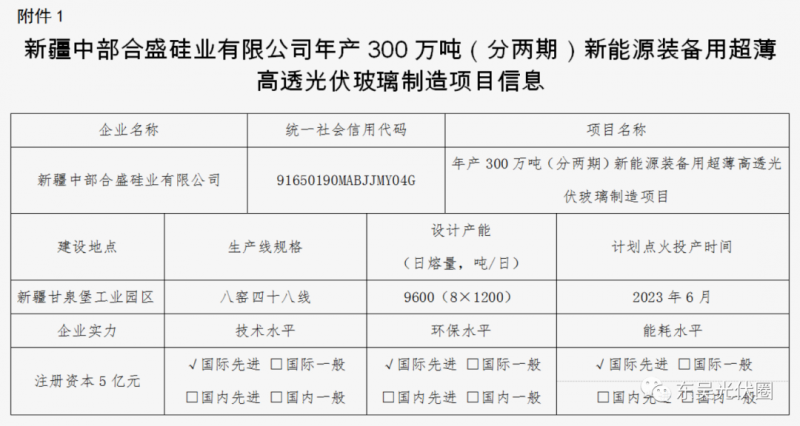 日前,新疆工信廳官網發布 “關于組織召開新疆中部合盛硅業有限公司年產300萬噸(分兩期)新能源裝備用超薄高透光伏玻璃制造項目聽證會的公告”。此公告也表明,合盛硅業進一步拓展光伏玻璃業務。