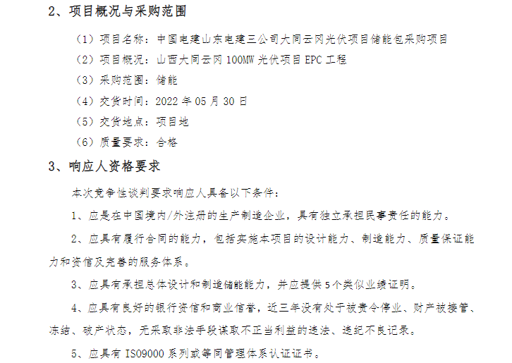 中國電建大同云岡光伏項目儲能包采購開標中國電建大同云岡光伏項目儲能包采購(gou)項目進行中標人公(gong)示,據公(gong)告(gao)顯(xian)示,中標人為廣州智(zhi)光儲能科技有限(xian)公(gong)司(si)。 根據前(qian)期招(zhao)標(biao)公告顯示,采(cai)購人為中國電(dian)建(jian)(jian)山(shan)東電(dian)建(jian)(jian)三公司(si)。公告要(yao)求,投(tou)標(biao)人具(ju)有承擔(dan)總體設計(ji)和制造儲能的能力(li),并提供五(wu)個類似業績證明(ming)。