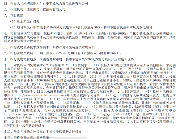 9MW/18MWh儲能系統!中節能50MW風力發電場項目招標4月(yue)15日(ri)中(zhong)節(jie)能(neng)(neng)發布永(yong)(yong)興50MW風力發電場項(xiang)(xiang)目(mu)儲(chu)(chu)能(neng)(neng)裝置采(cai)購招標公(gong)(gong)告(gao)。公(gong)(gong)告(gao)披露,項(xiang)(xiang)目(mu)為中(zhong)節(jie)能(neng)(neng)永(yong)(yong)興50MW風力發電項(xiang)(xiang)目(mu)和中(zhong)節(jie)能(neng)(neng)尉氏縣40MW風力發電項(xiang)(xiang)目(mu)。招標范(fan)圍為:9MW(4MW+5MW)/18MWh(8MWh+10MWh)電化學儲(chu)(chu)能(neng)(neng)系統設備。公(gong)(gong)告(gao)要求,2019年1月(yue)至投標截止日(ri),投標人必須(xu)具有(you)累(lei)計不(bu)(bu)低于(yu)100MWh風電配套(tao)儲(chu)(chu)能(neng)(neng)系統業(ye)績,其中(zhong)已投運業(ye)績累(lei)計不(bu)(bu)低于(yu)50MWh。