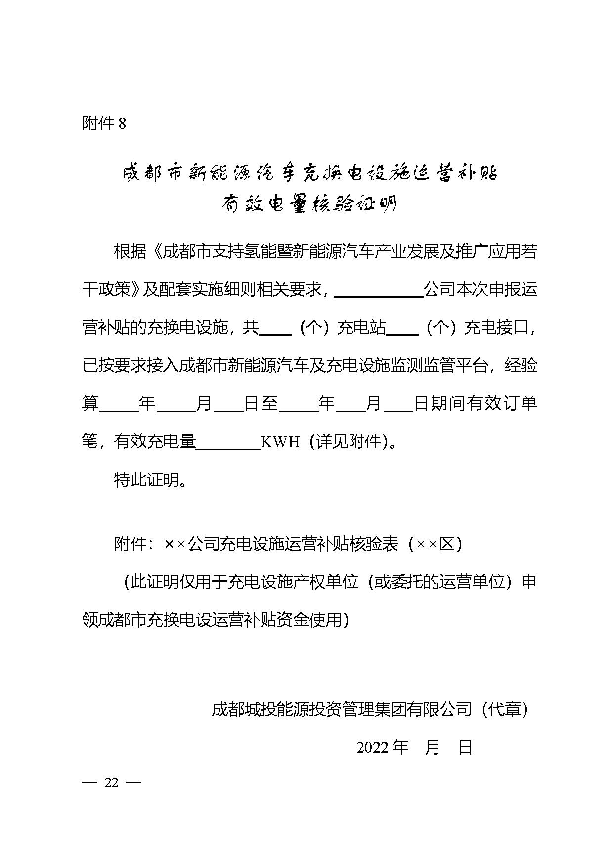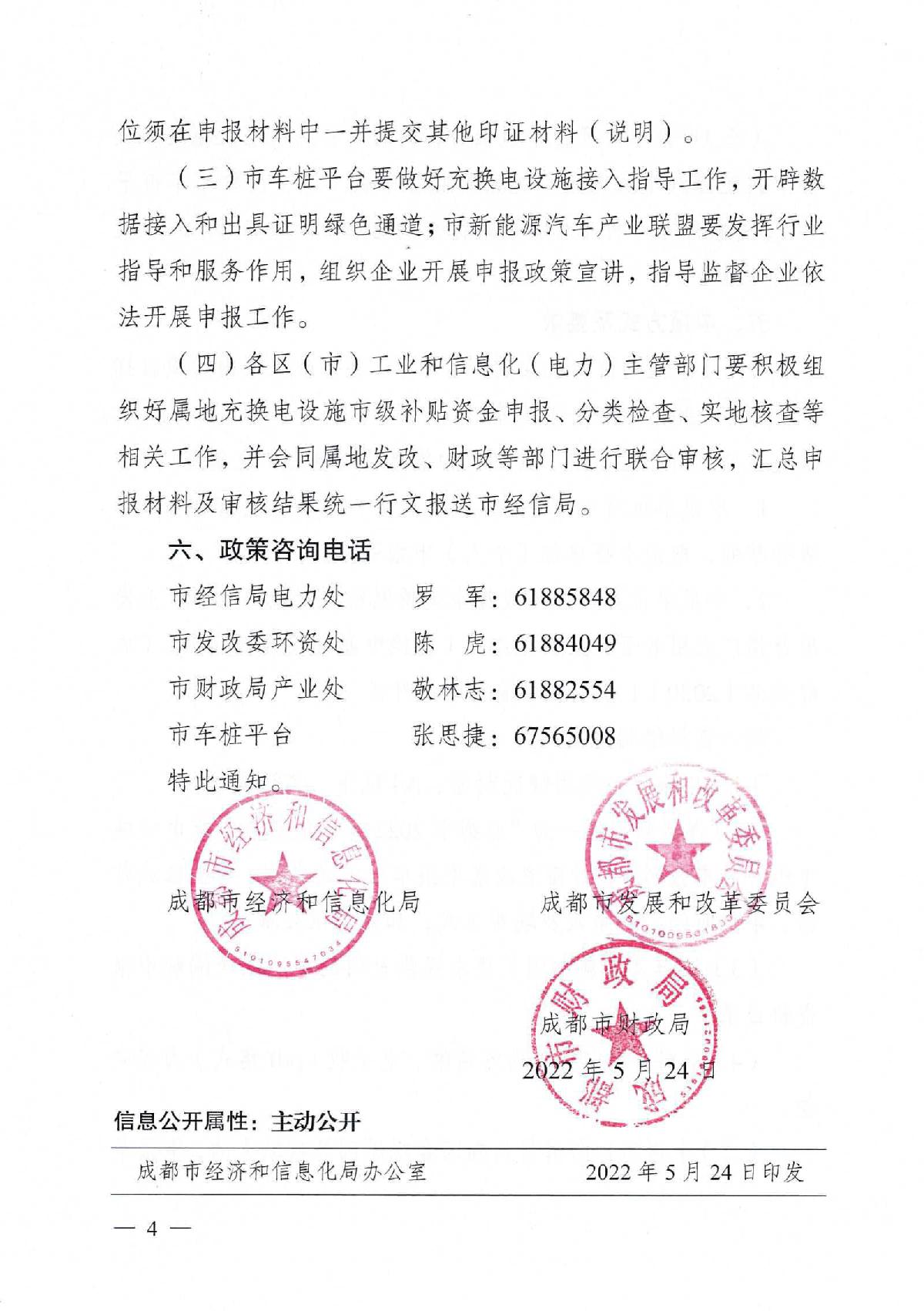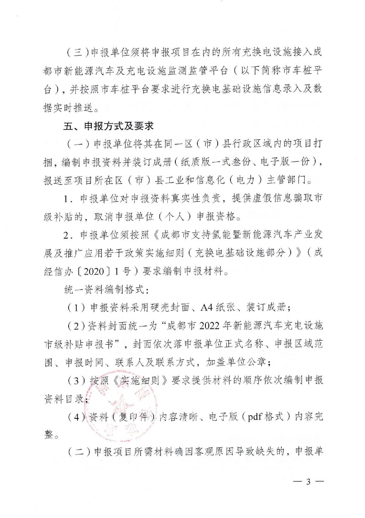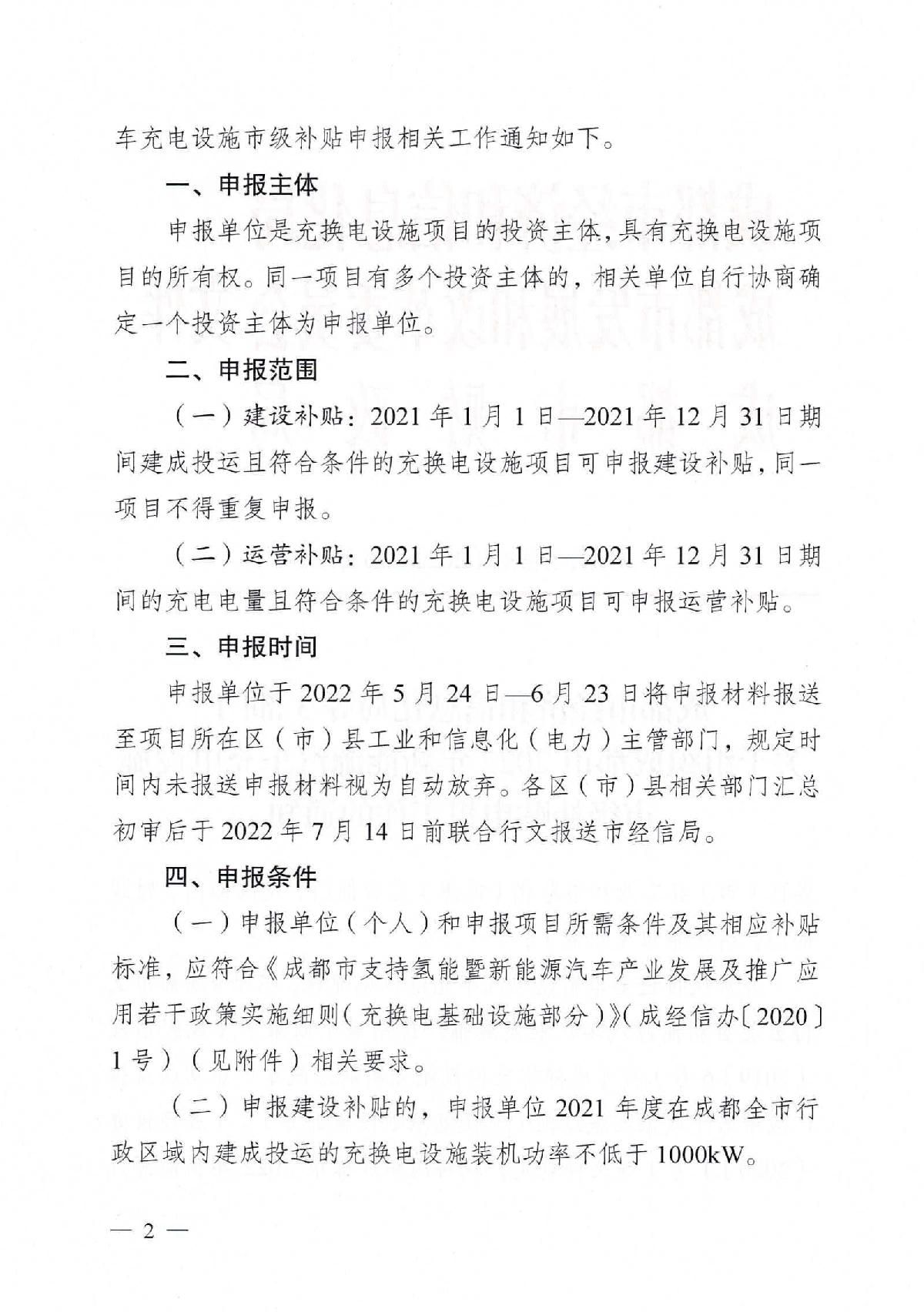 最高500萬元的運營補貼!成都開展2022年新能源汽車充電設施市級補貼申報工作6月(yue)1日,成(cheng)(cheng)(cheng)都(dou)經濟和信(xin)息化(hua)局(ju)發(fa)布關于(yu)組織成(cheng)(cheng)(cheng)都(dou)市2022年(nian)新能源汽車市級(ji)補貼申報工作的通知。申報建設補貼的,申報單位(wei)2021年(nian)度(du)在成(cheng)(cheng)(cheng)都(dou)全市行政(zheng)區(qu)域內建成(cheng)(cheng)(cheng)投運的充(chong)換(huan)電設施(shi)裝機功率不低于(yu)1000kW。 自(專)用(群),按照裝機功率給予投資主體交流(liu)每千瓦(wa)(wa)100元(yuan)、直流(liu)每千瓦(wa)(wa)200元(yuan)的一次性補貼,單(dan)個充電樁(群)最(zui)高20萬元(yuan)。 經(jing)營性(xing)集中式公(專)用充換電(dian)站(zhan)(BOT充換電(dian)站(zhan)除外),按照(zhao)裝機功(gong)率給(gei)予投資主體(ti)交流每(mei)千瓦(wa)150元、直流每(mei)千瓦(wa)400元,單個充換電(dian)站(zhan)最(zui)高500萬元的一次(ci)性(xing)補貼。 充換電(dian)設施年度累計充電(dian)量(BOT充換電(dian)站除外),按照(zhao)分(fen)段超額累進的(de)(de)方式(shi),給予投資主體(ti)最高500萬(wan)元(yuan)的(de)(de)運營(ying)補(bu)(bu)貼。補(bu)(bu)貼標準為:1000萬(wan)(含)千(qian)瓦時(shi)(shi)(shi)以內部分(fen),每(mei)千(qian)瓦時(shi)(shi)(shi)補(bu)(bu)貼0.1元(yuan);1000萬(wan)千(qian)瓦時(shi)(shi)(shi)至2000萬(wan)(含)千(qian)瓦時(shi)(shi)(shi)部分(fen),每(mei)千(qian)瓦時(shi)(shi)(shi)補(bu)(bu)貼0.15元(yuan);2000萬(wan)千(qian)瓦時(shi)(shi)(shi)以上部分(fen),每(mei)千(qian)瓦時(shi)(shi)(shi)補(bu)(bu)貼0.2元(yuan)。 原文如下: 關于組織(zhi)成都市2022年新能(neng)源汽車充電設施市級補(bu)貼申(shen)報工作的(de)通知 各充電樁有關企業: 市經信(xin)局、市財政局、市發改委已組(zu)織開展成都市2022年新能源汽(qi)車充電設施市級補貼申報(bao)工作(zuo)。為(wei)保障申報(bao)工作(zuo)有序組(zu)織開展,現(xian)請有關企業認真(zhen)閱讀(du)申報(bao)通(tong)知和附件要求,并(bing)且嚴格按(an)照通(tong)知和附件要求準備(bei)申報(bao)材料,詳細通(tong)知見鏈(lian)接: //cdjx.chengdu.gov.cn/cdsjxw/c132872/2022-05/24/content_6970803ae0b84fd0af6ed38d7493ddac.shtml。 一、申報條件 1. 申報單位(個人)應符合《成(cheng)都市支持氫能(neng)暨新能(neng)源汽車(che)產(chan)業發(fa)展及推(tui)廣應用若干政策實(shi)施(shi)細則(充換電(dian)基礎(chu)設施(shi)部分)》(成(cheng)經信辦〔2020〕1號)(見附件2)相關要求。 2. 申報建設補貼的(de),申報單(dan)位2021年度在成(cheng)都全市行政(zheng)區域(yu)內建成(cheng)投運的(de)充換(huan)電設施裝機(ji)功率(lv)不低于1000kW。 3. 申(shen)報(bao)單(dan)位須(xu)將(jiang)申(shen)報(bao)項目在(zai)內的所有充(chong)換(huan)電設(she)(she)施(shi)接(jie)入(ru)(ru)成都市(shi)(shi)新能(neng)源(yuan)汽車(che)及(ji)充(chong)電設(she)(she)施(shi)監測(ce)監管平臺(tai)(以下簡稱市(shi)(shi)車(che)樁(zhuang)平臺(tai)),并按照(zhao)市(shi)(shi)車(che)樁(zhuang)平臺(tai)要求(qiu)進行充(chong)換(huan)電基礎設(she)(she)施(shi)信息錄入(ru)(ru)及(ji)數據實時(shi)推送(song)。 二、申報方式及(ji)資料要求 1. 申報單位(wei)將其(qi)在龍泉驛區內的項目打捆(kun),編制申報資料并裝訂成(cheng)冊(紙質版一式5份、電子(zi)版1份),報送至(zhi)龍泉驛區經信局(ju)。 2. 申報單位須按照(zhao)《成都市(shi)支持氫能(neng)暨新能(neng)源汽車產業發展及(ji)推廣應用若干政策實(shi)施(shi)細(xi)則(充換(huan)電基(ji)礎設施(shi)部分)》(成經(jing)信(xin)辦〔2020〕1號)要求編(bian)制申報材料。 統一資料編(bian)制格式: (1)申報資料采用硬殼封面、A4紙張(zhang)、裝訂成(cheng)冊; (2)資料封(feng)面(mian)統一為“成都市2022年新能源汽車充電(dian)設施市級(ji)補貼申(shen)報書”,封(feng)面(mian)依次落申(shen)報單位(wei)正(zheng)式(shi)名稱、申(shen)報區(qu)域范圍、申(shen)報時(shi)間、聯系(xi)人及(ji)聯系(xi)方式(shi),加蓋(gai)單位(wei)公章; (3)按照《實施細則》要求提供材料(liao)的順序依(yi)次(ci)編(bian)制申(shen)報(bao)資料(liao)目錄; (4)資料(liao)(復印(yin)件)內(nei)容(rong)(rong)清晰、電子(zi)版(pdf格式)內(nei)容(rong)(rong)完整。 3. 申報(bao)項目所需材料確因客觀原因導致缺失的,申報(bao)單位須在申報(bao)材料中一并提交其他(ta)印證材料(說明)。 4. 申(shen)報(bao)單位對(dui)申(shen)報(bao)資(zi)料真實性負責,提供虛(xu)假信息騙取(qu)市(shi)級補貼(tie)的,取(qu)消申(shen)報(bao)單位(個人)申(shen)報(bao)資(zi)格。 三、申報要求及時間 1. 紙質材(cai)料一式5份,復印(yin)件需(xu)加蓋公章。 2. 電(dian)子(zi)版申報材料一份(整套資料帶章pdf掃(sao)描件)。 3. 申報單位于2022年6月23日(包含修改后提交時間)前將申報材料(liao)報送至(zhi)龍泉(quan)驛區經信(xin)局(經開區南四路325號(hao)成都公路口岸)811室,規定時間內未報送申報材料(liao)視為自動放棄,逾期不予受理。 成都市支持氫能暨新能源汽(qi)車產業發展 及推廣應(ying)用若干政策(ce)實(shi)施細則 (充換(huan)電(dian)設(she)施部分) 為(wei)加強新(xin)能源(yuan)(yuan)(yuan)(yuan)汽車充換電基礎設(she)施補貼資金的規(gui)范管(guan)理,根據財(cai)政部等四(si)部委《關(guan)于進(jin)一(yi)步(bu)完善新(xin)能源(yuan)(yuan)(yuan)(yuan)汽車推廣應(ying)用(yong)財(cai)政補貼政策的通知》(財(cai)建〔2019〕138號(hao))、國家發展(zhan)改革委等四(si)部委《關(guan)于印(yin)發〈提升新(xin)能源(yuan)(yuan