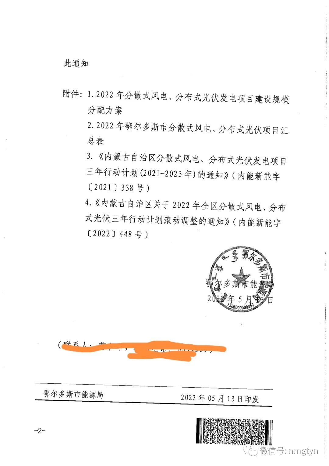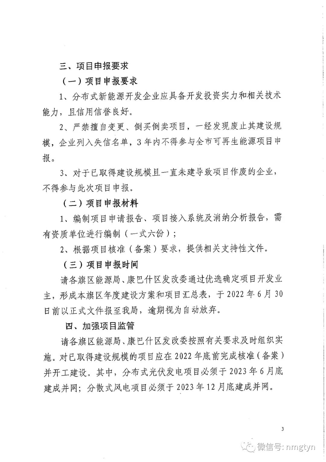 近日,內蒙古鄂爾多斯市能源局發布關于2022年分散式風電、分布式光伏發電項目建設規模分配方案的通知。 根據文件,鄂爾多斯市2022年分散式風電分布式光伏發電項目建設總規模為46.6萬千瓦,其中分散式風電為20萬千瓦,分布式光伏為26.6萬千瓦。 文件要求,對已取得建設規模的項目,應在2022年底前完成核準(備案)并開工建設,其中,分布式光伏發電項目必須于2023年6月底建成并網,分散式風電項目必須于2023年12月底建成并網。