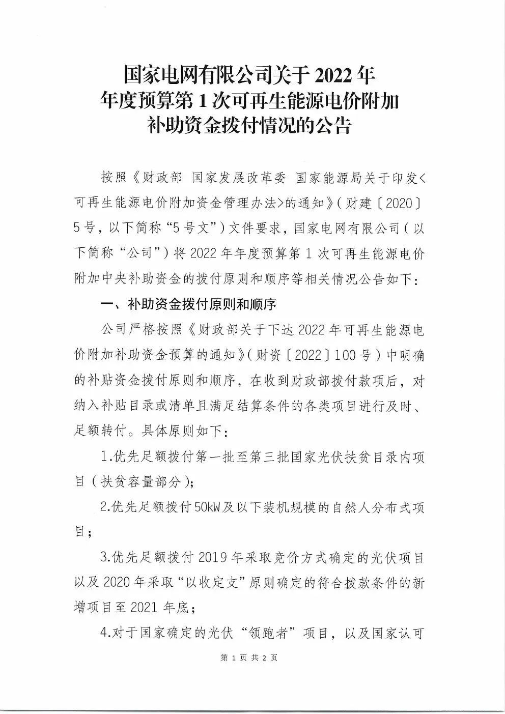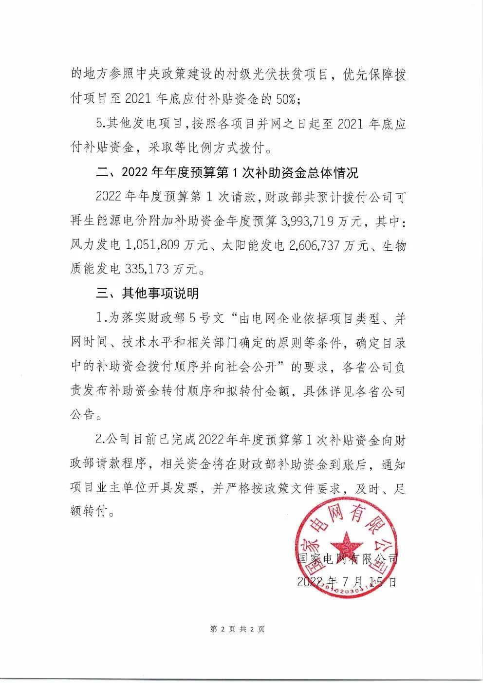 7月15日,國家電網公司發布《國家電網有限公司關于2022年年度預算第1次可再生能源電價附加補助資金撥付情況的公告》,發布2022年第一批補貼資金! 文件指出:2022年年度預算第1次請款,財政部共預計撥付公司可再生能源電價附加補助資金年度預算3,993,719萬元,其中:風力發電1,051,809萬元、太陽能發電 2,606,737萬元、生物質能發電335,173萬元。向財政部請款程序,相關資金將在財政部補助資金到賬后,通知項目業主單位開具發票,并嚴格按政策文件要求,及時、足額轉付。 全文如下: