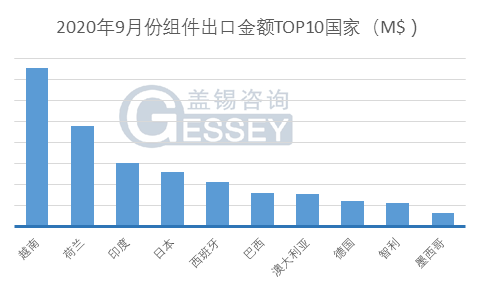 圖1,2020年1-9月(yue)中國組件月(yue)度(du)出(chu)口量 數(shu)據來源(yuan):蓋錫咨詢調研整理 圖(tu)2,2020年1-9月中國光(guang)伏電池片出口量(liang) 數(shu)據來源(yuan):蓋(gai)錫咨詢(xun)調(diao)研整理 2020年9月(yue)份中國光伏組(zu)件出(chu)口金(jin)額排名前(qian)十的市場分別為:越南(nan)、荷蘭、印度、日本、西班牙、巴(ba)西、澳大(da)利(li)亞、德國、智利(li)、墨西哥。 其中(zhong)越南市場繼續(xu)延續(xu)下半年的增長(chang)趨(qu)勢,9月份組(zu)件出口金(jin)額環比增長49%,仍位(wei)居第(di)一位(wei)。 荷蘭市場9月(yue)組件出口金額環(huan)比小幅下降3%,位居第(di)二位。 印度市場9月(yue)組件出口(kou)金額(e)環(huan)比大幅增長70%,排名上升至第三。 日本市場9月組件出(chu)口(kou)金(jin)額環比增長24%,排名保(bao)持在第四(si)。 西班牙市場9月(yue)組(zu)件出口出口金額環比下降18%,排名下滑至第五。 圖3,2020年9月份中國光伏組件出(chu)口金(jin)額(e)TOP10國家 數據(ju)來源:蓋錫咨詢調研整理
