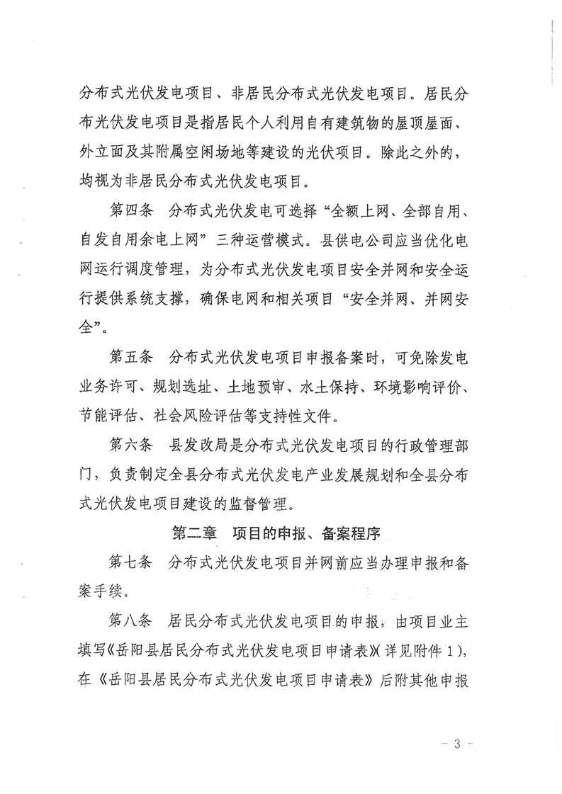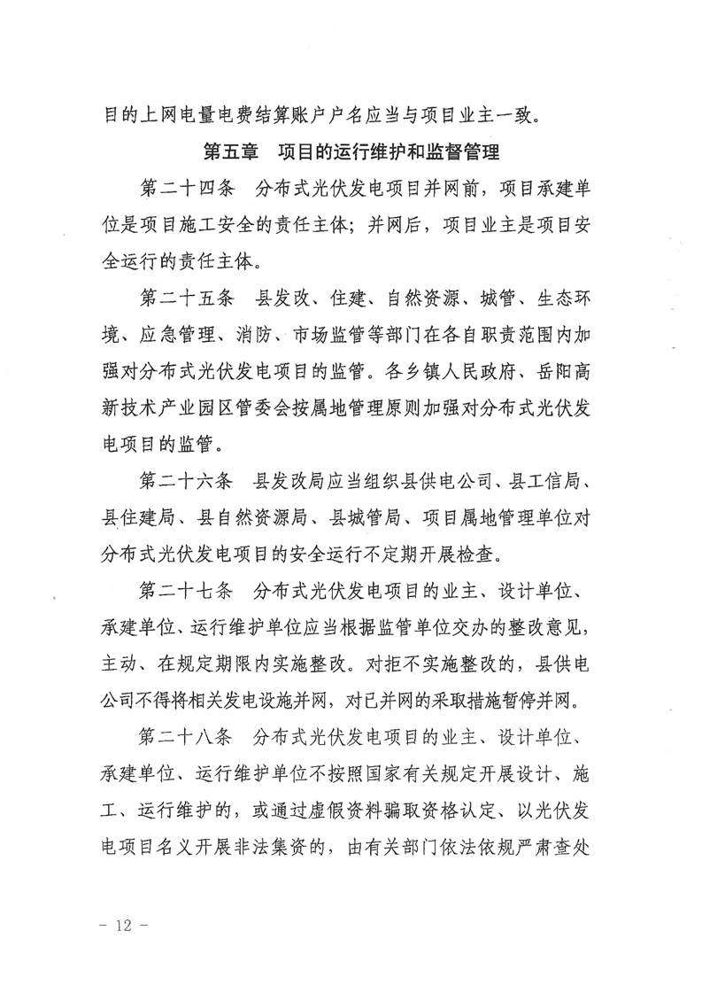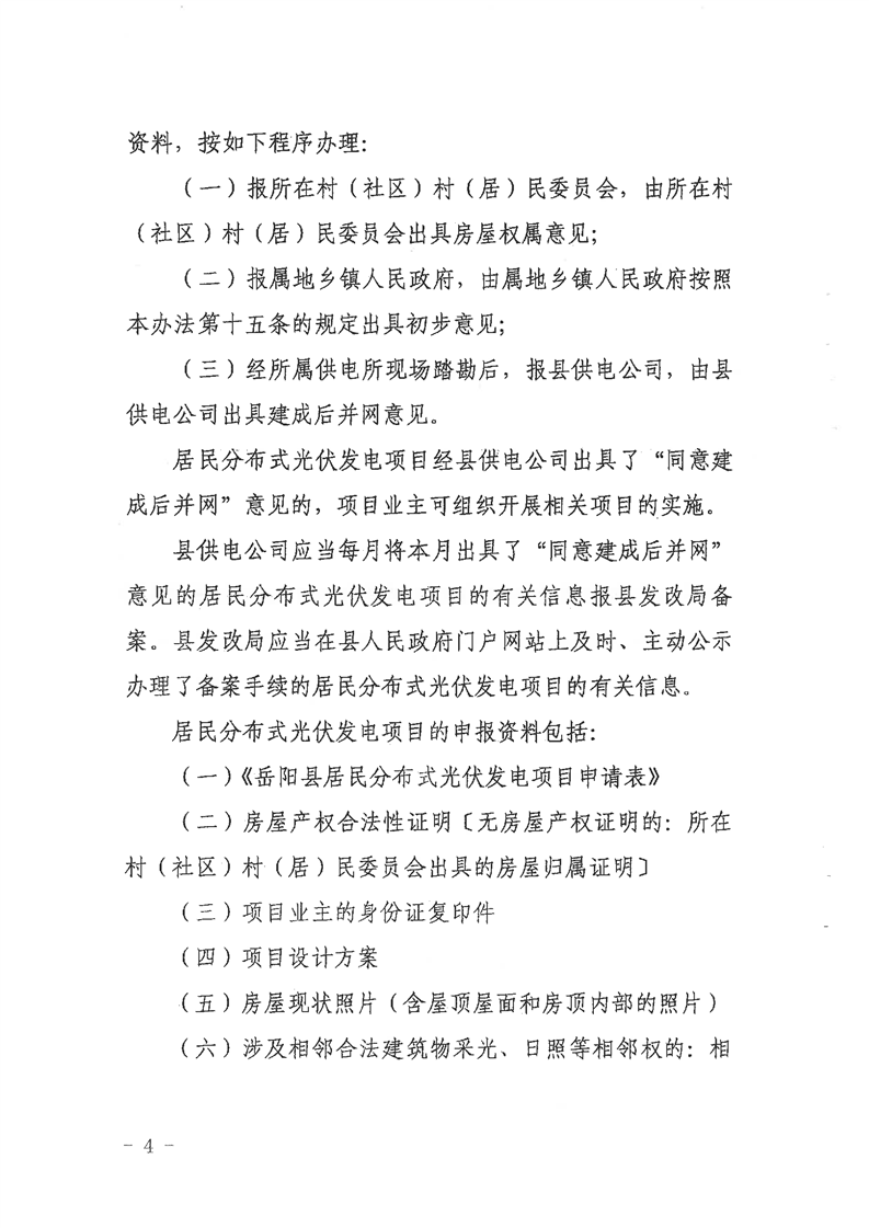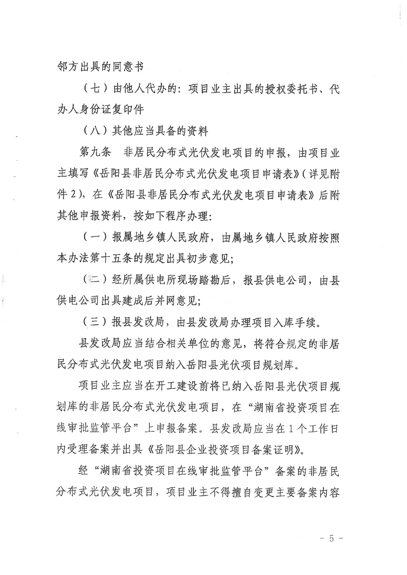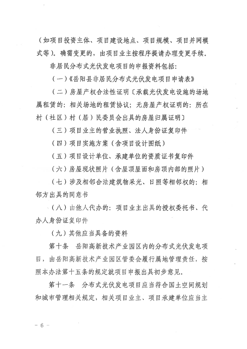 8月17日,湖南省岳陽市岳陽縣人民政府印發《岳陽縣分布式光伏發電項目管理暫行辦法》,文件對居民分布式光伏發電項目、非居民分布式光伏發電項目申報資料予以明確。 其中,居民分布式光伏發電項目的申報資料包括: (一)《岳陽縣居民分布式光伏發電項目申請表》 (二)房屋產權合法性證明[無房屋產權證明的:所在村(社區)村(居)民委員會出具的房屋歸屬證明] (三)項目業主的身份證復印件 (四)項目設計方案 (五)房屋現狀照片(含屋頂屋面和房頂內部的照片) (六)涉及相鄰合法建筑物采光、日照等相鄰權的:相鄰方出具的同意書 (七)由他人代辦的:項目業主出具的授權委托書、代辦人身份證復印件 (八)其他應當具備的資料 非居民分布式光伏發電項目的申報資料包括: (一)《岳陽縣非居民分布式光伏發電項目申請表》 (二)房屋產權合法性證明[承載光伏發電設施的場地屬租賃的:相關場地的租賃協議;無房屋產權證明的:所在村(社區)村(居)民委員會出具的房屋歸屬證明] (三)項目業主的營業執照、法人身份證復印件 (四)項目實施方案(含項目設計圖紙) (五)項目設計單位、承建單位的資質證書復印件 (六)房屋現狀照片(含屋頂屋面和房頂內部的照片) (七)涉及相鄰合法建筑物采光、日照等相鄰權的:相鄰方出具的同意書 (八)由他人代辦的:項目業主出具的授權委托書、代辦人身份證復印件 (九)其他應當具備的資料 全文如下: