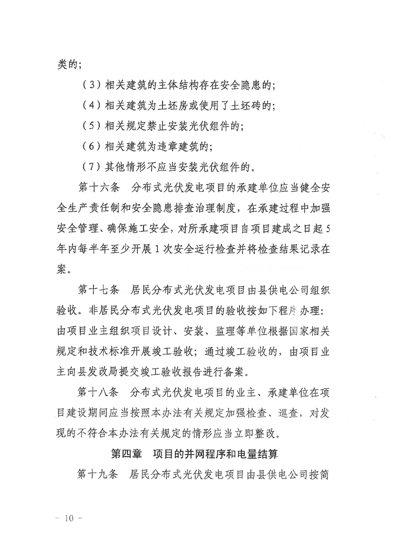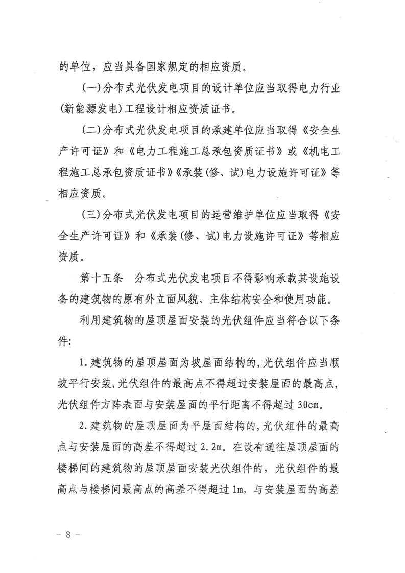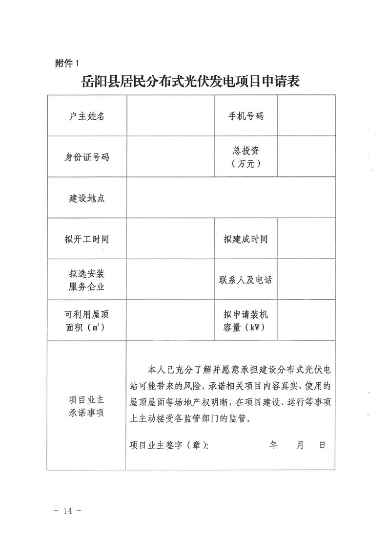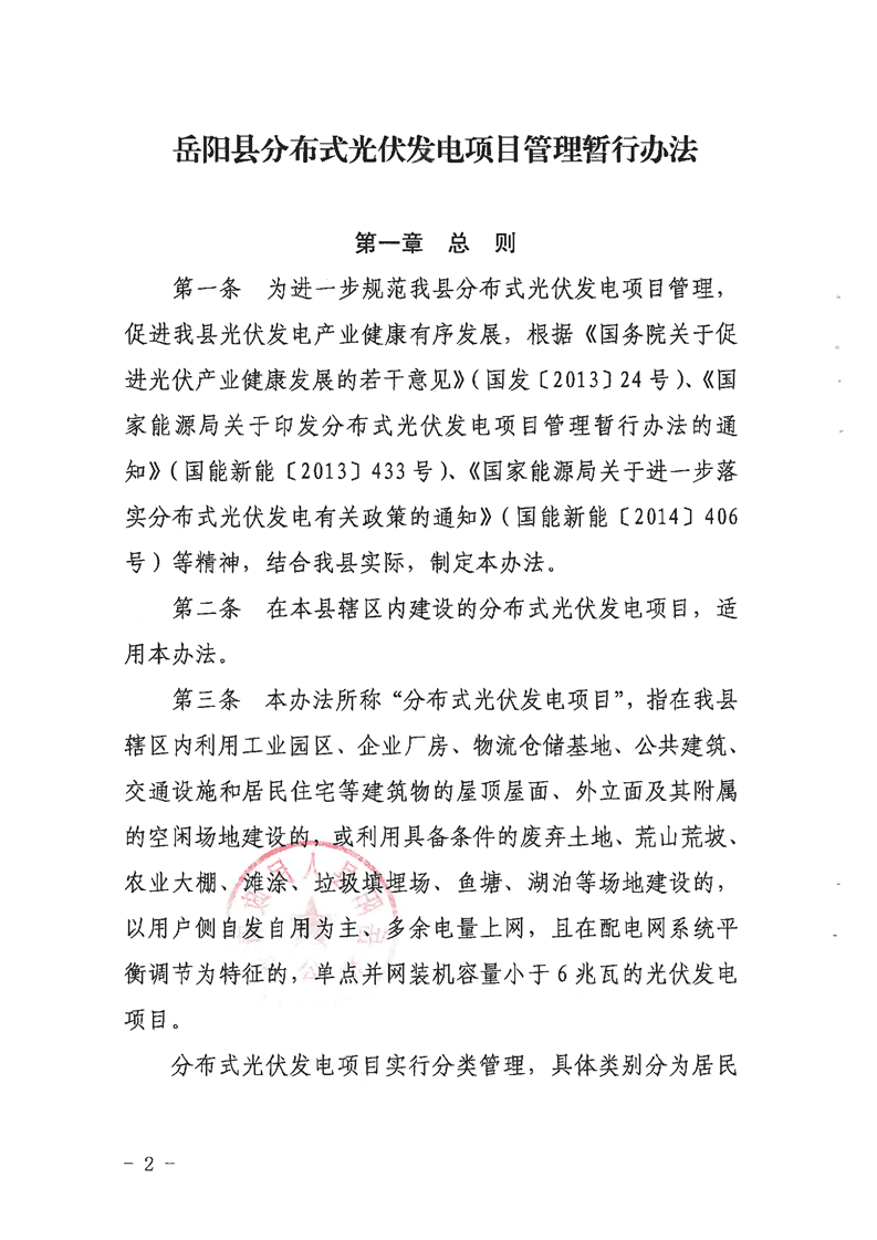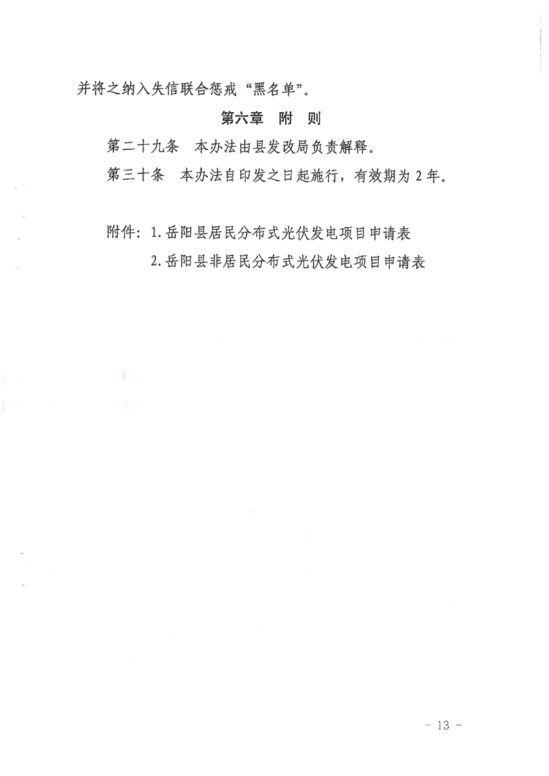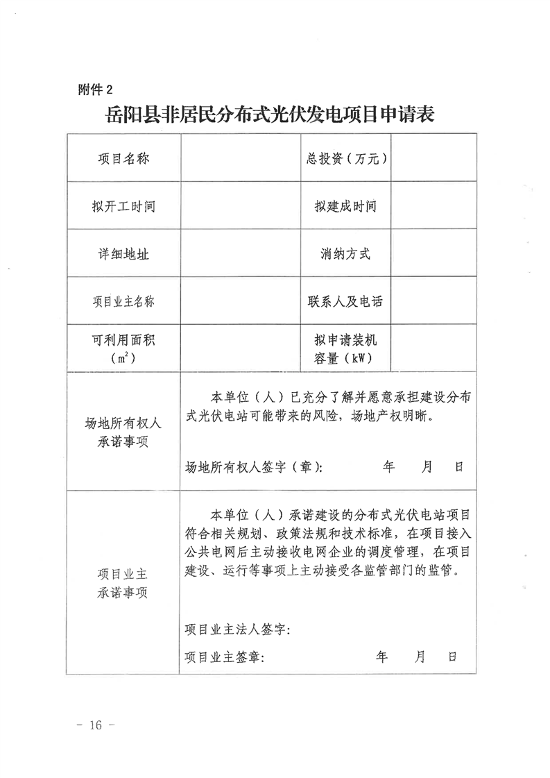 8月17日,湖南省岳陽市岳陽縣人民政府印發《岳陽縣分布式光伏發電項目管理暫行辦法》,文件對居民分布式光伏發電項目、非居民分布式光伏發電項目申報資料予以明確。 其中,居民分布式光伏發電項目的申報資料包括: (一)《岳陽縣居民分布式光伏發電項目申請表》 (二)房屋產權合法性證明[無房屋產權證明的:所在村(社區)村(居)民委員會出具的房屋歸屬證明] (三)項目業主的身份證復印件 (四)項目設計方案 (五)房屋現狀照片(含屋頂屋面和房頂內部的照片) (六)涉及相鄰合法建筑物采光、日照等相鄰權的:相鄰方出具的同意書 (七)由他人代辦的:項目業主出具的授權委托書、代辦人身份證復印件 (八)其他應當具備的資料 非居民分布式光伏發電項目的申報資料包括: (一)《岳陽縣非居民分布式光伏發電項目申請表》 (二)房屋產權合法性證明[承載光伏發電設施的場地屬租賃的:相關場地的租賃協議;無房屋產權證明的:所在村(社區)村(居)民委員會出具的房屋歸屬證明] (三)項目業主的營業執照、法人身份證復印件 (四)項目實施方案(含項目設計圖紙) (五)項目設計單位、承建單位的資質證書復印件 (六)房屋現狀照片(含屋頂屋面和房頂內部的照片) (七)涉及相鄰合法建筑物采光、日照等相鄰權的:相鄰方出具的同意書 (八)由他人代辦的:項目業主出具的授權委托書、代辦人身份證復印件 (九)其他應當具備的資料 全文如下: