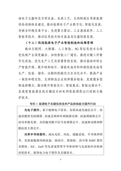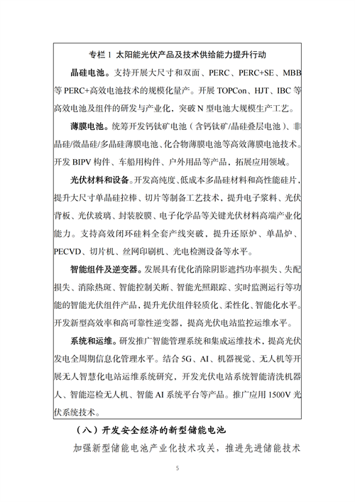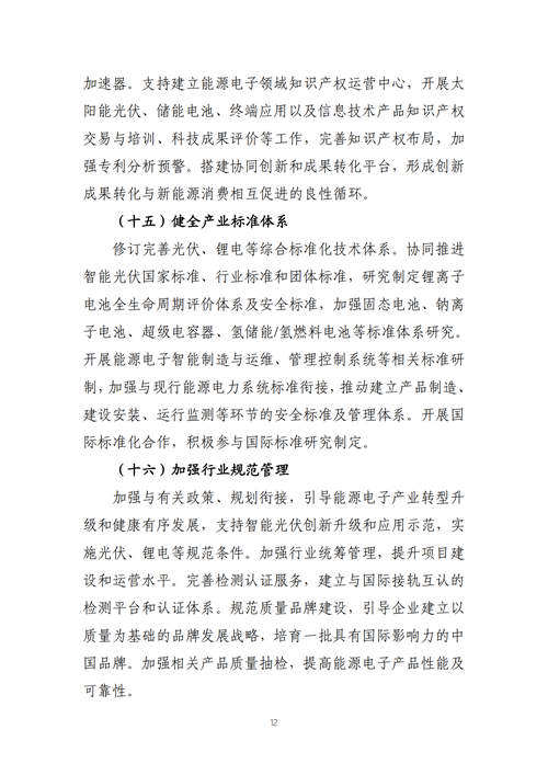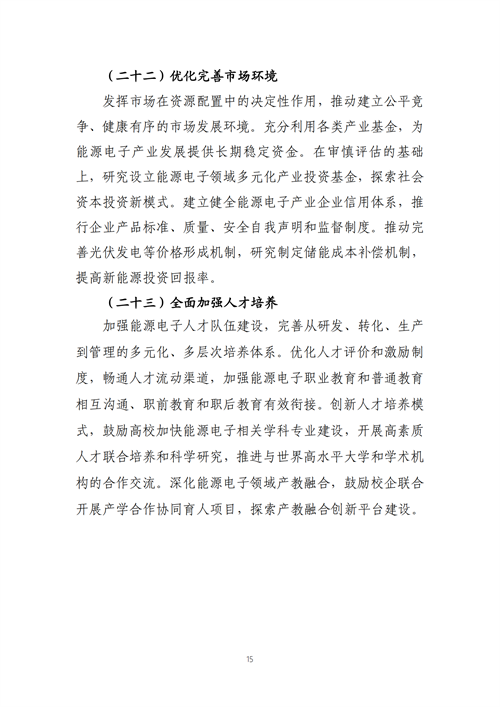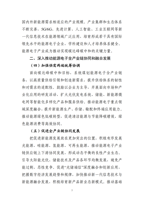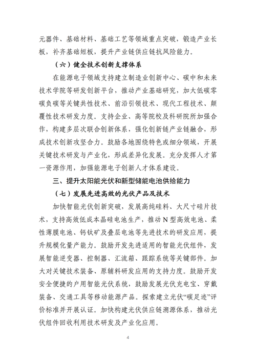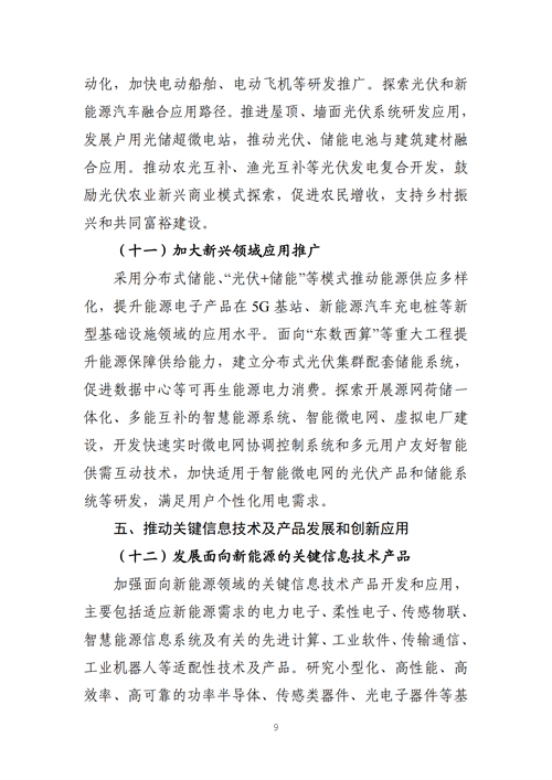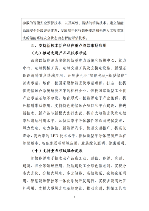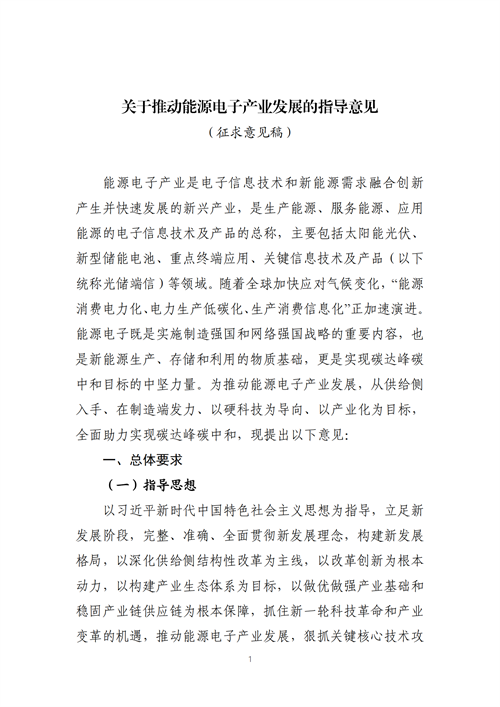 8月25日,工(gong)(gong)信部公開征求對《關于推(tui)動能(neng)源(yuan)電(dian)(dian)子產(chan)業(ye)(ye)發(fa)展的(de)指導意見(征求意見稿)》的(de)意見,意見提到,加快(kuai)能(neng)源(yuan)電(dian)(dian)子技術及(ji)產(chan)品在工(gong)(gong)業(ye)(ye)、通(tong)信、能(neng)源(yuan)、交通(tong)、 建(jian)筑、農(nong)業(ye)(ye)等(deng)領域應用(yong)(yong)。鼓勵建(jian)設工(gong)(gong)業(ye)(ye)綠色微電(dian)(dian)網,實(shi)現分(fen)布式光(guang)(guang)(guang)伏(fu)、分(fen)散式風電(dian)(dian)、多(duo)元儲能(neng)、高效熱(re)泵、余熱(re)余壓利 用(yong)(yong)、智慧能(neng)源(yuan)管控等(deng)一體化(hua)系(xi)(xi)統(tong)開發(fa)運(yun)行,實(shi)現多(duo)能(neng)高效互 補(bu)利用(yong)(yong)。支撐大型風光(guang)(guang)(guang)電(dian)(dian)基地建(jian)設。推(tui)動交通(tong)、機(ji)械(xie)工(gong)(gong)具電(dian)(dian)動化(hua),加快(kuai)電(dian)(dian)動船舶、電(dian)(dian)動飛機(ji)等(deng)研發(fa)推(tui)廣。探索光(guang)(guang)(guang)伏(fu)和(he)新(xin)能(neng)源(yuan)汽車融合(he)應用(yong)(yong)路徑。推(tui)進(jin)屋頂、墻面光(guang)(guang)(guang)伏(fu)系(xi)(xi)統(tong)研發(fa)應用(yong)(yong), 發(fa)展戶用(yong)(yong)光(guang)(guang)(guang)儲超微電(dian)(dian)站,推(tui)動光(guang)(guang)(guang)伏(fu)、儲能(neng)電(dian)(dian)池與建(jian)筑建(jian)材融 合(he)應用(yong)(yong)。推(tui)動農(nong)光(guang)(guang)(guang)互補(bu)、漁光(guang)(guang)(guang)互補(bu)等(deng)光(guang)(guang)(guang)伏(fu)發(fa)電(dian)(dian)復合(he)開發(fa),鼓 勵光(guang)(guang)(guang)伏(fu)農(nong)業(ye)(ye)新(xin)興(xing)商(shang)業(ye)(ye)模式探索,促進(jin)農(nong)民增收,支持鄉村振 興(xing)和(he)共同(tong)富裕建(jian)設。 面向碳(tan)達峰碳(tan)中和(he)目標,系統謀劃(hua)能(neng)(neng)源電子全(quan)產(chan)業(ye)鏈條,以高質(zhi)量供給引領(ling)(ling)和(he)創造(zao)新需(xu)求,提升供給體系的韌性(xing) 和(he)對需(xu)求的適配(pei)性(xing)。鼓勵以企業(ye)為主導(dao),開展面向市(shi)場和(he)產(chan) 業(ye)化應用的研(yan)發活動(dong),擴大(da)光(guang)伏發電系統、儲能(neng)(neng)、新能(neng)(neng)源微 電網等(deng)(deng)智能(neng)(neng)化多樣化產(chan)品和(he)服務供給。推(tui)(tui)動(dong)能(neng)(neng)源電子重點(dian)領(ling)(ling) 域深度融合(he),提升新能(neng)(neng)源生產(chan)、存儲、輸(shu)配(pei)和(he)終端應用能(neng)(neng)力。推(tui)(tui)動(dong)能(neng)(neng)源綠色低碳(tan)轉型,促進清(qing)潔能(neng)(neng)源與節能(neng)(neng)降碳(tan)增效、綠 色能(neng)(neng)源消費等(deng)(deng)高效協同。 加快(kuai)智能(neng)光伏創(chuang)新突破,發展高純硅料、大尺(chi)寸硅(gui)片技(ji)術,支持(chi)高(gao)效低(di)成(cheng)本晶硅(gui)電池生產(chan),推動N型高效電(dian)池(chi)、柔性薄膜電(dian)池(chi)、鈣鈦礦及疊層電(dian)池(chi)等(deng)先進技術(shu)的研(yan)發(fa)(fa)應(ying)用(yong)(yong),提升規(gui)模(mo)化(hua)量產能(neng)力。鼓(gu)(gu)勵(li)開發(fa)(fa)先進適用(yong)(yong)的智能(neng)光(guang)伏(fu)組件(jian),發(fa)(fa) 展(zhan)智能(neng)逆變器、控制(zhi)器、匯(hui)流箱、跟蹤系統等(deng)關鍵部(bu)件(jian)。加大對關鍵技術(shu)裝備(bei)、原輔料(liao)研(yan)發(fa)(fa)應(ying)用(yong)(yong)的支持力度。鼓(gu)(gu)勵(li)開發(fa)(fa)安全(quan)便捷的戶用(yong)(yong)智能(neng)光(guang)伏(fu)系統,鼓(gu)(gu)勵(li)發(fa)(fa)展(zhan)光(guang)伏(fu)充電(dian)寶、穿戴裝備(bei)、交通工具等(deng)移動(dong)能(neng)源產品。探索建立光(guang)伏(fu)“碳(tan)足跡”評(ping) 價標(biao)準并開展(zhan)認證。加快構建光(guang)伏(fu)供應(ying)鏈溯源體(ti)系,推動(dong)光(guang)伏(fu)組件(jian)回收(shou)利用(yong)(yong)技術(shu)研(yan)發(fa)(fa)及產業化(hua)應(ying)用(yong)(yong)。 原文如下: