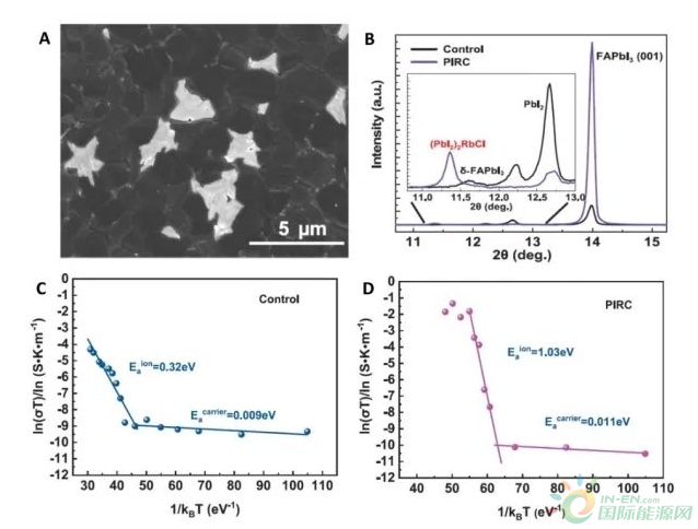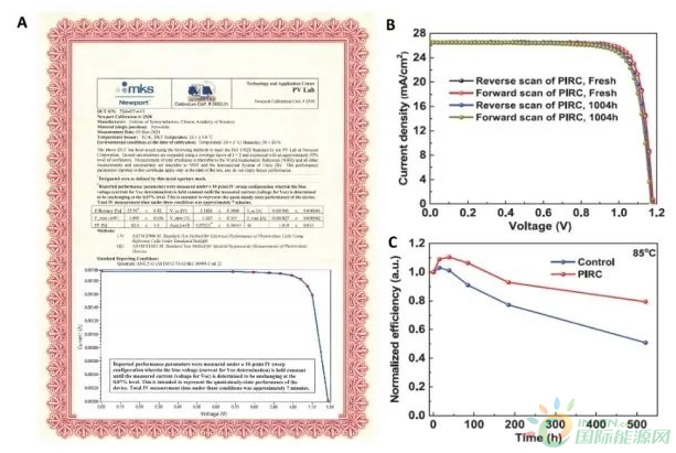 25.6%!中科院研制出最高效率鈣鈦礦太陽能電池8月1日,中科院(yuan)官網(wang)發布一則報(bao)告稱(cheng),中科院(yuan)半導體所研(yan)究(jiu)員基于(yu)獲得(de)的(de)高穩定性、光吸收擴展(zhan)的(de)鈣鈦礦(kuang)材料,研(yan)制出認證效(xiao)率(lv)為25.6%的(de)鈣鈦礦(kuang)太(tai)陽(yang)能(neng)電(dian)(dian)池(chi),為目前(qian)公開發表的(de)單結鈣鈦礦(kuang)太(tai)陽(yang)能(neng)電(dian)(dian)池(chi)世界最高效(xiao)率(lv)。 圖2.A、第三(san)方權威機構(gou)美(mei)國Newport認(ren)證書,認(ren)證效率為25.6%,插圖為認(ren)證效率曲(qu)線(xian);B、有無(wu)穩定(ding)(ding)二(er)次相PIRC器(qi)件放置(zhi)的(de)電(dian)流-電(dian)壓曲(qu)線(xian);C、有無(wu)穩定(ding)(ding)二(er)次相PIRC器(qi)件在(zai)85oC加速老化下的(de)穩定(ding)(ding)性(xing)。 原文如下: 鈣(gai)鈦礦太(tai)陽(yang)能電(dian)池(chi)具有成(cheng)本(ben)低(di)、光電(dian)轉換效率高等優(you)點。經(jing)過(guo)(guo)十多年(nian)的(de)快速發展(zhan),鈣(gai)鈦礦單結電(dian)池(chi)效率已超過(guo)(guo)25%,基于鈣(gai)鈦礦的(de)多結疊層電(dian)池(chi)效率已超過(guo)(guo)30%,鈣(gai)鈦礦太(tai)陽(yang)能電(dian)池(chi)被(bei)認為是(shi)未來頗(po)具應(ying)用潛力的(de)光伏(fu)技術之(zhi)一。 光電(dian)(dian)(dian)轉換效(xiao)率(lv)是太陽(yang)能電(dian)(dian)(dian)池(chi)(chi)的(de)(de)(de)核(he)心指標之一,為實(shi)現高效(xiao)率(lv)的(de)(de)(de)鈣(gai)(gai)鈦(tai)礦(kuang)(kuang)(kuang)(kuang)太陽(yang)能電(dian)(dian)(dian)池(chi)(chi),常采用可與鈣(gai)(gai)鈦(tai)礦(kuang)(kuang)(kuang)(kuang)形成I型(xing)異質結能級結構的(de)(de)(de)二(er)次相碘(dian)化鉛(PbI2)來(lai)阻(zu)擋載(zai)流(liu)子在(zai)多晶(jing)鈣(gai)(gai)鈦(tai)礦(kuang)(kuang)(kuang)(kuang)晶(jing)界或表面缺陷處復合。此(ci)前,中國科學院半導體(ti)研究所發現基于(yu)二(er)次相PbI2的(de)(de)(de)鈣(gai)(gai)鈦(tai)礦(kuang)(kuang)(kuang)(kuang)電(dian)(dian)(dian)池(chi)(chi)較(jiao)難兼(jian)顧效(xiao)率(lv)和(he)穩定性(Advanced Materials,2017,29,1703852),原因(yin)在(zai)于(yu)PbI2二(er)次相的(de)(de)(de)存在(zai)或提(ti)供了(le)鈣(gai)(gai)鈦(tai)礦(kuang)(kuang)(kuang)(kuang)分解以(yi)及離子移(yi)動通道(dao),使鈣(gai)(gai)鈦(tai)礦(kuang)(kuang)(kuang)(kuang)材(cai)料以(yi)及電(dian)(dian)(dian)池(chi)(chi)器件(jian)長期穩定性較(jiao)差,且易產生較(jiao)大的(de)(de)(de)電(dian)(dian)(dian)滯。因(yin)此(ci),如(ru)何設(she)計穩定的(de)(de)(de)二(er)次相,既(ji)(ji)能實(shi)現鈍化鈣(gai)(gai)鈦(tai)礦(kuang)(kuang)(kuang)(kuang)缺陷,又(you)能獲得穩定的(de)(de)(de)鈣(gai)(gai)鈦(tai)礦(kuang)(kuang)(kuang)(kuang)吸光材(cai)料,從而實(shi)現既(ji)(ji)高效(xiao)又(you)穩定的(de)(de)(de)鈣(gai)(gai)鈦(tai)礦(kuang)(kuang)(kuang)(kuang)太陽(yang)能電(dian)(dian)(dian)池(chi)(chi)是當前該領域的(de)(de)(de)重要課題之一。 近日,半導體所研究(jiu)員游經碧帶領團隊發現,通過(guo)在鈣鈦礦材料中引入(ru)少量氯化銣(RbCl),可將常(chang)見的引起鈣鈦礦不穩定(ding)的二次相(xiang)PbI2轉化成為全新的熱穩定(ding)性和化學(xue)穩定(ding)性好的(PbI2)2RbCl(簡稱PIRC)(圖1A、B)。 圖(tu)(tu)(tu)1.A、具(ju)有(you)PIRC二(er)次(ci)相鈣鈦(tai)礦(kuang)的(de)掃(sao)描電子(zi)顯微鏡照片;B、有(you)無(wu)PIRC的(de)鈣鈦(tai)礦(kuang)薄膜X射線衍射圖(tu)(tu)(tu)譜(pu)(插圖(tu)(tu)(tu)為局(ju)部放大圖(tu)(tu)(tu));C與(yu)D分別為有(you)無(wu)PIRC的(de)鈣鈦(tai)礦(kuang)電導與(yu)溫度關系圖(tu)(tu)(tu)。 研(yan)(yan)究實現(xian)了(le)(le)85oC條件(jian)下鈣鈦(tai)礦(kuang)材(cai)料(liao)(liao)熱穩(wen)定性(xing)大(da)幅度提(ti)升,同(tong)時鈣鈦(tai)礦(kuang)材(cai)料(liao)(liao)的(de)(de)離(li)子(zi)遷(qian)移勢壘提(ti)高(gao)了(le)(le)3倍,離(li)子(zi)遷(qian)移得到有效(xiao)抑制(zhi)(圖1C、D)。此外,研(yan)(yan)究發(fa)現(xian)通過抑制(zhi)PbI2消除了(le)(le)鈣鈦(tai)礦(kuang)/PbI2界面的(de)(de)強限域導致的(de)(de)能(neng)帶(dai)變(bian)大(da)問(wen)題,減小了(le)(le)鈣鈦(tai)礦(kuang)材(cai)料(liao)(liao)的(de)(de)帶(dai)隙,擴(kuo)展(zhan)(zhan)了(le)(le)對太陽(yang)光(guang)吸收(shou)范(fan)圍。基于獲得的(de)(de)高(gao)穩(wen)定性(xing)、光(guang)吸收(shou)擴(kuo)展(zhan)(zhan)的(de)(de)鈣鈦(tai)礦(kuang)材(cai)料(liao)(liao),該團(tuan)隊研(yan)(yan)制(zhi)出(chu)認證(zheng)效(xiao)率(lv)(lv)為(wei)25.6%的(de)(de)鈣鈦(tai)礦(kuang)太陽(yang)能(neng)電(dian)(dian)池(圖2A),為(wei)目前(qian)公(gong)開發(fa)表(biao)的(de)(de)單結鈣鈦(tai)礦(kuang)太陽(yang)能(neng)電(dian)(dian)池世界最高(gao)效(xiao)率(lv)(lv)。電(dian)(dian)池器件(jian)1000小時放置和(he)(he)85攝氏度加速老化(hua)分別保持初始效(xiao)率(lv)(lv)的(de)(de)96%和(he)(he)80%(圖2B、C)。該工作同(tong)時實現(xian)了(le)(le)鈣鈦(tai)礦(kuang)太陽(yang)能(neng)電(dian)(dian)池的(de)(de)高(gao)光(guang)電(dian)(dian)轉(zhuan)換效(xiao)率(lv)(lv)和(he)(he)高(gao)穩(wen)定性(xing),為(wei)鈣鈦(tai)礦(kuang)電(dian)(dian)池的(de)(de)進一步發(fa)展(zhan)(zhan)以及產業化(hua)奠(dian)定了(le)(le)堅實的(de)(de)基礎(chu)。 相(xiang)關研(yan)究成果以Inactive (PbI2)2RbCl stabilizes perovskite films for efficient solar cells為題,發表在Science上(shang)。研(yan)究工作得到(dao)國(guo)家重點研(yan)發計劃、國(guo)家杰出青年(nian)科(ke)學(xue)基金、中(zhong)科(ke)院創新交(jiao)叉(cha)團隊、國(guo)家優秀青年(nian)科(ke)學(xue)基金、中(zhong)南大學(xue)、