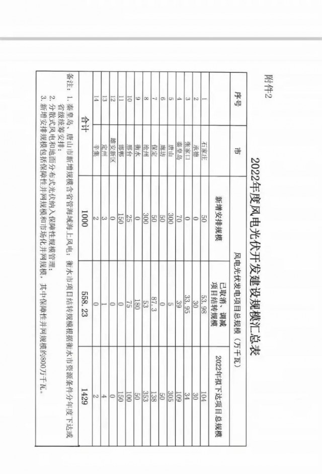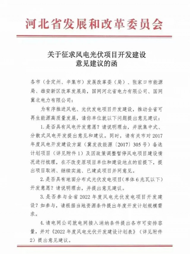 9月1日,河北省發(fa)改委(wei)發(fa)布了《關于征求風(feng)電(dian)光伏(fu)(fu)項目開發(fa)建設(she)意見建議的(de)函》,并公示了 2022年度風(feng)電(dian)、光伏(fu)(fu)開發(fa)建設(she)規模匯總(zong)表(biao)。 根據(ju)公示的2022年風(feng)光開發(fa)建設(she)規模(mo)表,河北省2022年擬下達風(feng)光項目14.29GW,分布在石家(jia)莊、承德、張家(jia)口、秦(qin)皇島(dao)等14個市。其中(zhong),已取(qu)消、調減項目結(jie)轉規模(mo)5.58GW,新增(zeng)規模(mo)規模(mo)為10GW。 新增指標包括保障(zhang)性并(bing)網(wang)規(gui)模(mo)和(he)市場(chang)化并(bing)網(wang)規(gui)模(mo)共10GW,其中保障(zhang)性并(bing)網(wang)規(gui)模(mo)約8GW,市場(chang)化并(bing)網(wang)規(gui)模(mo)約2GW。值(zhi)得注意的是,文件指出分散式(shi)(shi)風電和(he)地面分布式(shi)(shi)光伏(fu)納入保障(zhang)性規(gui)模(mo)管理(li),這意味著這兩種模(mo)式(shi)(shi)不需(xu)要配(pei)置(zhi)儲能(neng)。 在(zai)征求意(yi)見(jian)函中,河北省發(fa)改委要求各(ge)地(di)主管部門就風電(dian)、地(di)面分布式光(guang)伏(fu)開發(fa)意(yi)愿進行說明,并請電(dian)網公司就電(dian)網接入消(xiao)納條件(jian)提出(chu)(chu)各(ge)市(shi)可安排容量,并對《2022年度風電(dian)光(guang)伏(fu)開發(fa)建設計劃表》提出(chu)(chu)意(yi)見(jian)建議。 此外,根據河(he)北省發(fa)(fa)改委在(zai)對政協(xie)河(he)北省第(di)十(shi)二屆(jie)委員會(hui)第(di)四次會(hui)議第(di)317號提案的答復(fu)(fu)中顯示,河(he)北省初步考(kao)慮“十(shi)四五(wu)”期間,將在(zai)已批復(fu)(fu)在(zai)建(jian)項目項目基礎(chu)上,新安排風電(dian)、光(guang)伏發(fa)(fa)電(dian)建(jian)設規(gui)模2000萬千(qian)(qian)瓦(wa)、3200萬千(qian)(qian)瓦(wa)以(yi)上,裝(zhuang)機規(gui)模分別達到4300萬千(qian)(qian)瓦(wa)、5400萬千(qian)(qian)瓦(wa)以(yi)上。