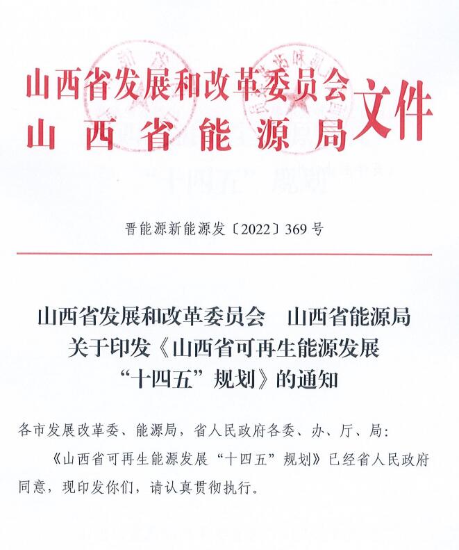 10月8日,山西省發展和改革委員會山西省能源局印發《山西省可再生能源發展”十四五“規劃》的通知。通知中提到,到2025年,全省可再生能源發電裝機達到8300萬千瓦以上。 其中,風電3000萬千瓦左右、光伏5000萬千瓦左右、水電(含抽蓄)224萬千瓦以上、生物質發電100萬千瓦以上,新型儲能裝機將達到600萬千瓦左右,實現新能源和清潔能源裝機容量占比達到50%的目標。到2030年,全省新能源和清潔能源裝機容量占比達到 60%以上。
