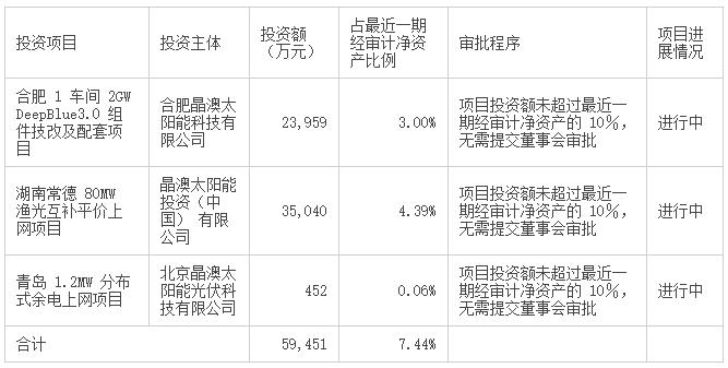 12月15日,晶澳(ao)太陽能科技(ji)股份(fen)有(you)限公司(股票簡(jian)稱(cheng):晶澳(ao)科技(ji))發(fa)布公告,公司第五屆董事會(hui)第十(shi)八次(ci)會(hui)議(yi)審(shen)議(yi)通過了《關于投資(zi)建設揚州(zhou)年產6GW高(gao)功(gong)率組(zu)件(jian)(jian)(jian)項(xiang)目的議(yi)案》,根據戰略(lve)發(fa)展(zhan)需要,同意公司下(xia)屬子公司晶澳(ao)(揚州(zhou))新(xin)能源有(you)限公司(以(yi)下(xia)簡(jian)稱(cheng)“揚州(zhou)新(xin)能源”)于揚州(zhou)經濟技(ji)術開發(fa)區建設年產6GW高(gao)功(gong)率組(zu)件(jian)(jian)(jian)項(xiang)目,購(gou)置裝配光伏(fu)組(zu)件(jian)(jian)(jian)生(sheng)產線,形成年產6GW高(gao)功(gong)率組(zu)件(jian)(jian)(jian)的生(sheng)產能力。 晶澳科技介紹,項(xiang)(xiang)目(mu)投(tou)資(zi)(zi)(zi)總(zong)額7.96億元,項(xiang)(xiang)目(mu)資(zi)(zi)(zi)金(jin)為自籌資(zi)(zi)(zi)金(jin),來源于股(gu)東出資(zi)(zi)(zi)款(kuan)、股(gu)東貸款(kuan)、金(jin)融機構貸款(kuan)等(deng),并授權經(jing)營管理層(ceng)辦理該(gai)項(xiang)(xiang)目(mu)的全(quan)部(bu)手續,包(bao)括但不限于簽署相關文件(jian)、提交政府審批(pi)申請文件(jian)等(deng)。項(xiang)(xiang)目(mu)建(jian)設(she)周期預計8個月(yue)。 此外,晶澳科(ke)技(ji)還披露(lu)了(le)公司近期(qi)累計已經發生的(de)且尚(shang)未達到董事會審(shen)議標準的(de)對外投資事項,如下: