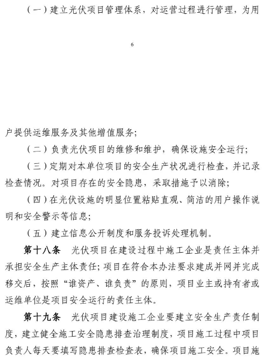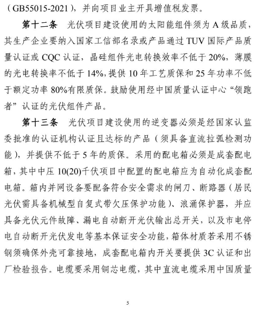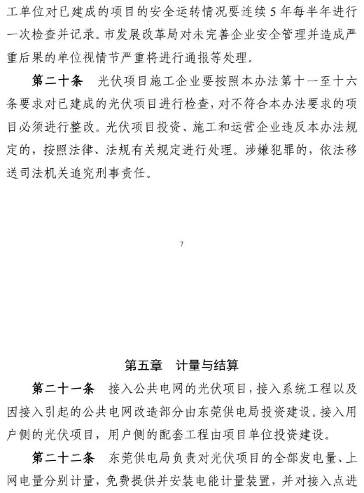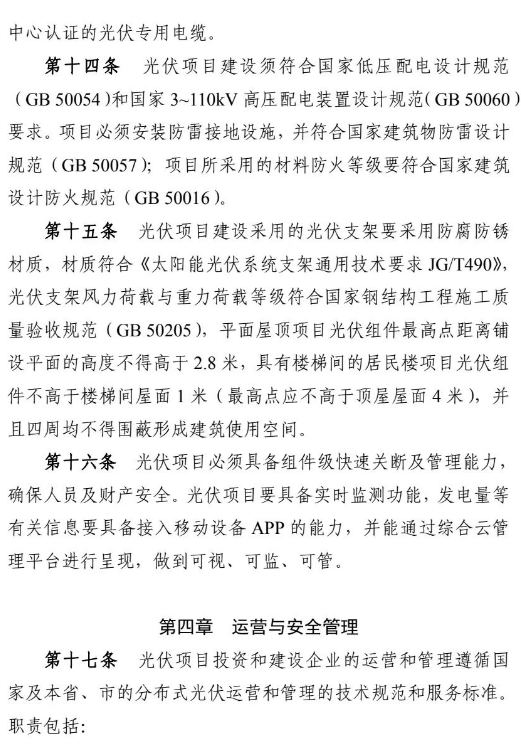 近日(ri),東莞市發(fa)改委印發(fa)《東莞市發(fa)展和改革局分布式光(guang)伏發電項(xiang)目(mu)建設管理(li)辦法(fa)》的通知。在通知中提出:光(guang)伏(fu)項目建設采用(yong)的光(guang)伏(fu)支架要采用(yong)防腐防銹材質,材質符(fu)合《太陽能(neng)光(guang)伏(fu)系(xi)統支架通用(yong)技術要求JG/T490》,光(guang)伏(fu)支架風力荷(he)載(zai)與(yu)重(zhong)力荷(he)載(zai)等級符(fu)合國家鋼結(jie)構工程施工質量驗收規范(GB 50205),平面(mian)屋頂(ding)項目光(guang)伏(fu)組件最高(gao)點距(ju)離(li)鋪設平面(mian)的高(gao)度不得高(gao)于(yu)(yu)2.8米,具有(you)樓梯間的居民樓項目光(guang)伏(fu)組件不高(gao)于(yu)(yu)樓梯間屋面(mian)1米(最高(gao)點應不高(gao)于(yu)(yu)頂(ding)屋屋面(mian)4米),并且(qie)四周(zhou)均不得圍蔽形成(cheng)建筑(zhu)使用(yong)空間。 原(yuan)文通知如下: