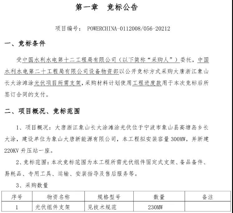 11月13日,中國(guo)電(dian)建(jian)水(shui)電(dian)十(shi)二局(ju)大唐浙江象山長(chang)大涂(tu)灘(tan)光(guang)伏項目光伏支架采購開標,江蘇中信博新能源(yuan)(yuan)科(ke)技(ji)股份有(you)限公(gong)司、常州市山峰新能源(yuan)(yuan)科(ke)技(ji)有(you)限公(gong)司、深圳市固(gu)耐達(da)科(ke)技(ji)有(you)限公(gong)司等3家企(qi)業入圍此(ci)次招標。 根(gen)據招標文件,大(da)唐(tang)浙江象(xiang)山(shan)長大(da)涂灘涂光伏位于寧波市象(xiang)山(shan)縣高塘島鄉長大(da)涂,建設單位為象(xiang)山(shan)大(da)唐(tang)新(xin)能源(yuan)有限公司,本工程擬安裝容量300MW,并新(xin)建220KV升壓站一座。同(tong)時,本次招標采購光伏組(zu)件支架數量為230MW。