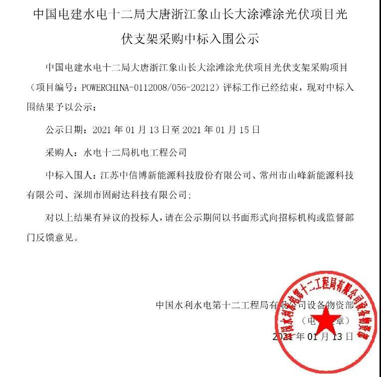 中國電建300MW光伏支架中標企業名單公示:中信博、山峰新能源、固耐達3家入圍2021-01-14 09:51來源:中國電建設(she)備物資集中采購(gou)平臺(tai)作者:中國電建(jian)設備(bei)物資集中采購平臺瀏覽數:6次