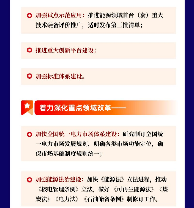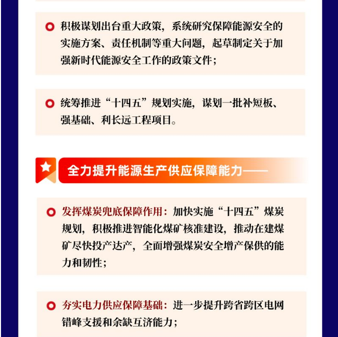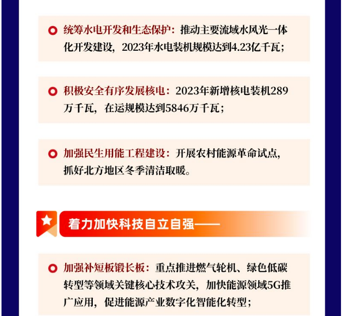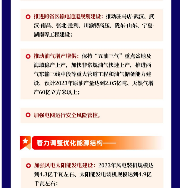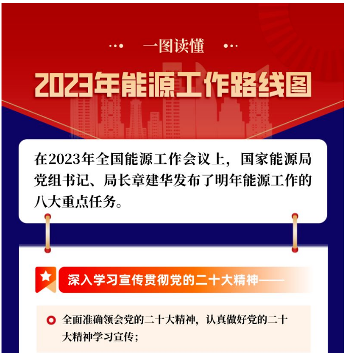12月30日,2023年全國能源工作會議在北京召開。會議總結了2022年重點工作成果,并部署了2023年重點任務。 會議上,國家能(neng)(neng)源(yuan)局黨(dang)組書記、局長(chang)章建(jian)華公(gong)開(kai)了明年能(neng)(neng)源(yuan)工作的(de)六(liu)項重點任(ren)務,包括(kuo)全力提(ti)升(sheng)能(neng)(neng)源(yuan)生(sheng)產供應保障能(neng)(neng)力、調整優化能(neng)(neng)源(yuan)結構、加快科技自立(li)自強、深化重點領域(yu)改革、加強能(neng)(neng)源(yuan)監管以及加強能(neng)(neng)源(yuan)國際合作。 同(tong)時,國家能源局設立(li)目標(biao),2023年(nian),風(feng)電(dian)裝(zhuang)機(ji)規模達(da)4.3億(yi)千瓦(wa)左右(you)、太(tai)陽能發電(dian)裝(zhuang)機(ji)規模達(da)4.9億(yi)千瓦(wa)左右(you)。兩者累計裝(zhuang)機(ji)達(da)9.2億(yi)千瓦(wa),其中新(xin)增裝(zhuang)機(ji)將達(da)1.6億(yi)千瓦(wa),同(tong)比(bi)增長超33%。 在(zai)“調整優(you)化能(neng)源結構(gou)”任(ren)務下,國家能(neng)源局要求加強風電、太陽能(neng)發電建(jian)設(she),統籌(chou)水電開發和生(sheng)態保護,積(ji)極(ji)安全有序發展核電,以(yi)及加強民生(sheng)用(yong)能(neng)工程建(jian)設(she)。 作為“十四五”新能(neng)源發展的重點,國內風光大基(ji)地建設正在提(ti)速(su)。 根據國家能源局數據,2022年(nian),第一批大型風(feng)(feng)電光(guang)伏基(ji)地9705萬(wan)千瓦(wa)已全(quan)部開工,第二(er)批、第三批基(ji)地項目陸續推進,全(quan)年風(feng)(feng)電光(guang)伏發電新(xin)增裝機(ji)預(yu)計(ji)1.2億(yi)(yi)千瓦(wa)以上(shang)。至2021年12月底,全(quan)國風(feng)(feng)光(guang)累(lei)計(ji)發電裝機(ji)容(rong)量為6.4億(yi)(yi)千瓦(wa)。由(you)此計(ji)算,2022年全(quan)國風(feng)(feng)光(guang)累(lei)計(ji)裝機(ji)量將達(da)7.6億(yi)(yi)千瓦(wa)以上(shang),同(tong)比增速達(da)18.75%。 深入學習貫徹黨的二十大精神 為全面建設社會主義現代化國家提供堅強能源保障 2023年全國能源工作會議在京召開 12月30日,2023年(nian)全國能(neng)源工(gong)作(zuo)(zuo)會議在北(bei)京召開(kai)。會議以(yi)習近平新時代中國特色社會主義思想為指導,全面貫徹(che)黨(dang)(dang)的二十大精神,認(ren)真落實中央經濟工(gong)作(zuo)(zuo)會議部(bu)署(shu)和全國發(fa)(fa)展(zhan)改革(ge)工(gong)作(zuo)(zuo)會議要(yao)求,總結2022年(nian)重點工(gong)作(zuo)(zuo)和新時代十年(nian)發(fa)(fa)展(zhan)成就,謀劃(hua)當(dang)前和今(jin)后一段時期能(neng)源發(fa)(fa)展(zhan)思路,部(bu)署(shu)2023年(nian)重點任務。國家能(neng)源局黨(dang)(dang)組書記、局長章建華(hua)出席會議并講話。 章建(jian)華指出,習近(jin)平總書記(ji)高度重(zhong)(zhong)視能(neng)源(yuan)工作,多次作出重(zhong)(zhong)要指示批示,科學(xue)(xue)引(yin)領能(neng)源(yuan)發(fa)展進入(ru)新(xin)時代、開創新(xin)局面。黨(dang)的(de)(de)(de)二十大(da)(da)就(jiu)深入(ru)推(tui)進能(neng)源(yuan)革命、確保(bao)能(neng)源(yuan)安全(quan)、推(tui)進碳(tan)達峰(feng)碳(tan)中和、規劃建(jian)設新(xin)型(xing)(xing)能(neng)源(yuan)體(ti)系(xi)、科技(ji)自(zi)立自(zi)強(qiang)、積極(ji)參與應(ying)對氣候變化(hua)全(quan)球(qiu)治(zhi)理等作出安排部(bu)署,提(ti)出新(xin)的(de)(de)(de)明確要求。能(neng)源(yuan)行業深入(ru)學(xue)(xue)習貫(guan)徹黨(dang)的(de)(de)(de)二十大(da)(da)精神,要對標對表(biao)重(zhong)(zhong)大(da)(da)部(bu)署要求,與時俱進推(tui)動高質量發(fa)展新(xin)實(shi)踐。要牢(lao)(lao)(lao)牢(lao)(lao)(lao)把(ba)(ba)(ba)握黨(dang)的(de)(de)(de)領導這一(yi)(yi)根本保(bao)證,始終(zhong)保(bao)持(chi)堅定正確的(de)(de)(de)政治(zhi)方向;牢(lao)(lao)(lao)牢(lao)(lao)(lao)把(ba)(ba)(ba)握以(yi)人(ren)民(min)為(wei)中心這一(yi)(yi)發(fa)展思想,始終(zhong)把(ba)(ba)(ba)人(ren)民(min)對美好生(sheng)活的(de)(de)(de)向往作為(wei)奮斗目標;牢(lao)(lao)(lao)牢(lao)(lao)(lao)把(ba)(ba)(ba)握保(bao)障能(neng)源(yuan)安全(quan)這一(yi)(yi)首要職(zhi)責(ze),堅決把(ba)(ba)(ba)能(neng)源(yuan)飯(fan)碗端在自(zi)己手里(li);牢(lao)(lao)(lao)牢(lao)(lao)(lao)把(ba)(ba)(ba)握碳(tan)達峰(feng)碳(tan)中和這一(yi)(yi)重(zhong)(zhong)大(da)(da)任(ren)務,扎實(shi)推(tui)動綠色低碳(tan)轉(zhuan)型(xing)(xing);牢(lao)(lao)(lao)牢(lao)(lao)(lao)把(ba)(ba)(ba)握推(tui)進改革創新(xin)這一(yi)(yi)時代特征,不斷激(ji)發(fa)能(neng)源(yuan)發(fa)展內生(sheng)動力和市場(chang)活力,切(qie)實(shi)把(ba)(ba)(ba)學(xue)(xue)習成(cheng)效轉(zhuan)化(hua)為(wei)服務強(qiang)國建(jian)設、保(bao)障民(min)族復興的(de)(de)(de)強(qiang)大(da)(da)動力。 會(hui)議認為,一年來,在以習近平同志(zhi)為核心的黨中央堅強領導下,全(quan)國能源(yuan)(yuan)系統深刻領悟“兩個確立”決定性意義,增強“四個意識”、堅定“四個自信”、做到(dao)“兩個維護(hu)”,重(zhong)點抓好(hao)(hao)五件大(da)(da)事,推動能源(yuan)(yuan)安全(quan)新戰(zhan)略走深走實。堅持把迎(ying)接(jie)黨的二十大(da)(da)勝利(li)(li)召開(kai)作(zuo)為首要(yao)政(zheng)治(zhi)任務,推動黨的二十大(da)(da)精(jing)神在能源(yuan)(yuan)領域落(luo)地生(sheng)根。扎實抓好(hao)(hao)能源(yuan)(yuan)保供穩價各項工作(zuo),確保市場供應(ying)(ying)安全(quan)穩定。深入落(luo)實穩經濟一攬子(zi)政(zheng)策(ce)和(he)接(jie)續(xu)措(cuo)施要(yao)求,著力推進重(zhong)大(da)(da)工程建設。緊緊圍繞能源(yuan)(yuan)發展重(zhong)大(da)(da)問