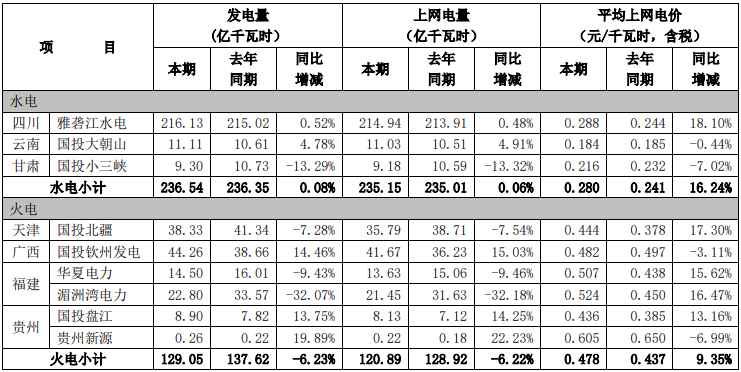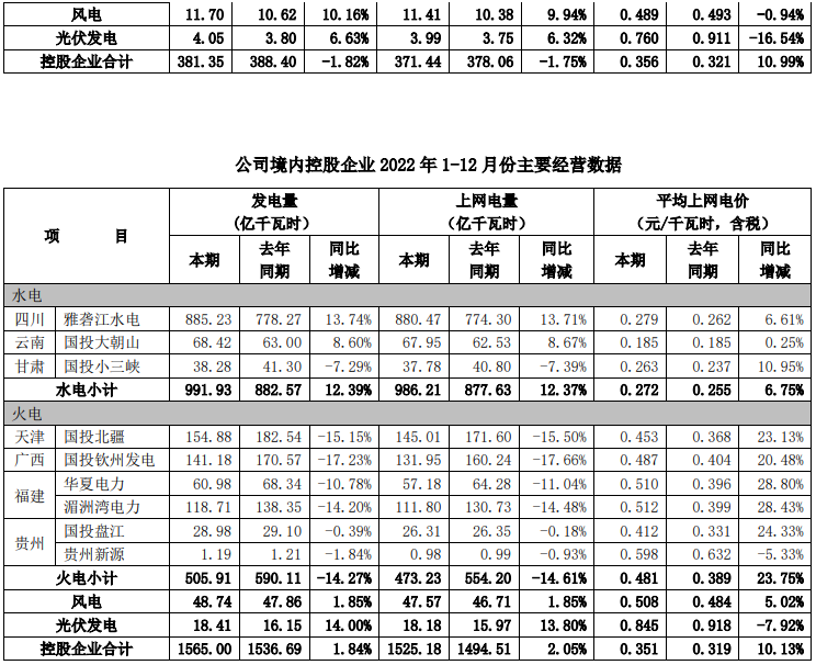 1月11日,國投電力發布2022年四季度主要經營數據公告,根據國投電力境內控股企業初步統計,2022年10-12月,公司境內控股企業累計完成發電量381.35億千瓦時,上網電量371.44億千瓦時,與去年同期相比分別減少1.82%和1.75%。2022年1-12月,公司境內控股企業累計完成發電量1565.00億千瓦時,上網電量1525.18億千瓦時,與去年同期相比分別增加1.84%和2.05%。 2022年10-12月,公司境內控股企業平均上網電價0.356元/千瓦時,與去年同期相比增加 10.99%。2022年1-12月,公司境內控股企業平均上網電價0.351元/千瓦時,與去年同期相比增加10.13%。 公司境內控股企業 2022年10-12月份主要經營數據 裝機量方面,國投電力2022年新增裝機容量154.59萬千瓦,主要為水電、風電、光伏。四季度新增裝機容量77.302萬千瓦,主要為風電、光伏。 注: 2022年四季度境內電廠發電量同比變動情況說明: 1.水電發電量同比增加的主要原因:一是雖然雅礱江流域來水明顯偏枯,但受保供需要以及流域梯級電站優化調度影響,雅礱江水電發電量同比增加;二是雅礱江兩河口水電站、楊房溝水電站投產;三是大朝山水電站受上游水庫庫容消落影響,發電量同比增加。