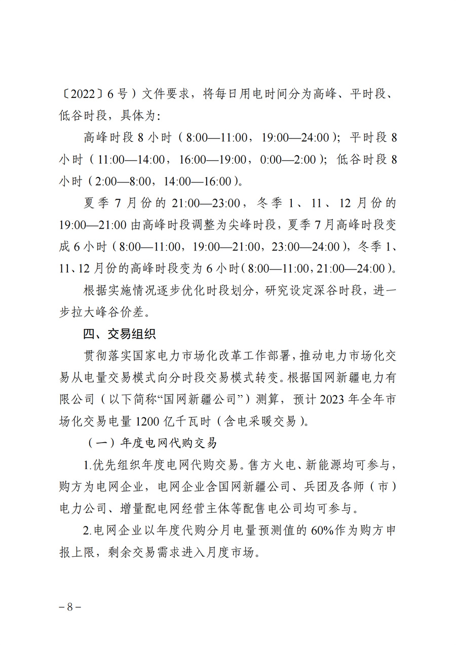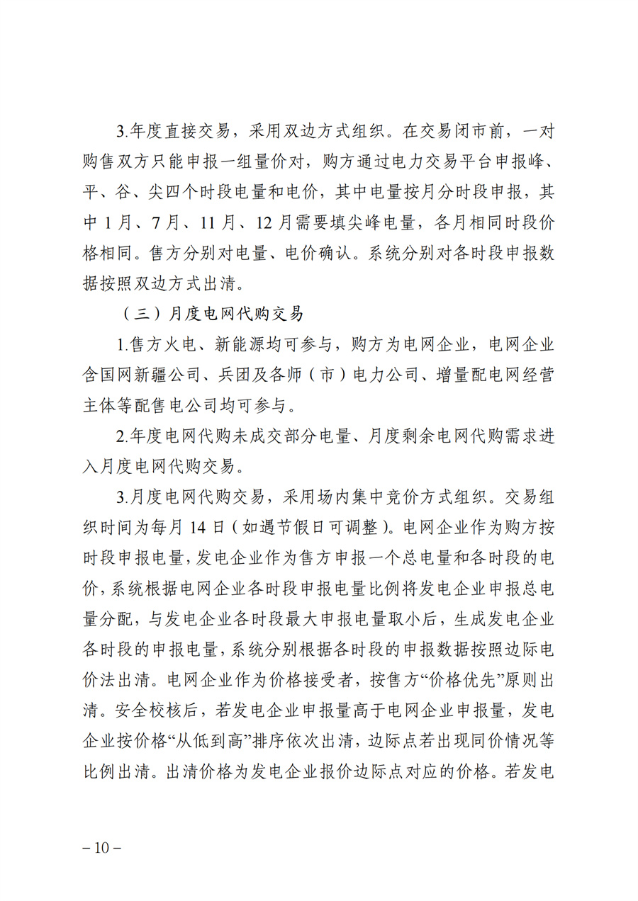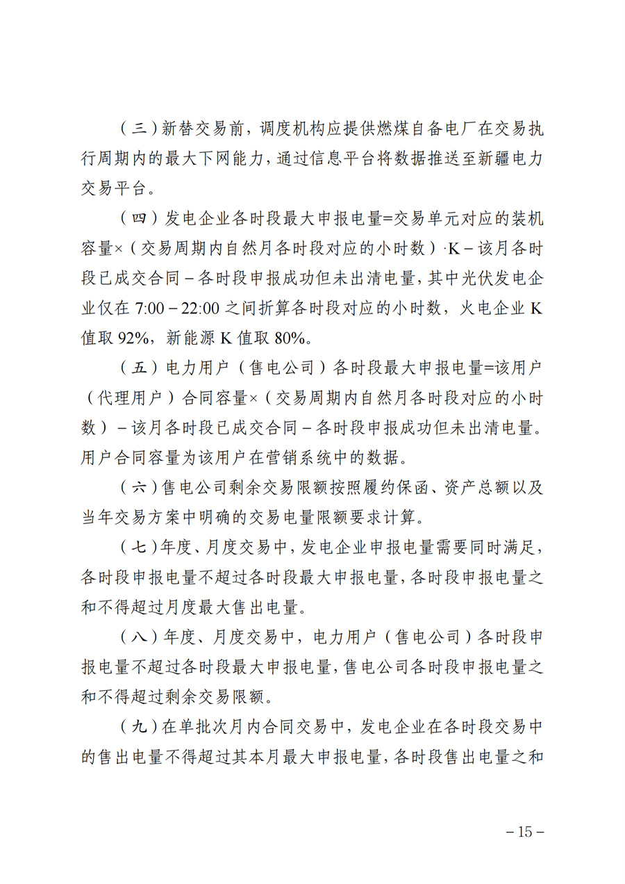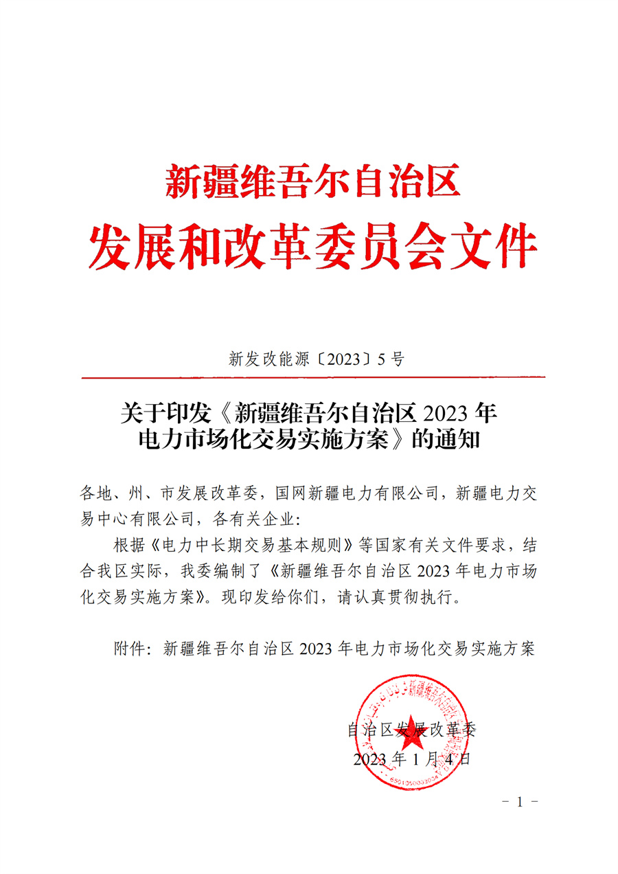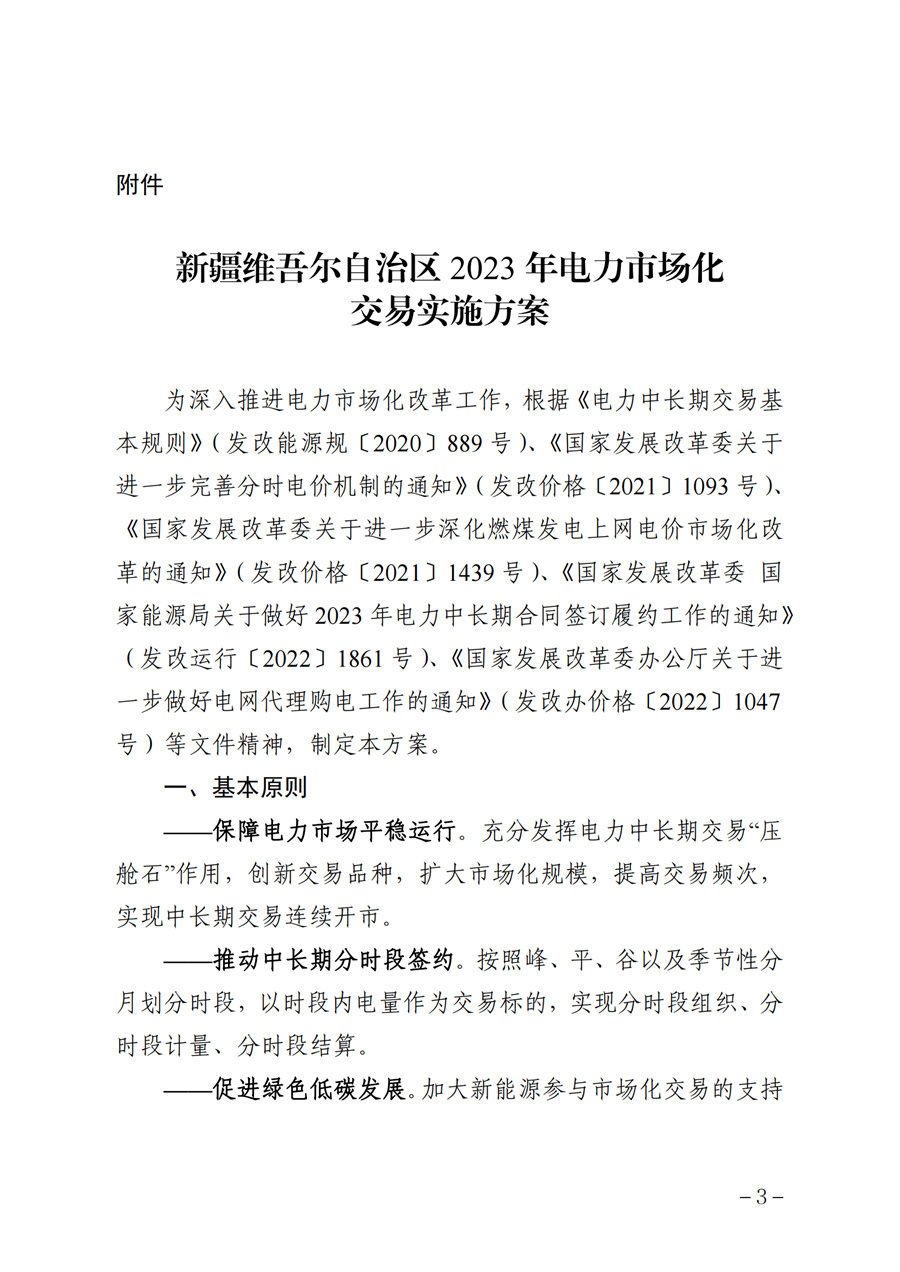 關于印發《新疆維吾爾自治區2023年電力市場化交易實施方案》的通知,通知指出,集中式扶貧光伏、特許權新能源、示范試驗類新能源等實行全額保障性收購,暫不參與新疆電力市場交易。 發電企業各時段最大申報電量=交易單元對應的裝機容量×(交易周期內自然月各時段對應的小時數)·K-該月各時段已成交合同-各時段申報成功但未出清電量,其中光伏發電企業僅在7:00-22:00之間折算各時段對應的小時數,火電企業K值取92%,新能源K值取80%。 原文如下: 關于印發《新疆維吾爾自治區2023年電力市場化交易實施方案》的通知 各地、州、市發展改革委,國網新疆電力有限公司,新疆電力交易中心有限公司,各有關企業: 根據《電力中長期交易基本規則》等國家有關文件要求,結合我區實際,我委編制了《新疆維吾爾自治區2023年電力市場化交易實施方案》。現印發給你們,請認真貫徹執行。 自治區發展改革委 2023年1月4日