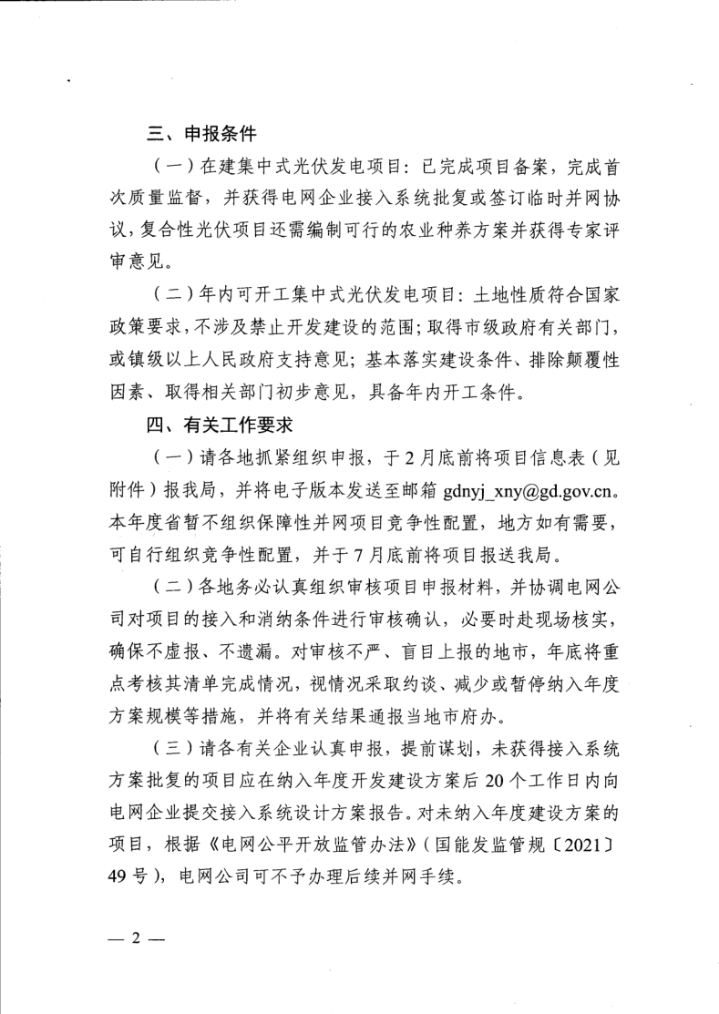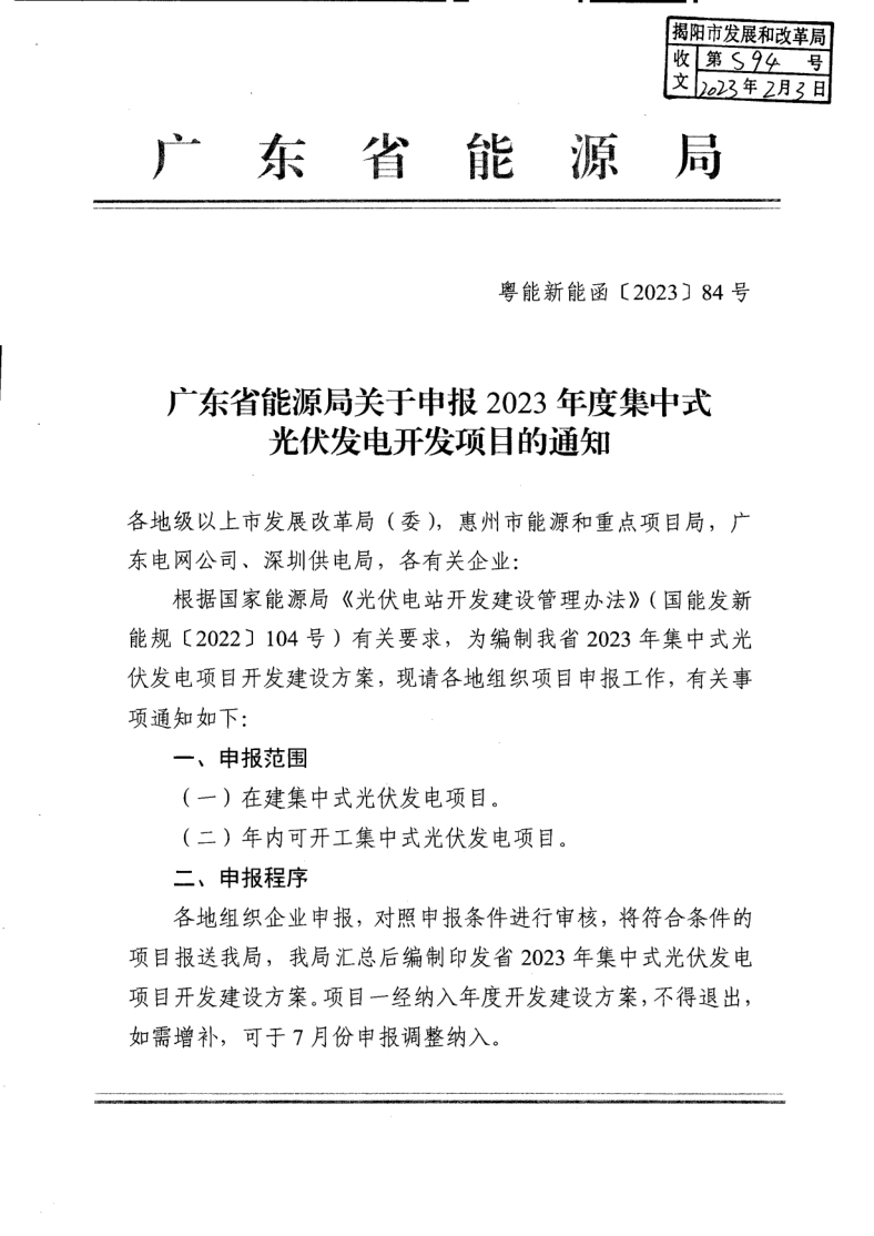 日前,廣東省能源局印發《關于申報2023年度集中式光伏發電開發項目的通知》,通知提出:各地組織企業申報,對照申報條件進行審核,將符合條件的項目報送我局,我局匯總后編制印發省 2023 年集中式光伏發電項目開發建設方案。項目一經納入年度開發建設方案,不得退出如需增補,可于7月份申報調整納入。 (一)在建集中式光伏發電項目: 已完成項目備案,完成首次質量監督,并獲得電網企業接入系統批復或簽訂臨時并網協議,復合性光伏項目還需編制可行的農業種養方案并獲得專家評審意見。 (二)年內可開工集中式光伏發電項目:土地性質符合國家政策要求,不涉及禁止開發建設的范圍; 取得市級政府有關部門或鎮級以上人民政府支持意見; 基本落實建設條件、排除顛覆性因素、取得相關部門初步意見,具備年內開工條件。