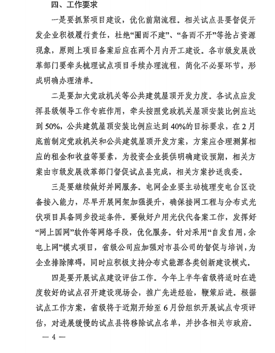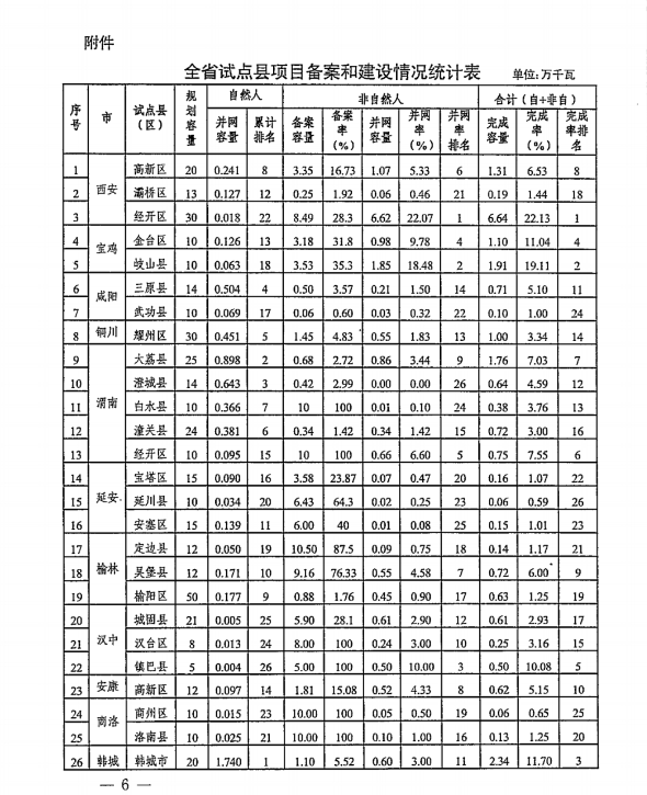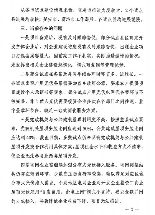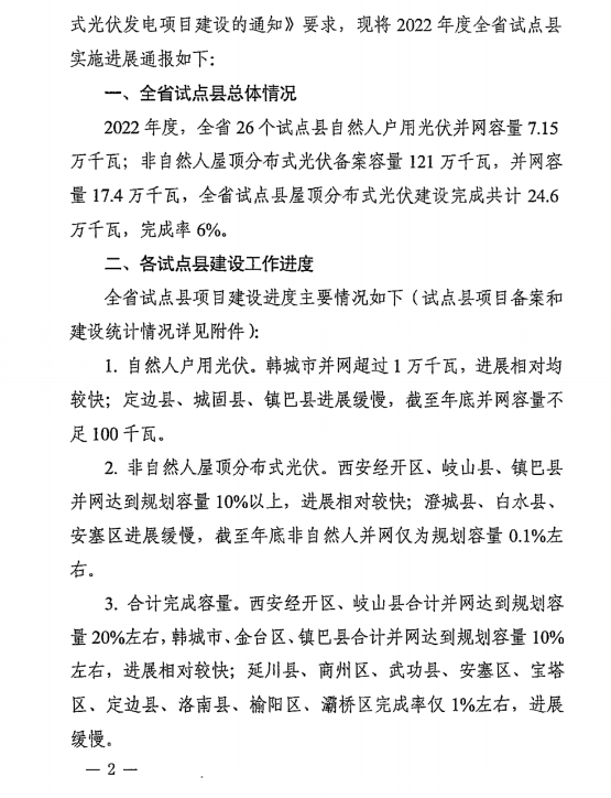 近日,陜西省發改委發布了《關于我省整縣(市、區)推進屋頂分布式光伏發電試點縣2022年度項目建設進展情況》的通報。通報指出,2022年度,全省26個試點縣自然人戶用光伏并網容量7.15 萬千瓦;非自然人屋頂分布式光伏備案容量121萬千瓦,并網容量17.4萬千瓦,全省試點縣屋頂分布式光伏建設完成共計24.6萬千瓦,完成率6%。 從各市試點建設情況來看,寶雞市推進力度較大,2個試點縣進展均較快;延安市、商洛市工作滯后,各試點縣均進展緩慢。具體如下: 1. 自然人戶用光伏。韓城市并網超過1萬千瓦,進展相對均 較快;定邊縣、城固縣、鎮巴縣進展緩慢,截至年底并網容量不足100千瓦。 2. 非自然人屋頂分布式光伏。西安經開區、岐山縣、鎮巴縣 并網達到規劃容量10%以上,進展相對較快;澄城縣、白水縣、 安塞區進展緩慢,截至年底非自然人并網僅為規劃容量0.1%左右。 3. 合計完成容量。西安經開區、岐山縣合計并網達到規劃容 量20%左右,韓城市、金臺區、鎮巴縣合計并網達到規劃容量10% 左右,進展相對較快;延川縣、商州區、武功縣、安塞區、寶塔 區、定邊縣、洛南縣、榆陽區、灞橋區完成率僅1%左右,進展緩慢。 陜西發改委表示,當前存在項目備案后,沒有及時跟蹤督促;部分試點在備案及并網手續辦理時環節多、流程長;黨政機關與公共建筑屋頂利用度不高;電網企業需繼續加強分布式光伏接入服務等問題。 2月22日,陜西省榆林市發改委轉發了文件,并對存在問題提出如下要求: 一、加快備案,抓緊推進項目建設。各區縣要加快梳理項目手續辦理清單,抽調專人辦公,提供“一站式”服務。督促開發企業在項目備案后兩個月內必須開工建設,抓緊推進項目建設。 二、加大黨政機關等公共建筑屋頂開發力度。按照整縣試點要求,黨政機關屋頂光伏安裝比例應達到50%,公共建筑屋頂光伏安裝比例應達到40%,各縣區要在2月底前制定黨政機關和公共建筑屋頂開發方案,向我委報備留檔。 三、做好并網保障服務。國網榆林供電公司要督促各縣區供電局及時受理并網申請,確保屋頂分布式光伏項目全部及時并網。 四、開展試點建設專項評估。根據試點工作方案,省上將于近期組織開展試點專項評估工作,請各縣區先行組織開展專項評估,于3月中旬將評估結果報送榆林市發改委。