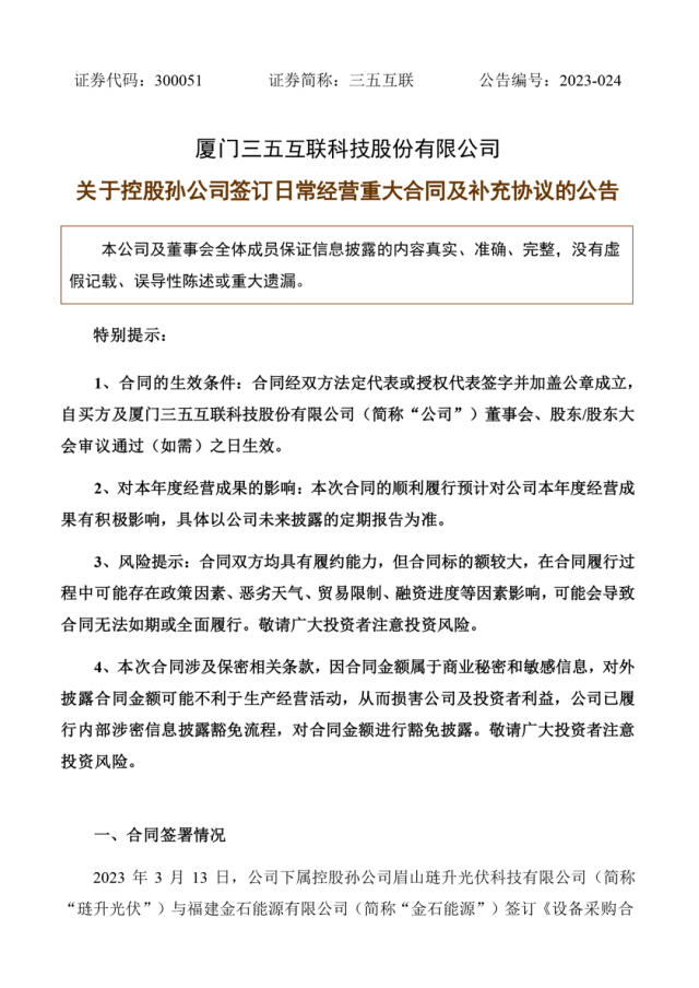3月(yue)14日,上市公司廈門(men)三(san)五互聯科技股份有限(xian)公(gong)司(si)發布了《關(guan)于控股孫(sun)公(gong)司(si)簽訂日(ri)常經營重大合同及補充協議的公(gong)告》,公(gong)告的主(zhu)要(yao)事(shi)項為2GW高效異質結(HJT)太陽(yang)能電池生產(chan)線合同簽(qian)署: 2023 年(nian) 3 月 13 日,公(gong)司下屬(shu)控(kong)股孫(sun)公(gong)司眉山璉升光伏科技有(you)限公(gong)司(簡稱“璉升光伏”)與(yu)福建金石(shi)能(neng)(neng)源(yuan)(yuan)有(you)限(xian)公司(si)(簡稱(cheng)“金石(shi)能(neng)(neng)源(yuan)(yuan)”)簽(qian)訂(ding)《設備采購合(he)同(tong)》及《〈設備采購合(he)同(tong)〉補充協議(yi)》,璉(lian)升光伏擬向金石(shi)能(neng)(neng)源(yuan)(yuan)購買高效異質結(HJT)太陽能(neng)(neng)電(dian)池生(sheng)產線 2 條(tiao),產能(neng)(neng)為(wei) 1GW/條(tiao),共計 2GW。上述設備采購合(he)同(tong)屬(shu)于日常經營(ying)性重大合(he)同(tong),合(he)同(tong)金額合(he)計超(chao)過公司(si) 2021 年經審(shen)計營(ying)業收入的 100%且合(he)同(tong)絕對金額超(chao)過 2 億元(yuan)。 對于此次合(he)同(tong)簽署,公告第六項(xiang)(xiang)“董事會說(shuo)(shuo)明(ming)”給(gei)予的說(shuo)(shuo)明(ming)如下:公司(si)本次購買高效(xiao)異(yi)質結(jie)(HJT)太陽能(neng)電池生產設備(bei),有利(li)于推動公司(si)在高效(xiao)異(yi)質結(jie)(HJT)太陽能(neng)電池領域項(xiang)(xiang)目的建設進度,符(fu)合(he)公司(si)戰略發展需(xu)要(yao)。公司(si)與(yu)金石能(neng)源資信良好,均有較強的履(lv)約能(neng)力,能(neng)夠按照合(he)同(tong)約定履(lv)行各方義務。 公告中的(de)“合同對公司的(de)影響”項,也對合同簽(qian)署給予了積極的(de)評價(jia): 1、本次生(sheng)產設備系高(gao)(gao)效異質(zhi)結(jie)(HJT)太(tai)陽能(neng)電池(chi)關鍵生(sheng)產設備的采購,將有效推進公(gong)司高(gao)(gao)效異質(zhi)結(jie)(HJT)太(tai)陽能(neng)電池(chi)項目的建設,對促使項目達產有積極影響。 2、本次合同的順利履行預計對公司本年度(du)經(jing)營(ying)成(cheng)果有積(ji)極影(ying)響。 據悉,廈門三五互聯科技(ji)股份有(you)限(xian)公(gong)司(si)成立于2004年(nian)(nian),是中國首家基于“云計算”的企(qi)業(ye)信息(xi)化(hua)服務類(lei)創業(ye)板上市公(gong)司(si),也是福(fu)建(jian)省(sheng)首家創業(ye)板上市公(gong)司(si),是2010年(nian)(nian)度(du)、2011~2012年(nian)(nian)度(du)國家規劃布局內重點軟件企(qi)業(ye),2022年(nian)(nian)進入光(guang)伏新能源(yuan)領域。 金石能源是(shi)高(gao)(gao)效異質(zhi)(zhi)(zhi)結(jie)(jie)裝備(bei)與技術(shu)服務商,擁有(you)200多(duo)項專利技術(shu),公(gong)(gong)司于2022年推出的單(dan)線1GW產(chan)能高(gao)(gao)效異質(zhi)(zhi)(zhi)結(jie)(jie)(HJT)太(tai)陽(yang)能電池(chi)(chi)生產(chan)線,單(dan)線產(chan)能、量產(chan)平均效率(lv)、產(chan)品良率(lv)、設(she)備(bei)利用率(lv)等(deng)各項指標均居行業前列。截至目前,公(gong)(gong)司已經為多(duo)家光(guang)伏(fu)龍頭企(qi)(qi)業、上市公(gong)(gong)司提供優(you)質(zhi)(zhi)(zhi)的高(gao)(gao)效異質(zhi)(zhi)(zhi)結(jie)(jie)(HJT)太(tai)陽(yang)能電池(chi)(chi)生產(chan)設(she)備(bei)及技術(shu)服務,獲得了客戶和市場(chang)的一致(zhi)好評,金石能源期待攜手更多(duo)卓(zhuo)越企(qi)(qi)業共同(tong)致(zhi)力于高(gao)(gao)效異質(zhi)(zhi)(zhi)結(jie)(jie)(HJT)太(tai)陽(yang)能電池(chi)(chi)產(chan)業的發展,推動(dong)全球綠(lv)色能源事(shi)業的發展。