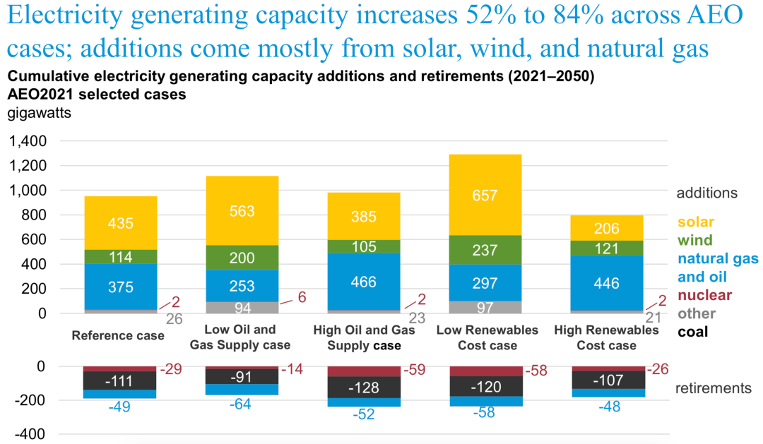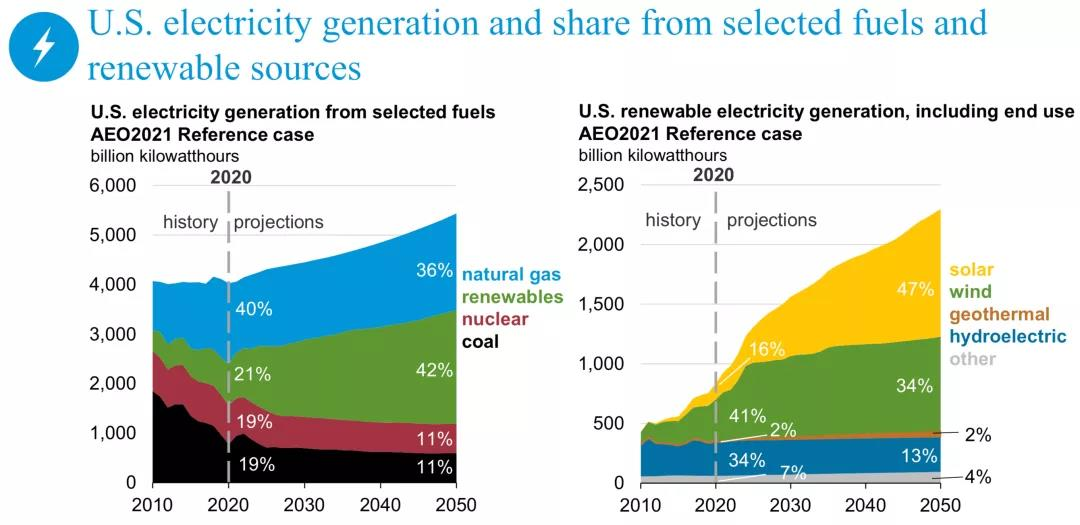 美(mei)國能源信息署(EIA)發布最新能源展望報告,在(zai)“參考情(qing)景”(按市(shi)場趨勢(shi)最可能發生的情(qing)景),2021-2050年美(mei)國發電裝機光伏裝(zhuang)機(ji)凈增435吉(ji)(ji)瓦,風電(dian)(dian)裝(zhuang)機(ji)增114吉(ji)(ji)瓦,燃氣(油(you))發電(dian)(dian)裝(zhuang)機(ji)增375吉(ji)(ji)瓦,核電(dian)(dian)增2吉(ji)(ji)瓦,其他電(dian)(dian)源(yuan)增26吉(ji)(ji)瓦。煤電(dian)(dian)退(tui)(tui)(tui)役111吉(ji)(ji)瓦、天然氣(油(you))發電(dian)(dian)退(tui)(tui)(tui)役49吉(ji)(ji)瓦、核電(dian)(dian)退(tui)(tui)(tui)役29吉(ji)(ji)瓦。 2020年(nian)美(mei)國發(fa)電(dian)量(liang)的(de)構成為(wei):天然氣40%、可再(zai)生能源(yuan)(yuan)21%、核電(dian)19%、煤電(dian)19%。在參考(kao)情(qing)景下(xia),美(mei)國到(dao)2050年(nian)發(fa)電(dian)量(liang)的(de)構成為(wei):天然氣36%、可再(zai)生能源(yuan)(yuan)42%、核電(dian)11%、煤電(dian)11%。也(ye)就是說,如(ru)果沒(mei)有強力(li)的(de)政策鼓(gu)勵和(he)高水平的(de)碳價,到(dao)2050年(nian)美(mei)國電(dian)力(li)量(liang)中(zhong)化石能源(yuan)(yuan)電(dian)源(yuan)(yuan)仍占47%。 2020年(nian)可再生(sheng)能(neng)源發電(dian)(dian)比例為:風(feng)電(dian)(dian)41%、水(shui)電(dian)(dian)24%、太(tai)陽能(neng)16%、地熱2%、其他(ta)7%。2050年(nian)可再生(sheng)能(neng)源發電(dian)(dian)比例為:太(tai)陽能(neng)47%、風(feng)電(dian)(dian)34%、水(shui)電(dian)(dian)13%、地熱2%、其他(ta)4%。