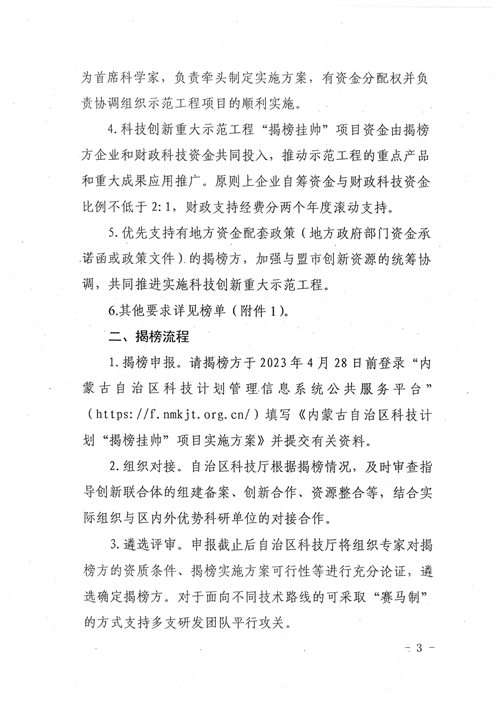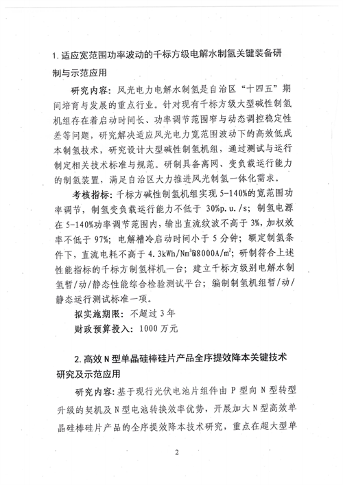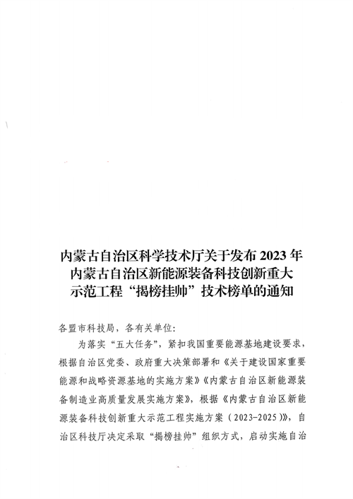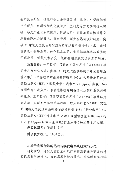 4月3日,呼和浩特市科學技術局關于轉發《關于發布2023年內蒙古自治區新能源裝備科技創新重大示范工程“揭榜掛帥”技術榜單的通知》。其中,高效N型單晶硅棒硅片產品全序提效降本關鍵技術研究及示范應用(財政預算投入:1000萬元) 研究內容:基于現行光伏電池片組件由P型向N型轉型升級的契機及N型電池轉換效率優勢,開展加大N型高效單晶硅棒硅片產品的全序提效降本技術研究,重點在超大型單晶爐熱場開發、低能耗熱力場設計及推廣示范、N型超低氧技術研究、金剛線細線化及切片工藝研發等方向實現技術突破,形成產業化示范應用。 圍繞大尺寸N型單晶硅棒硅片全序提效降本關鍵技術,重點開展:超大型熱場設計研發,突破37吋超大型熱場開發應用及單爐投料量4-5t技術;通過重新設計熱場系統,優化拉晶工藝,實現低功耗熱場系統的示范應用;低氧技術研究;超細金剛線及其切片工藝研發。 預期目標: 一年目標:以高效N型大尺寸(≥182mm)單晶硅片為研究基礎,實現37吋超大型熱場的小中試應用及量產推廣,單晶硅單爐投料量突破至4-5t;大熱場單晶硅棒等徑功率≤45KW,N型氧含量中試水平≤10ppma,實現32um金剛線的中試應用,單晶硅棒硅片制備技術達到行業絕對領先能力。 三年目標:以N型高效大尺寸(≥182mm)單晶硅片為基礎,實現N型高效單晶硅棒、硅片年產能≥15GW;實現37吋超大型熱場單晶硅棒單爐投料量4-5t(行業水平3t),等徑功率≤40KW(行業水平65KW),N型氧含量≤10ppma(行業水平12ppma),30um金剛線(行業水平34um)的量產應用。 原文見下: 關于發布2023年內蒙古自治區新能源裝備科技創新重大示范工程“揭榜掛帥”技術榜單的通知