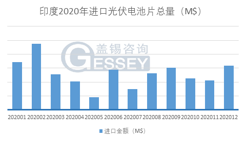 蓋錫咨詢最(zui)新報告(gao)顯示,2020年(nian),印(yin)度全年(nian)進口(kou)光伏電池片(pian)156百(bai)萬美元,其中12月進口(kou)總金額15.9百(bai)萬美元,環比2020年(nian)11月上升52%。