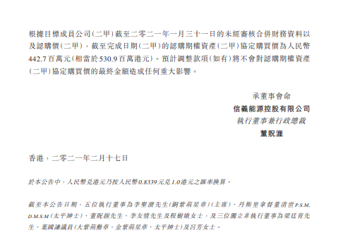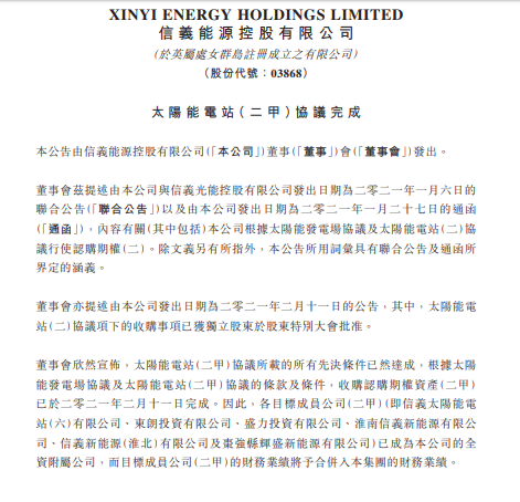 2月17日,信義能源發布《太陽能電站( 二 甲 )協議完成》的公告,宣布太陽能電站(二甲)協議所載的所有先決條件已然達成,根據太陽能發電場協議及太陽能電站(二甲)協議的條款及條件,收購認購期權資產(二甲)已于2021年2月11日完成。因此,各目標成員公司(二甲)(即信義太陽能電站(六)有限公司、東朗投資有限公司、盛力投資有限公司、淮南信義新能源有限公司、信義新能源(淮北)有限公司及棗強縣輝盛新能源有限公司)已成為本公司的全資附屬公司,而目標成員公司(二甲)的財務業績將予合并入本集團的財務業績。 根據目標成員公司(二甲)截至2021年1月21日的未經審核合併財務資料以及認購價(二甲),截至完成日期(二甲)的認購期權資產(二甲)協定購買價為人民幣442.7百萬元(相當于530.9百萬港元)。預計調整款項(如有)將不會對認購期權資產(二甲)協定購買價的最終金額造成任何重大影響。 公告原文如下: