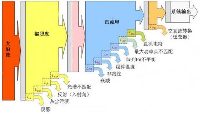 光(guang)伏發電系(xi)統效率受(shou)外界影(ying)響有(you)所(suo)損(sun)(sun)失,包括遮擋(dang)、灰(hui)塵、組件衰減、溫度影(ying)響、組件匹配、MPPT精度、逆(ni)變(bian)器效率、直流和交(jiao)流線路(lu)損(sun)(sun)失等(deng),如下(xia)圖所(suo)示: 每(mei)個因素對(dui)效率的(de)影響(xiang)也不同,在項目前期要(yao)注意(yi)系統(tong)的(de)最優化設(she)計,項目運行過程采取一(yi)定的(de)措施減少灰塵等遮(zhe)擋對(dui)系統(tong)的(de)影響(xiang)。 上一篇: 全球首條1GW鈣鈦礦產業基地項目開工