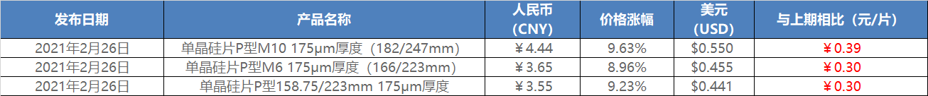 2021年2月26日隆基單晶硅片價格公示注: 美金價格以隆(long)基設(she)定平(ping)均(jun)匯(hui)率換算(suan) 免責聲明:Gesse蓋(gai)錫(xi)咨詢(xun)力求提(ti)供的(de)(de)信(xin)息(xi)準(zhun)確、信(xin)息(xi)所述內容(rong)及觀點(dian)的(de)(de)客(ke)觀公(gong)正,但(dan)并(bing)不(bu)保(bao)證其是否(fou)需要進行必要變(bian)更(geng)。Gesse蓋(gai)錫(xi)咨詢(xun)提(ti)供的(de)(de)信(xin)息(xi)僅供客(ke)戶(hu)決(jue)策(ce)參(can)考,并(bing)不(bu)構成對客(ke)戶(hu)決(jue)策(ce)的(de)(de)直接建議(yi),客(ke)戶(hu)不(bu)應以(yi)此取代自己(ji)的(de)(de)獨立判(pan)斷,客(ke)戶(hu)做出(chu)的(de)(de)任(ren)何決(jue)策(ce)與Gessey蓋(gai)錫(xi)咨詢(xun)無關。