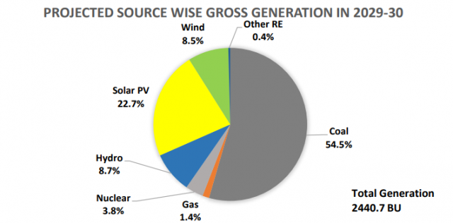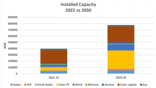 根據印(yin)度(du)中央(yang)電力(li)局(ju)(CEA)的(de)預(yu)測,到2029~2030財年,印(yin)度(du)將累計安(an)裝292.6GW的(de)光伏系(xi)統,其裝機容量將超(chao)過276.5GW的化石燃料(liao)發(fa)電(dian)(dian)(dian)設施(251.7GW的燃煤發(fa)電(dian)(dian)(dian)廠和24.8GW的天然氣(qi)發(fa)電(dian)(dian)(dian)廠)。 印度(du)中央電力局(CEA)在一(yi)份關于印度(du)最佳發電能力組合(he)的報告中公布了這一(yi)預測。 該機(ji)構表示(shi),預(yu)計到(dao)2030財年(nian),印(yin)度(du)累計安(an)裝(zhuang)的(de)(de)化石燃料發電設施裝(zhuang)機(ji)容(rong)量占總裝(zhuang)機(ji)容(rong)量的(de)(de)份額將從目前(qian)的(de)(de)59%降到(dao)35.5%。與此同時,印(yin)度(du)累計安(an)裝(zhuang)的(de)(de)可再生能源裝機容量份額預計將從總裝機容量的(de)41%增加到62.4%。 到2030年,印(yin)度電力行(xing)業的發電設施總裝機容量預計將達到777GW,其中光伏系統為292.6GW,風(feng)力發電設施為100GW,水(shui)電設施為53.9GW,抽水(shui)蓄能(neng)發電設施為18.9GW,生物質能(neng)發電設施14.5GW,電池(chi)儲能系統為(wei)41.7GW/208.3GWh。 預計(ji)燃煤發電廠將達到251.7GW,天然氣發電設(she)施為24.8GW,核電設(she)施為15.5GW。 到2030年,即使可再生(sheng)能源發電(dian)設施的(de)發電(dian)量(liang)(liang)將(jiang)(jiang)高(gao)于化石燃(ran)料設施的(de)發電(dian)量(liang)(liang),燃(ran)煤發電(dian)仍(reng)將(jiang)(jiang)是(shi)主要的(de)發電(dian)來源,占54.5%。 截至2023年(nian)第一季度末,印度包括(kuo)大型水電項目在內的(de)可再生能源發(fa)電設施(shi)裝機容量(liang)為(wei)170.32GW,占(zhan)整體(ti)電力裝機容量(liang)的(de)41%。 該報告還預測,到(dao)2029~2030財年,印度(du)的電力需求將(jiang)達到(dao)22796.2億單位(BU)。 到2030財(cai)年,預計(ji)印(yin)度的總發電(dian)(dian)(dian)量為2440.7 BU,其中(zhong)化石燃料(煤(mei)、天然氣(qi)和褐煤(mei))總發電(dian)(dian)(dian)量為1364.5BU,可再生(sheng)能源發電(dian)(dian)(dian)量為984 BU,核電(dian)(dian)(dian)設施發電(dian)(dian)(dian)量為92.2 BU。 非化(hua)石燃(ran)料設(she)施發(fa)電量(liang)預計將在(zai)2030財年(nian)占總發(fa)電量(liang)的44%左右。 光伏系統和風力(li)發電(dian)設施(shi) 到2030年,印度需(xu)要增加180.4GW的(de)可再(zai)生能源,其(qi)(qi)中(zhong)包括145.9GW的(de)光伏系(xi)統和34.5GW的(de)風力發(fa)電設(she)施(shi)。此(ci)外,目前(qian)處于規劃或實施(shi)階段有117GW,其(qi)(qi)中(zhong)光伏系(xi)統為92.5GW,風力發(fa)電設(she)施(shi)為25GW。 到2030財年,電(dian)(dian)動(dong)汽車的日益普及(ji)預(yu)計將使印度的電(dian)(dian)力(li)(li)需求增加(jia)15BU。據估計,屋頂(ding)光(guang)(guang)伏(fu)系(xi)統可以(yi)提供34.8 BU的電(dian)(dian)力(li)(li),而(er)光(guang)(guang)伏(fu)水泵估計提供的電(dian)(dian)力(li)(li)將達到2.4 BU。 預計印(yin)度到2030財年(nian)光伏系(xi)統(tong)和風(feng)力發電設施的容量(liang)利(li)用率(lv)分別為22.97%和40.8%。 電池儲能系統 印度到2029~2030財(cai)年安裝的儲(chu)能(neng)系(xi)統(tong)裝機容量可能(neng)達到60.63 GW (抽(chou)水蓄能(neng)發電(dian)設施為18.98GW,電(dian)池儲(chu)能(neng)系(xi)統(tong)為41.65GW),總儲(chu)能(neng)容量為336.4GWh (抽(chou)水蓄能(neng)發電(dian)設施為128.15 GW,電(dian)池儲(chu)能(neng)系(xi)統(tong)為208.25GWh)。 目前印度累計安裝的抽(chou)(chou)水(shui)蓄(xu)(xu)能(neng)發(fa)電(dian)設(she)施裝機(ji)容量為4746MW,還有總計2780MW的抽(chou)(chou)水(shui)蓄(xu)(xu)能(neng)發(fa)電(dian)設(she)施正(zheng)在建設(she)中,到2030年可能(neng)開通(tong)運營。除了這些項目外(wai),到2030年還需(xu)(xu)要11,460MW的抽(chou)(chou)水(shui)蓄(xu)(xu)能(neng)發(fa)電(dian)設(she)施滿足該國的儲能(neng)需(xu)(xu)求(qiu)。 水電(包括抽水蓄能發電設施) 根據(ju)印度中央電力局(CEA)的(de)最新評估(gu),印度目(mu)前(qian)(qian)正在建(jian)設的(de)水電設施的(de)裝機容量為14,274MW(包括(kuo)2,780MW的(de)抽水蓄(xu)能發電設施),將在2030財年之前(qian)(qian)開通運營。 此外,638MW的特定地點水(shui)電項目和(he)11460MW的抽水(shui)蓄能發電設施都有可能在2030財(cai)年(nian)之前開通運營。 核電設施 根據印(yin)度原子能部的最新評估(gu),印(yin)度目前正在建(jian)設的核電設施裝機容(rong)量為(wei)8700MW,新增7GW裝機容(rong)量在原則上(shang)已經獲得批準。 燃煤發電設施 到2030財年,預計印度(du)將有大約26900MW的燃煤發電(dian)廠投(tou)入使用(yong)。 印度聯邦和各(ge)邦公(gong)用(yong)事業公(gong)司正在(zai)開發(fa)或提議建(jian)設的(de)燃(ran)煤發(fa)電廠的(de)裝機容量總計為21,240MW。其中,6,920MW目前(qian)正在(zai)競標中。 此外,如有需要,印度聯邦(bang)和各(ge)邦(bang)公用事(shi)業部門還(huan)將新增9,420MW的(de)燃煤發電設(she)施。每座燃煤發電廠的(de)平均(jun)資本支出(chu)為8340萬盧比/MW (約102萬美元/MW),高(gao)于早(zao)期研究中的(de)7850萬盧比/MW (約960,697美元/MW)。 此外,由(you)于不符合要(yao)求(qiu)安(an)裝(zhuang)煙(yan)氣(qi)脫硫系統的(de)(de)新(xin)環(huan)境改(gai)革要(yao)求(qiu),總共有2121.5MW的(de)(de)燃煤發電設施(shi)可能會被淘汰。 二氧化碳排放量 印(yin)度的二(er)(er)氧化碳排放(fang)總(zong)量從2020~2021財年的9.1億噸(dun)增(zeng)(zeng)加到2021~22年的10. 02億噸(dun)。根據預測,到2029~2030財年,印(yin)度電(dian)力部門(men)的二(er)(er)氧化碳排放(fang)量可能(neng)會增(zeng)(zeng)加到11.14億噸(dun) 印(yin)