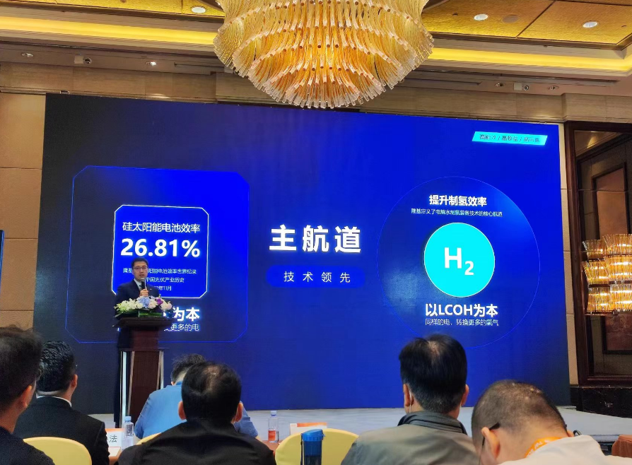 隆基氫能科技有限公司 康凱 “綠電+綠氫是實現碳中和的有力武器” 隆基氫(qing)(qing)能(neng)致(zhi)力于成(cheng)為全球領(ling)先的大型電解水制氫(qing)(qing)裝備(bei)商。2021年12月31日實現500MW產能(neng),2022入圍(wei)我國首(shou)個(ge)萬噸級綠(lv)顯示(shi)范(fan)項目,2025規劃產能(neng)5-10GW。隆基目前已經建設了(le)十多個(ge)體系認(ren)證,包括ISO、CE-PED ASME等,可(ke)靠性(xing)實驗(yan)驗(yan)證內部可(ke)檢測率≥60%,也完成(cheng)了(le)全球第一個(ge)自動化(hua)生產線(xian)。隆基氫(qing)(qing)能(neng)以高效(xiao)率材料大幅度降低過點位損耗(hao),通(tong)過流(liu)場(chang)優(you)化(hua)和(he)結(jie)構優(you)化(hua)去降低歐姆(mu)損耗(hao),電力成(cheng)本占制氫(qing)(qing)LCOH最(zui)大權(quan)重在主流(liu)場(chang)景下達70%,硅太陽能(neng)電池效(xiao)率達26.81%。