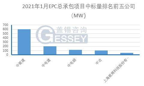 來(lai)源(yuan):蓋錫咨(zi)詢 2021年1月(yue)EPC總承包項(xiang)目中(zhong)標量排(pai)名(ming)(ming)前五(wu)公司(si)(si)詳細描述。EPC總承包中(zhong)標量排(pai)名(ming)(ming)第(di)(di)一的是(shi)中(zhong)能建,占1月(yue)EPC總承包中(zhong)標量的55%左右,第(di)(di)二為中(zhong)電(dian)建。第(di)(di)三(san)則是(shi)中(zhong)電(dian)顧。其次是(shi)中(zhong)冶和上海能輝科技股份有(you)限公司(si)(si)。 來(lai)源:蓋(gai)錫(xi)咨詢