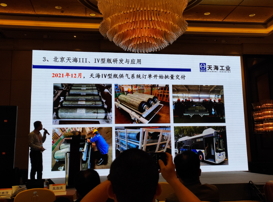 北京天海 張增營先生 “車載高壓儲氫技術發展與應用” 講述了(le)北京天海III、IV型(xing)瓶研發進(jin)展。目前天海工業已完成多(duo)款產(chan)品(pin)(pin)的研制,取得了(le)國內認證和多(duo)項(xiang)國際(ji)認證包(bao)括:ECE R110、ISO 11439、EC79等。產(chan)品(pin)(pin)容積范(fan)圍58-1080L,壓(ya)力等級20-70MPa,直徑范(fan)圍356-910mm。 天海(hai)IV型瓶于2021年(nian)(nian)12月交付(fu)訂單,于2022年(nian)(nian)10月開始裝車(che)。2023年(nian)(nian)3月,天海(hai)IV型瓶0MPa-1080L*2瓶組(zu)車(che)載(zai)供(gong)(gong)氣(qi)系統整車(che)取得公告,相比目前的260L*8瓶組(zu)供(gong)(gong)氣(qi)系統減重(zhong)約650kg,為(wei)重(zhong)卡行業提供(gong)(gong)了輕(qing)量化解決方案。