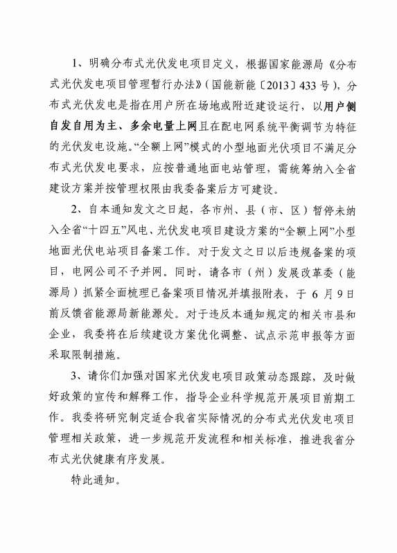 近日,湖南省發(fa)改委發(fa)布(bu)《湖南省發(fa)展和改革委員會關于規范光(guang)伏(fu)(fu)發(fa)電項(xiang)目備案管理有關事(shi)項(xiang)的通知(zhi)》,通知(zhi)表(biao)示(shi),暫停(ting)未納入全(quan)省“十四五”風(feng)電、光(guang)伏(fu)(fu)發(fa)電項(xiang)目建設方案的“全(quan)額(e)上(shang)網”小型地面光(guang)伏(fu)(fu)電站項(xiang)目備案工作(zuo)。 為(wei)整治部分小型地面光(guang)伏(fu)電(dian)站以分布式(shi)光(guang)伏(fu)名義備(bei)案和(he)建設(she),存在爭(zheng)搶土地資源(yuan)和(he)消納空間、項目“化整為(wei)零”逃避集中(zhong)監(jian)管(guan)等亂象,科(ke)學規范(fan)推進光(guang)伏(fu)項目開發政策。 1.“全額上(shang)網”模式(shi)的小型地面光伏項目不滿足分布(bu)式(shi)光伏發電(dian)要(yao)求,應按普通地面電(dian)站管(guan)理,需統(tong)籌納入(ru)全省建(jian)設(she)方(fang)案并按管(guan)理權限由我委(wei)備(bei)案后方(fang)可建(jian)設(she) 2.自本通知發文(wen)之日(ri)起,各市州、縣(市、區)暫停(ting)未納入全省“十四五”風(feng)電、光伏發電項(xiang)(xiang)目(mu)建設方案(an)(an)的“全額上網”小(xiao)型(xing)地(di)面光伏電站項(xiang)(xiang)目(mu)備案(an)(an)工作。對于(yu)發文(wen)之日(ri)以后違(wei)規(gui)備案(an)(an)的項(xiang)(xiang)目(mu),電網公司不予并網。 3.我(wo)委(wei)將研究制(zhi)定適合我(wo)省(sheng)實(shi)際情況的分布式(shi)光伏(fu)發電項目管理相關政策,進一步規范開(kai)發流程和相關標準,推進我(wo)省(sheng)分布式(shi)光伏(fu)健康有序發展。 原文如下: