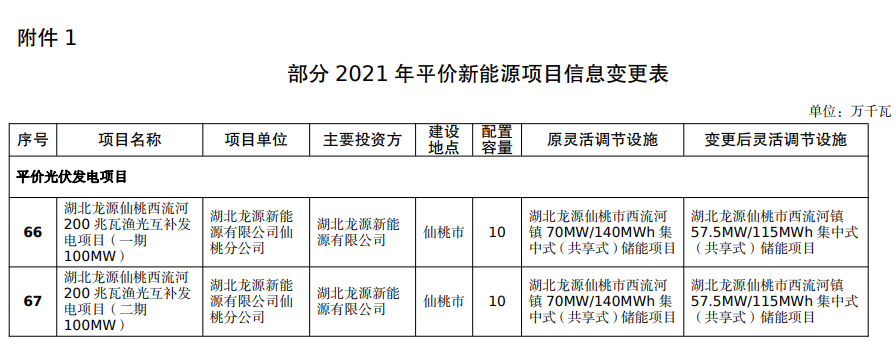 6月(yue)19日,湖北(bei)省發改(gai)委發布關于湖北龍源新能(neng)源有(you)限公(gong)司有(you)關新能(neng)源項(xiang)目信息變更(geng)的函,同(tong)時將湖北龍源荊州區菱角湖80兆瓦農(漁)光互補(bu)光伏發電項(xiang)目從2021年度建設項(xiang)目清單中取(qu)消等(deng)。 原文見下: 關于湖北龍源新能源有限公司有關新能源項目信息變更的函 湖北(bei)龍源(yuan)新能源(yuan)有限公司: 你公司《關于減容仙(xian)桃西(xi)流河儲能(neng)項目并取消荊州(zhou)區(qu)菱(ling)角湖光(guang)伏(fu)項(xiang)(xiang)目(mu)(mu)指標的(de)(de)請(qing)示》(湖(hu)北(bei)龍源(yuan)(yuan)〔2023〕23號)收悉,經研究,同意對《湖(hu)北(bei)省能源(yuan)(yuan)局關(guan)于公布2021年平價(jia)新能源(yuan)(yuan)項(xiang)(xiang)目(mu)(mu)的(de)(de)通知》(鄂能源(yuan)(yuan)新能〔2021〕53號)中相關(guan)項(xiang)(xiang)目(mu)(mu)信(xin)息(xi)(xi)進行變更(geng),同時將湖(hu)北(bei)龍源(yuan)(yuan)荊州(zhou)區菱角(jiao)湖(hu)80兆瓦(wa)農(nong)(漁)光(guang)互補(bu)光(guang)伏(fu)發電項(xiang)(xiang)目(mu)(mu)從2021年度建設(she)項(xiang)(xiang)目(mu)(mu)清(qing)單中取(qu)消(xiao)。有關(guan)項(xiang)(xiang)目(mu)(mu)信(xin)息(xi)(xi)具體變更(geng)情況見附件。 請(qing)據此安(an)排后續(xu)相關工作。 附件: 1.部分2021年平價新能源(yuan)項目(mu)信息變更表(biao) 2.部(bu)分2021年集中(zhong)式(shi)(共享(xiang)式(shi))化學儲能電站信(xin)息變更表(biao)