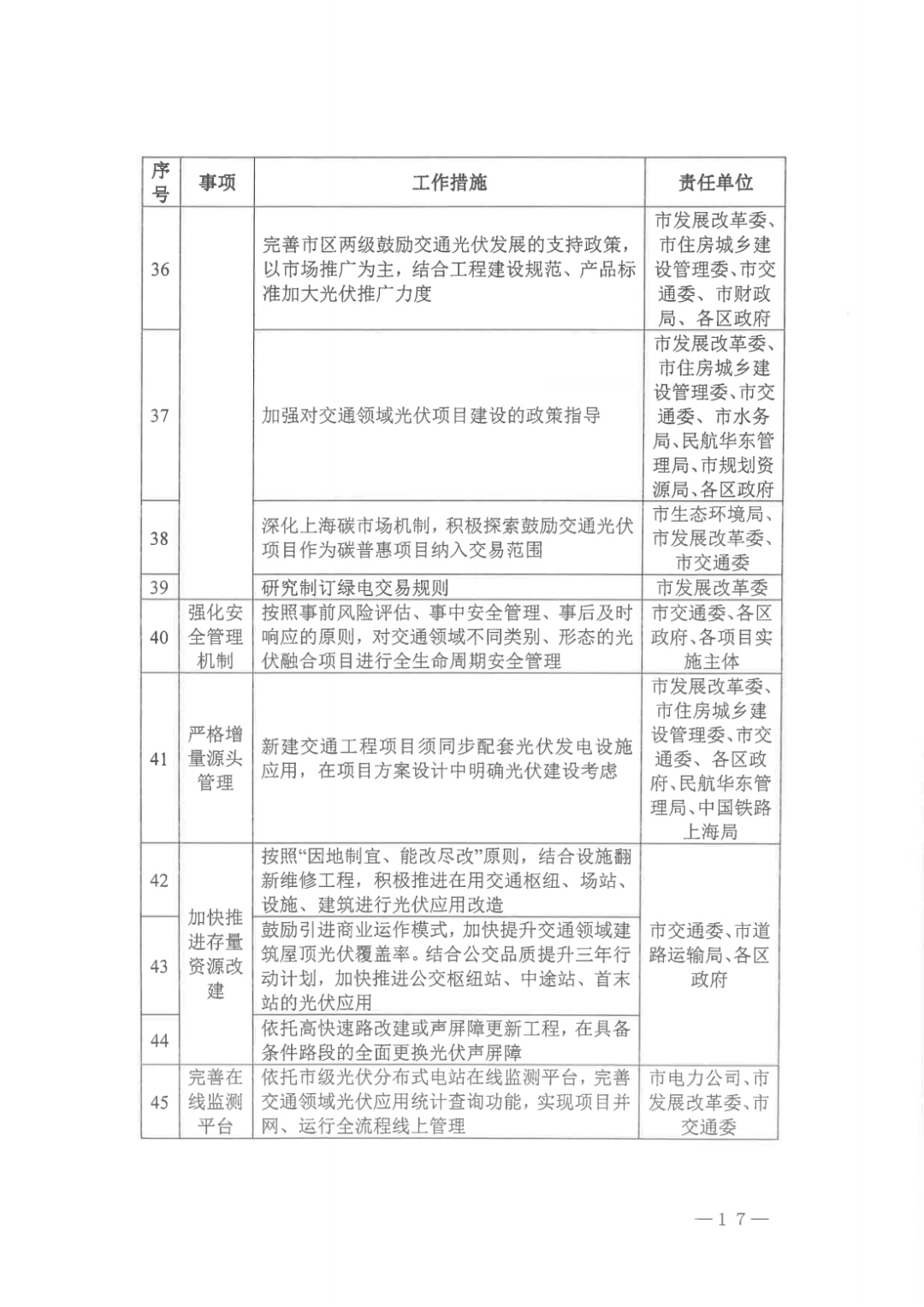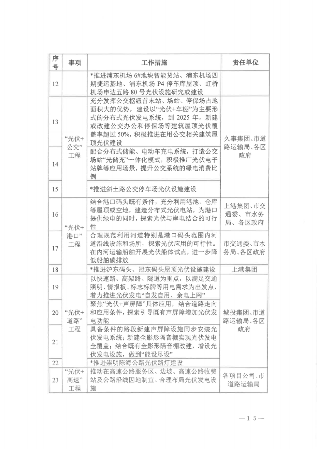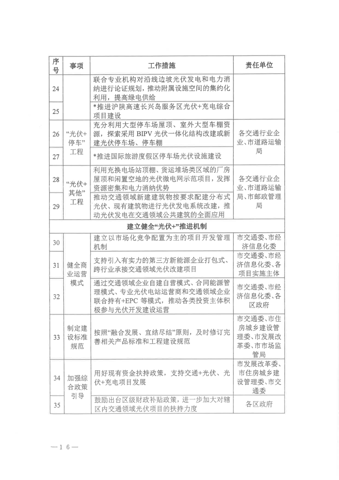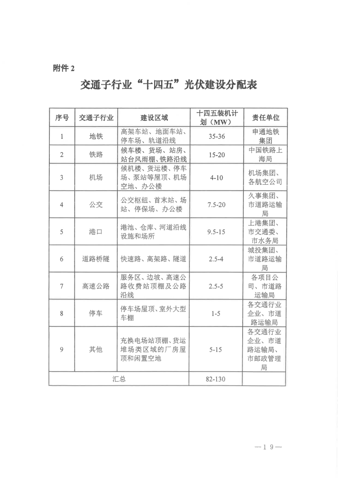 6月27日,上(shang)海(hai)市交(jiao)通委員會(hui)、上(shang)海(hai)市發改委聯合印發《上(shang)海(hai)交(jiao)通領域光伏(fu)推廣應用實施方案》 通知提出,推進(jin)實施“光伏+”示范工程。按(an)照高(gao)水平設計、高(gao)標(biao)準建設、高(gao)質量應(ying)(ying)用(yong)的原則,重點利用(yong)地(di)(di)鐵、機場、火(huo)車(che)站(zhan)(高(gao)鐵站(zhan))、港口、公交、橋隧、高(gao)速、停車(che)場等(deng)交通基礎(chu)設施(場地(di)(di))推進(jin)光伏應(ying)(ying)用(yong),結合交通領域場地(di)(di)資源,以(yi)面、連線、帶點,打(da)造一批(pi)綠色工程,形(xing)成示范效應(ying)(ying)。 近期(qi)目標:到(dao)2025年,應用場景實(shi)現(xian)(xian)多元化,全(quan)(quan)市交(jiao)(jiao)通領(ling)域(yu)新增光伏裝(zhuang)機(ji)(ji)容量(liang)(liang)確保達(da)到(dao)120MW,力爭達(da)到(dao)180MW(本方案口徑不含(han)物(wu)流倉儲領(ling)域(yu))。新建交(jiao)(jiao)通設施建筑屋頂安(an)裝(zhuang)光伏面積不低于50%,新建道(dao)路全(quan)(quan)影形隔音棚實(shi)現(xian)(xian)光伏全(quan)(quan)覆蓋。加快推進軌(gui)道(dao)交(jiao)(jiao)通、鐵路、機(ji)(ji)場、港(gang)口、公交(jiao)(jiao)、停(ting)車等場站區域(yu)以(yi)及高快速路、橋隧周邊光伏應用改擴建,交(jiao)(jiao)通場站光伏發電實(shi)現(xian)(xian)就(jiu)地(di)消納、余量(liang)(liang)上網(wang),交(jiao)(jiao)通能(neng)源(yuan)韌性(xing)和安(an)全(quan)(quan)性(xing)進一步(bu)提升。 遠期(qi)目標:到(dao)(dao)2035年,光伏在交(jiao)通(tong)各(ge)子領(ling)域得到(dao)(dao)全(quan)(quan)面推廣,交(jiao)通(tong)領(ling)域能源結構明顯優化,可再生能源在交(jiao)通(tong)行業(ye)內的(de)占比持續提升(sheng),與超大城市相適應(ying)的(de)清潔低碳安(an)全(quan)(quan)高效的(de)現代(dai)能源體(ti)系(xi)和新型電力系(xi)統加快構建,全(quan)(quan)市交(jiao)通(tong)領(ling)域光伏產(chan)業(ye)技術水平、創新能力進(jin)一步提升(sheng),推進(jin)機制、運作模(mo)式趨于完善,光伏、交(jiao)通(tong)進(jin)一步融合(he)協(xie)調發展。 原文如下: 上海市交通委員會、上海市發展和改革委員會 關于印發《上海交通領域光伏推廣應用實施方案》的通知 各有(you)關單位: 為推(tui)進本市交(jiao)通領域光伏(fu)發(fa)展,經研究,現制定《上海交(jiao)通領域光伏(fu)推(tui)廣應用實施方案》予以印發(fa),請認真遵(zun)照執(zhi)行。 特此通知。 上海市交通(tong)委(wei)員會 上海市發展和改(gai)革(ge)委(wei)員會 2023年6月15日 上海交通領域光伏推廣應用實施方案 為深(shen)入貫徹落實(shi)黨中央、國務院關于碳達(da)峰碳中和的重大(da)戰略決(jue)策,進一(yi)步促(cu)進能源(yuan)與經濟、社(she)會(hui)、環境(jing)的協調發(fa)展,加快推動我市(shi)(shi)(shi)交通(tong)領域能源(yuan)結構轉型,引導綠色低碳高質量(liang)發(fa)展,結合(he)《上(shang)(shang)海市(shi)(shi)(shi)碳達(da)峰實(shi)施(shi)(shi)(shi)方案(an)》《上(shang)(shang)海市(shi)(shi)(shi)能源(yuan)電力領域碳達(da)峰實(shi)施(shi)(shi)(shi)方案(an)》《上(shang)(shang)海市(shi)(shi)(shi)能源(yuan)發(fa)展“十(shi)四(si)五(wu)”規劃》和《上(shang)(shang)海市(shi)(shi)(shi)綜(zong)合(he)交通(tong)“十(shi)四(si)五(wu)”發(fa)展規劃》等文件精神,制定本實(shi)施(shi)(shi)(shi)方案(an)。 一、總體要求 (一(yi))指導(dao)思想。深入貫徹習近平生(sheng)態文明思想和黨的(de)(de)二十大(da)會議(yi)精神,全(quan)(quan)(quan)面落(luo)實國家“四個(ge)革命(ming)、一(yi)個(ge)合作(zuo)”能源安(an)全(quan)(quan)(quan)新戰略和“碳達峰碳中和”目標任務,深入踐行“人(ren)民(min)城市人(ren)民(min)建(jian),人(ren)民(min)城市為人(ren)民(min)”重要理念,以(yi)(yi)交(jiao)通發(fa)展和新能源深度融合理念為指引(yin),以(yi)(yi)優化交(jiao)通領(ling)域能源結(jie)構為目標,以(yi)(yi)場(chang)景拓(tuo)展示范(fan)引(yin)領(ling)為抓手,因地制宜,統籌協調(diao)推進光伏(fu)在交(jiao)通領(ling)域的(de)(de)全(quan)(quan)(quan)面發(fa)展,打造交(jiao)通領(ling)域特色應用場(chang)景,探(tan)索(suo)推廣商業模式,全(quan)(quan)(quan)面提升光伏(fu)滲透(tou)率(lv),加快打造與(yu)超(chao)大(da)城市相適應的(de)(de)安(an)全(quan)(quan)(quan)、清(qing)潔、高效、可持續的(de)(de)交(jiao)通能源體系,促進交(jiao)通與(yu)自(zi)然的(de)(de)和諧發(fa)展。 (二)基本原則 ——堅(jian)持政府(fu)引導、市場主體(ti)。加強政府(fu)統(tong)籌(chou)引導、政策扶持,聚焦協調交(jiao)通領域各行業(ye)資源(yuan),充分(fen)調動多元市場主體(ti)的積極性和效率優勢,營(ying)造良好環境,形成統(tong)籌(chou)有序、分(fen)工合理(li)的光伏應用推進(jin)機(ji)制。 ——堅持因(yin)地制(zhi)宜、融(rong)合(he)發(fa)展(zhan)。充分挖掘并(bing)用好(hao)交通領域資源稟(bing)賦(fu),結合(he)實(shi)(shi)際發(fa)展(zhan)需要(yao),因(yin)地制(zhi)宜推(tui)進(jin)各行業場地、場景(jing)合(he)理發(fa)展(zhan)光伏(fu),整(zheng)體謀劃(hua)、分步實(shi)(shi)施,按(an)照(zhao)先易后難(nan)、分期分批的(de)思路(lu),促進(jin)“光伏(fu)+”與交通的(de)融(rong)合(he)發(fa)展(zhan)。 ——堅持市區(qu)聯(lian)動、示范引領(ling)。強化(hua)部(bu)門協作、市區(qu)聯(lian)動,形成(cheng)推(tui)進(jin)合力。通過示范引領(ling),總結發展(zhan)規律(lv),探索發展(zhan)模式,明確發展(zhan)思路。既要(yao)抓好(hao)示范創建,樹(shu)立典