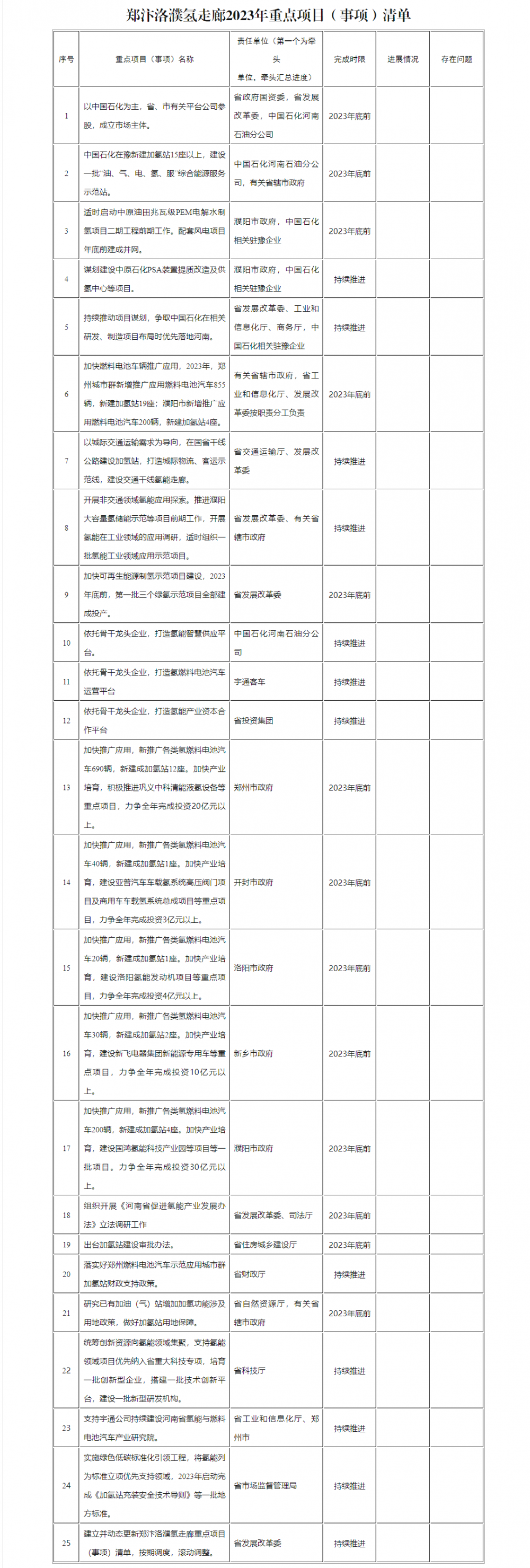 河南(nan)省(sheng)發展和改(gai)革委員會(hui)此前(qian)印發《鄭汴洛濮氫走廊規劃建(jian)設2023年(nian)20項(xiang)重(zhong)點工作清單》,公(gong)布20項(xiang)鄭汴洛濮氫走廊2023年(nian)重(zhong)點項(xiang)目。 文(wen)件指(zhi)出2023年(nian)(nian)(nian)是加(jia)快鄭汴洛濮氫(qing)走廊建設、推動河南(nan)省氫(qing)能(neng)產(chan)(chan)業發展(zhan)的(de)重(zhong)要一年(nian)(nian)(nian)。重(zhong)點推進落(luo)實以下事項:拓展(zhan)省與中國石(shi)化氫(qing)能(neng)領(ling)域合(he)作、強化應用(yong)場景示范引領(ling)作用(yong)、夯實產(chan)(chan)業支撐(cheng)節點、加(jia)強有(you)效制度供(gong)給。對鄭州(zhou)市(shi)(shi)、開封(feng)市(shi)(shi)、洛陽(yang)市(shi)(shi)、新鄉市(shi)(shi)、濮陽(yang)市(shi)(shi)提出了(le)具體的(de)發展(zhan)規劃,2023年(nian)(nian)(nian)將(jiang)推廣燃料電池汽車1055輛,建設23座加(jia)氫(qing)站,投資(zi)合(he)計67億元。 原文如下: 鄭汴洛濮氫走廊規劃建設2023年20項重點工作清單 2023年是加快鄭汴洛濮氫走廊(lang)建設(she)、推(tui)動(dong)全(quan)省(sheng)氫能產業(ye)發展的重要一年。為深入貫徹落實省(sheng)委、省(sheng)政(zheng)府換道領跑戰略(lve),加快構(gou)建良(liang)好氫能產業(ye)生(sheng)態(tai),推(tui)動(dong)氫能產業(ye)盡快成規模,重點(dian)推(tui)進落實以下事項: 一、拓展省與中國石化氫能領域合作 (一(yi))組建(jian)(jian)市場主體,統籌推動氫(qing)能相關基礎設施建(jian)(jian)設。以中國石化為主,省、市兩級有關平臺公(gong)司參股,成(cheng)立市場主體,統籌開展(zhan)氫(qing)氣制、儲(chu)、運(yun)、加(jia)(jia)等基礎設施全產業鏈相關投資(zi)、建(jian)(jian)設、運(yun)營、管理業務,推動拓展(zhan)應用場景、加(jia)(jia)快產業培(pei)育。(責任單位(wei):省政府國資(zi)委、省發展(zhan)改革委、中國石化河南石油分公(gong)司) (二)支持中國(guo)(guo)石化(hua)(hua)(hua)深度參與加(jia)(jia)氫(qing)(qing)基礎(chu)設(she)施(shi)建設(she)。結合車(che)輛推(tui)廣(guang)實(shi)際,按照適度超前(qian)的原(yuan)則,支持中國(guo)(guo)石化(hua)(hua)(hua)與有關(guan)省轄(xia)市(shi)深度合作,加(jia)(jia)快加(jia)(jia)氫(qing)(qing)站等(deng)加(jia)(jia)氫(qing)(qing)基礎(chu)設(she)施(shi)建設(she)。梳(shu)理形成(cheng)中國(guo)(guo)石化(hua)(hua)(hua)在豫2023年加(jia)(jia)氫(qing)(qing)站建設(she)計劃及擬選址(zhi)方案,抓緊啟動各項前(qian)期(qi)工作,力爭2023年新建加(jia)(jia)氫(qing)(qing)站15座以上。(責任單位:中國(guo)(guo)石化(hua)(hua)(hua)河南石油分公(gong)司,有關(guan)省轄(xia)市(shi)政(zheng)府) (三)推動已有加(jia)油(you)站改造(zao)。對現有符合(he)條件(jian)的加(jia)油(you)站增加(jia)加(jia)氫(qing)功能,建(jian)設(she)一(yi)批“油(you)、氣、電(dian)、氫(qing)、服(fu)”綜合(he)能源(yuan)服(fu)務示范站。(責任單位:中國(guo)石(shi)化河南石(shi)油(you)分公司,有關省轄市(shi)政(zheng)府) (四)加快(kuai)清潔氫(qing)源(yuan)示范(fan)項(xiang)目(mu)建(jian)設。支持中(zhong)原(yuan)油田兆(zhao)瓦級PEM電(dian)解水制氫(qing)項(xiang)目(mu)盡快(kuai)達產(chan),配套風電(dian)項(xiang)目(mu)2023年底前(qian)并網;適(shi)時(shi)啟動(dong)二期(qi)工程(cheng)前(qian)期(qi)工作,力爭取得中(zhong)原(yuan)油田1000標方/小時(shi)電(dian)解水制氫(qing)擴(kuo)能項(xiang)目(mu)可研批復。謀劃建(jian)設中(zhong)原(yuan)石化PSA裝置提質改造(zao)及供(gong)氫(qing)中(zhong)心。推動(dong)中(zhong)原(yuan)油田氫(qing)能產(chan)業研究院創新發展(zhan),開展(zhan)氫(qing)能源(yuan)和CCUS領域技術(shu)研發與應用。(責(ze)任單位(wei):濮陽市政府(fu),中(zhong)國石化駐(zhu)豫相(xiang)關企業) (五)持(chi)續(xu)推動(dong)項目謀劃。加(jia)(jia)強與(yu)中(zhong)國(guo)(guo)石化(hua)(hua)集團公司溝通銜接,爭取中(zhong)國(guo)(guo)石化(hua)(hua)在PEM制氫(qing)(qing)(qing)、儲(chu)氫(qing)(qing)(qing)碳纖維(wei)材料以(yi)及加(jia)(jia)氫(qing)(qing)(qing)系(xi)統(tong)裝備(bei)、制氫(qing)(qing)(qing)系(xi)統(tong)裝備(bei)、氫(qing)(qing)(qing)能(neng)(neng)智能(neng)(neng)管控與(yu)安(an)全系(xi)統(tong)產品(pin)等(deng)相(xiang)(xiang)關研發、制造(zao)項目布局(ju)時優先落地河南。支持(chi)中(zhong)國(guo)(guo)石化(hua)(hua)在新能(neng)(neng)源汽車(che)產業(ye)(ye)鏈、物流運輸等(deng)領域合作伙伴在豫(yu)布局(ju)。支持(chi)中(zhong)國(guo)(guo)石化(hua)(hua)發揮技術優勢,積極(ji)參與(yu)氫(qing)(qing)(qing)能(neng)(neng)相(xiang)(xiang)關標準(zhun)規范(fan)制定。(責任單位(wei):省(sheng)發展改革委、工業(ye)(ye)和信息化(hua)(hua)廳、商務廳、市場監督管理局(ju),中(zhong)國(guo)(guo)石化(hua)(hua)駐豫(yu)相(xiang)(xiang)關企業(ye)(ye)) 二、強化應用場景示范引領作用 (六(liu))全力推(tui)(tui)動(dong)燃料電(dian)(dian)池(chi)(chi)汽車(che)示(shi)范應用(yong)(yong)。加(jia)快燃料電(dian)(dian)池(chi)(chi)車(che)輛推(tui)(tui)廣應用(yong)(yong),2023年,鄭州城市(shi)(shi)群新(xin)增推(tui)(tui)廣應用(yong)(yong)燃料電(dian)(dian)池(chi)(chi)汽車(che)855輛,新(xin)建(jian)加(jia)氫(qing)站19座(zuo);濮陽市(shi)(shi)新(xin)增推(tui)(tui)廣應用(yong)(yong)燃料電(dian)(dian)池(chi)(chi)汽車(che)200輛,新(xin)建(jian)加(jia)氫(qing)站4座(zuo)。(責任單位(wei):有關省(sheng)轄市(shi)(shi)政府,省(sheng)工業和信息化廳、發展(zhan)改革委按職責分工負責) (七)打(da)造高(gao)速氫走廊示范