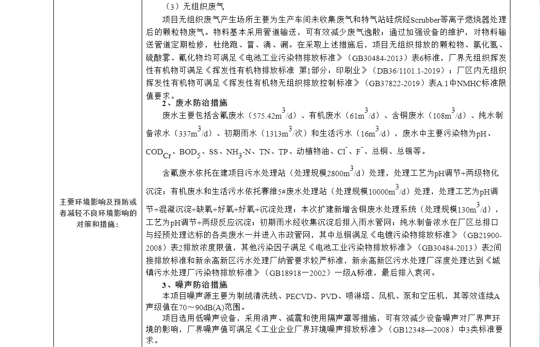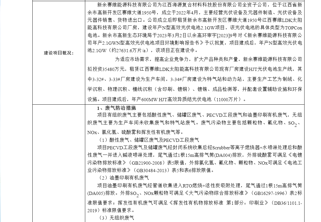 7月28日,江西省生態環境廳發布新余賽維能源年產600MW HJT高效異質結光伏電池生產線項目環境影響報告書的擬批準公示,該項目建設地點位于江西省新余市高新區賽維大道1950號,建設單位為新余賽維能源科技有限公司。 資料顯示,新余賽維能源科技有限公司為江西海源復合材料科技股份有限公司全資子公司,位于江西省新余市高新開發區賽維大道1950號,成立于2022年4月,主要經營光伏設備及元器件制造、光伏設備及元器件銷售、貨物進出口。 公司成立后即租賃新余市高新開發區賽維大道1950號江西賽維LDK太陽能高科技有限公司廠房,建設年產N型高效光伏電池2.1GW項目,該光伏電池的具體類型為TOPCon電池。新余市高新生態環境局于2023年3月2日以余高環審字[2023]9號對《新余賽維能源科技有限公司年產2.1GWN型高效光伏電池項目環境影響報告書》予以批復,項目建成后,年產N型高效光伏電池2.1GW(約27631.6萬片/a),該項目正在建設中。 為適應市場需求,提高企業競爭力,擴大產品種類和產量,新余賽維能源科技有限公司擬投資35480萬元,租賃江西賽維LDK太陽能高科技有限公司現有廠房建設HJT光伏電池生產線,其中3-32#、3-33#廠房建設為生產車間,3-34#廠房建設為特氣站和動力站,主要生產工藝為制絨、化學沉積、物理沉積、柵線沉積(含印刷、鍍銅)、鍍錫、成品檢測等,并配套設置輔助設施和環保設施。項目建成后,年產600MW HJT高效異質結光伏電池(11000萬片)。 項目概況如下(放大圖片查看):