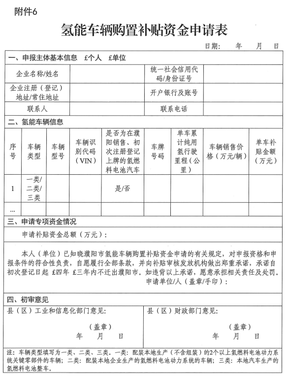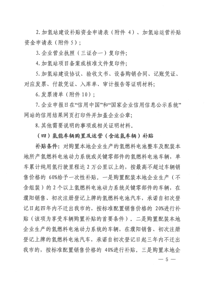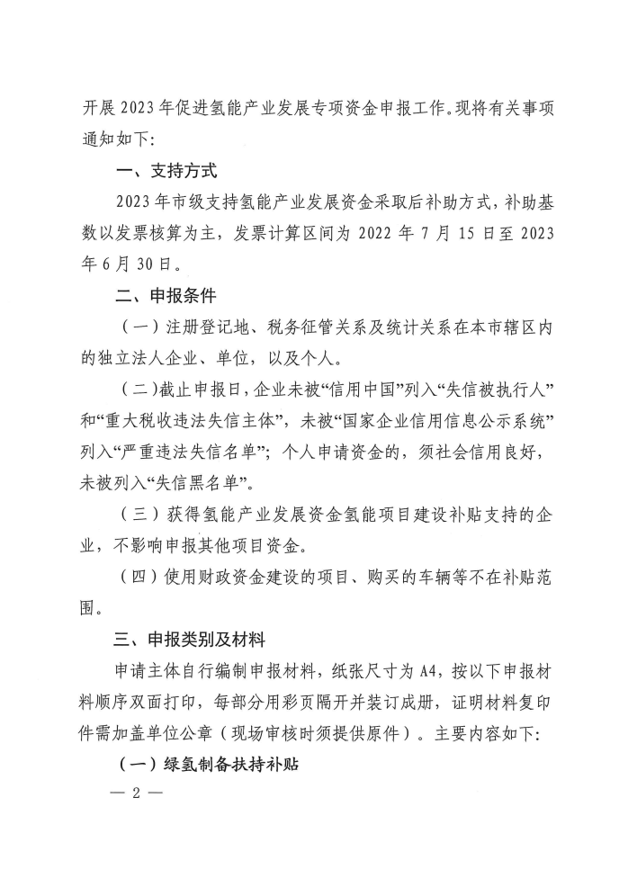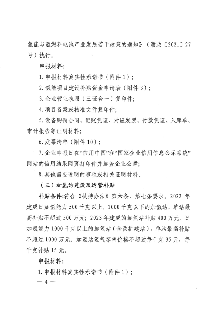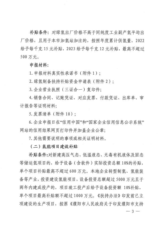 8月3日,河南濮陽(yang)市(shi)工(gong)信局、財政局聯(lian)(lian)合發(fa)布(bu)《關于開展(zhan)2023年(nian)促進氫能產業(ye)發(fa)展(zhan)專項(xiang)資金申(shen)報工(gong)作的通(tong)知》。文件指出(chu),其中(zhong)綠(lv)氫制備方面,對出(chu)廠價(jia)格不(bu)高(gao)于同純度工(gong)業(ye)副產氫平均(jun)出(chu)廠價(jia)格,且用于本(ben)市(shi)加氫站的,2022給(gei)(gei)予(yu)每千(qian)克15元(yuan)補貼,2023給(gei)(gei)予(yu)每千(qian)克12元(yuan)補貼,最高(gao)不(bu)超過(guo)(guo)500萬元(yuan)。氫能熱(re)電聯(lian)(lian)供(gong)設施(shi)建(jian)設等項(xiang)目根據裝機量(liang),按每千(qian)瓦600元(yuan)的標準給(gei)(gei)予(yu)一次性補貼,單個項(xiang)目最高(gao)不(bu)超過(guo)(guo)200萬元(yuan)。 氫(qing)能項(xiang)(xiang)目(mu)(mu)(mu)方面:對新建儲運氫(qing)項(xiang)(xiang)目(mu)(mu)(mu),給予設備(bei)實際投資總額10%補(bu)貼(tie),單個項(xiang)(xiang)目(mu)(mu)(mu)補(bu)貼(tie)最高不(bu)超過(guo)(guo)600萬(wan)元。本地企業轉(zhuan)型制氫(qing)、氫(qing)能裝(zhuang)備(bei)等(deng)產業,設備(bei)投資總額超過(guo)(guo)5000萬(wan)元且于兩年內建成投產的,給予設備(bei)投資額10%補(bu)貼(tie),單個項(xiang)(xiang)目(mu)(mu)(mu)最高補(bu)貼(tie)額不(bu)超過(guo)(guo)1000萬(wan)元。 2022年建成日(ri)加(jia)氫(qing)能(neng)(neng)力500千(qian)(qian)克(ke)以上,1000千(qian)(qian)克(ke)以下的加(jia)氫(qing)站(zhan),單站(zhan)最高(gao)補貼不超過(guo)500萬(wan)元(yuan);2023年建成的加(jia)氫(qing)站(zhan)補貼400萬(wan)元(yuan)。日(ri)加(jia)氫(qing)能(neng)(neng)力1000千(qian)(qian)克(ke)以上的加(jia)氫(qing)站(zhan)(含改(gai)擴建站(zhan)),單站(zhan)最高(gao)補貼不超過(guo)1000萬(wan)元(yuan)。加(jia)氫(qing)站(zhan)氫(qing)氣零售價格(ge)不超過(guo)每千(qian)(qian)克(ke)35元(yuan),每千(qian)(qian)克(ke)補貼15元(yuan)。 濮(pu)陽(yang)市工業和(he)信(xin)息化(hua)局(ju) 濮(pu)陽(yang)市財(cai)政局(ju) 關于(yu)開展2023年(nian)促進氫能產業發(fa)展專項資金 申報工作的通知 各縣(區)工業(ye)和信息(xi)化(hua)主管部門,財政局: 為(wei)切(qie)實(shi)推進我市(shi)(shi)氫能(neng)產(chan)(chan)業加快發(fa)(fa)(fa)展(zhan)(zhan)(zhan),有效發(fa)(fa)(fa)揮財(cai)政專(zhuan)項資(zi)金引導作用,根據《濮陽(yang)市(shi)(shi)人民政府關(guan)于(yu)印發(fa)(fa)(fa)濮陽(yang)市(shi)(shi)促進氫能(neng)產(chan)(chan)業發(fa)(fa)(fa)展(zhan)(zhan)(zhan)扶持(chi)辦(ban)法的通知(zhi)》(濮政〔2022〕15號,以下簡稱《扶持(chi)辦(ban)法》),結合工(gong)作實(shi)際,市(shi)(shi)工(gong)業和信息化局(ju)、市(shi)(shi)財(cai)政局(ju)組織各地開展(zhan)(zhan)(zhan)2023年促進氫能(neng)產(chan)(chan)業發(fa)(fa)(fa)展(zhan)(zhan)(zhan)專(zhuan)項資(zi)金申報工(gong)作。現將有關(guan)事(shi)項通知(zhi)如下: 一、支持方式 2023年市級(ji)支持氫能產業發(fa)展資金(jin)采取后補(bu)(bu)助(zhu)方式,補(bu)(bu)助(zhu)基(ji)數以發(fa)票核算(suan)(suan)為主,發(fa)票計算(suan)(suan)區間為2022年7月15日(ri)至2023年6月30日(ri)。 二、申報條件 (一(yi))注(zhu)冊(ce)登記地、稅(shui)務征管關(guan)系及統計(ji)關(guan)系在本(ben)市(shi)轄區(qu)內的獨立法人(ren)企業、單位(wei),以(yi)及個(ge)人(ren)。 (二)截止(zhi)申報日,企業(ye)未(wei)被“信用中國”列(lie)入(ru)“失信被執(zhi)行人”和“重(zhong)(zhong)大(da)稅收違(wei)法失信主體”,未(wei)被“國家企業(ye)信用信息公(gong)示系統”列(lie)入(ru)“嚴重(zhong)(zhong)違(wei)法失信名單”;個(ge)人申請資金(jin)的,須社會信用良好,未(wei)被列(lie)入(ru)“失信黑名單”。 (三)獲得氫能產業發展資(zi)金(jin)(jin)氫能項(xiang)目建設補(bu)貼(tie)支持的企(qi)業,不影響申(shen)報其他項(xiang)目資(zi)金(jin)(jin)。 (四)使用財政(zheng)資金建設的(de)項目(mu)、購(gou)買(mai)的(de)車輛等不在補貼(tie)范圍。 三、申報類別及材料 申(shen)請主(zhu)體(ti)自行編制(zhi)申(shen)報材料(liao)(liao),紙張(zhang)尺寸為A4,按以下申(shen)報材料(liao)(liao)順序雙面打印,每部分用彩頁隔開(kai)并裝訂(ding)成冊,證明材料(liao)(liao)復印件需(xu)加蓋單位公(gong)章(現場審核時須提(ti)供原件)。主(zhu)要內容如下: (一)綠氫制備(bei)扶持補貼 補貼(tie)條件:對綠氫出廠(chang)價(jia)格不(bu)高于(yu)同(tong)純度工(gong)業(ye)副產(chan)氫平均出廠(chang)價(jia)格,且用(yong)于(yu)本市(shi)加氫站加注的(de),按照年度累計供氫量,2022給予(yu)每(mei)千(qian)克15元(yuan)(yuan)補貼(tie),2023給予(yu)每(mei)千(qian)克12元(yuan)(yuan)補貼(tie),最高不(bu)超(chao)過500萬元(yuan)(yuan)。 申報材料: 1.申報材料真實(shi)性(xing)承(cheng)諾書(附(fu)件1); 2.綠氫(qing)制備扶持(chi)補貼(tie)資金申請表(biao)(附件2); 3.企業(ye)(ye)營業(ye)(ye)執照(三證合一)復印件; 4.銷售合同、記賬憑(ping)證(zheng)、對應發票、付款憑(ping)證(zheng)、出庫單、審計報(bao)告等證(zheng)明材料; 5.發票(piao)清單(附件10); 6.企業申報(bao)日在“信用(yong)(yong)中國”和(he)“國家企業信用(yong)(yong)信息公示系統”網站的信用(yong)(yong)結果(guo)網頁打印件并加蓋(gai)企業公章; 7.其他需要說(shuo)明(ming)的事項或相關證明(ming)材(cai)料。 (二)氫能項(xiang)目(mu)建設補貼 補(bu)(bu)貼(tie)(tie)條件:對新(xin)建高(gao)壓(ya)氣態(tai)、低(di)溫液態(tai)、無毒有機液體及固態(tai)等(deng)(deng)儲(chu)運氫(qing)(qing)項目(mu)的,給予(yu)設(she)(she)備(bei)(bei)(bei)